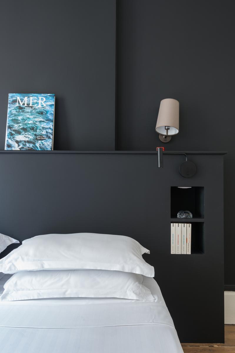 En allant à droite à l’entrée, vous trouverez un couloir bordé de briques nues. La salle de bains en carrelage blanc est à droite, et il y a un soupçon de rose dans la troisième chambre à coucher, à gauche. À côté, la deuxième chambre à coucher (avec un lit simple) est encore plus rose, et il y a un lit queen-size et un mur gris audacieux dans la chambre principale, au-delà. Au bout du couloir, la salle d’eau a des carreaux d’accent géométrique.