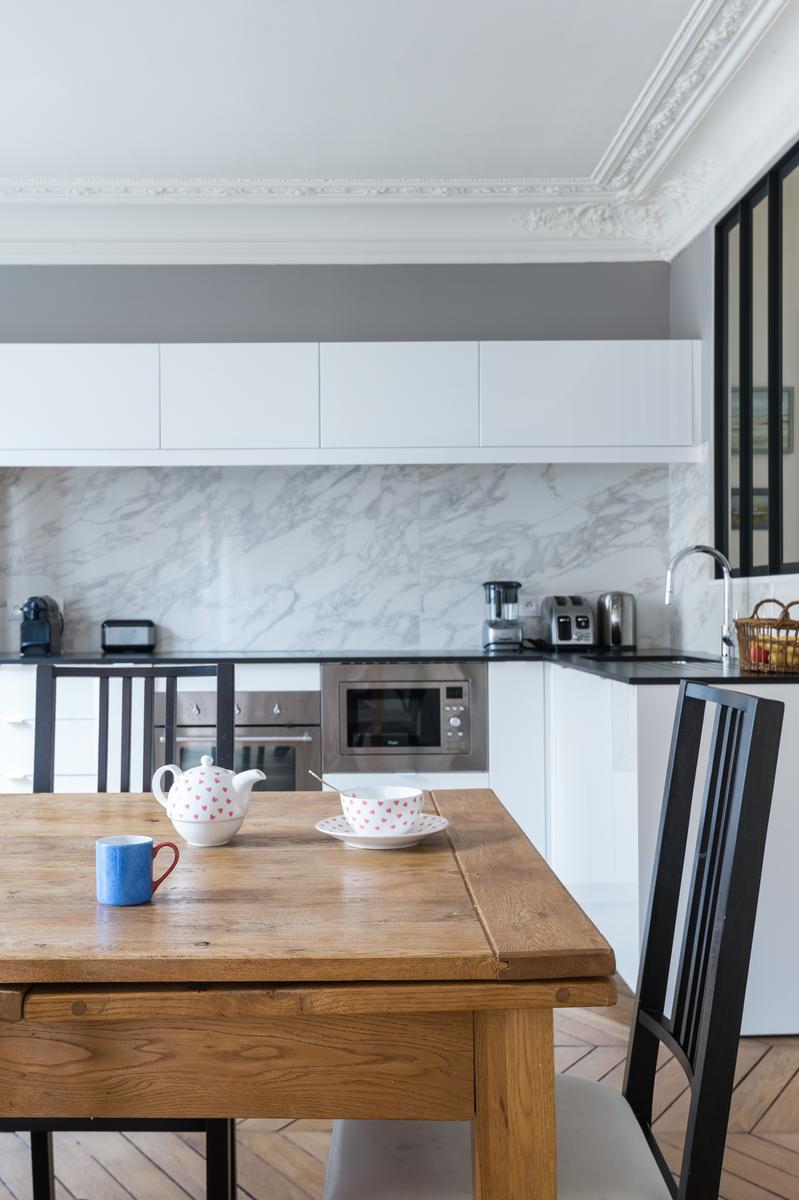 Dans un grand bâtiment haussmannien, la rue Bayre va de l’ancien au nouveau et vice versa. En entrant dans la cuisine, vous trouverez du cornique d’époque au plafond et un parquet contemporain. Huit personnes peuvent s’asseoir à la table à manger – en face d’un grand dosseret en marbre – et à gauche, il y a des meubles traditionnels et une bibliothèque moderne dans le salon. Une rangée de portes-fenêtres donne sur des balustrades en fer forgé, tandis que les deux canapés en velours rouge attirent aussi l’attention.
