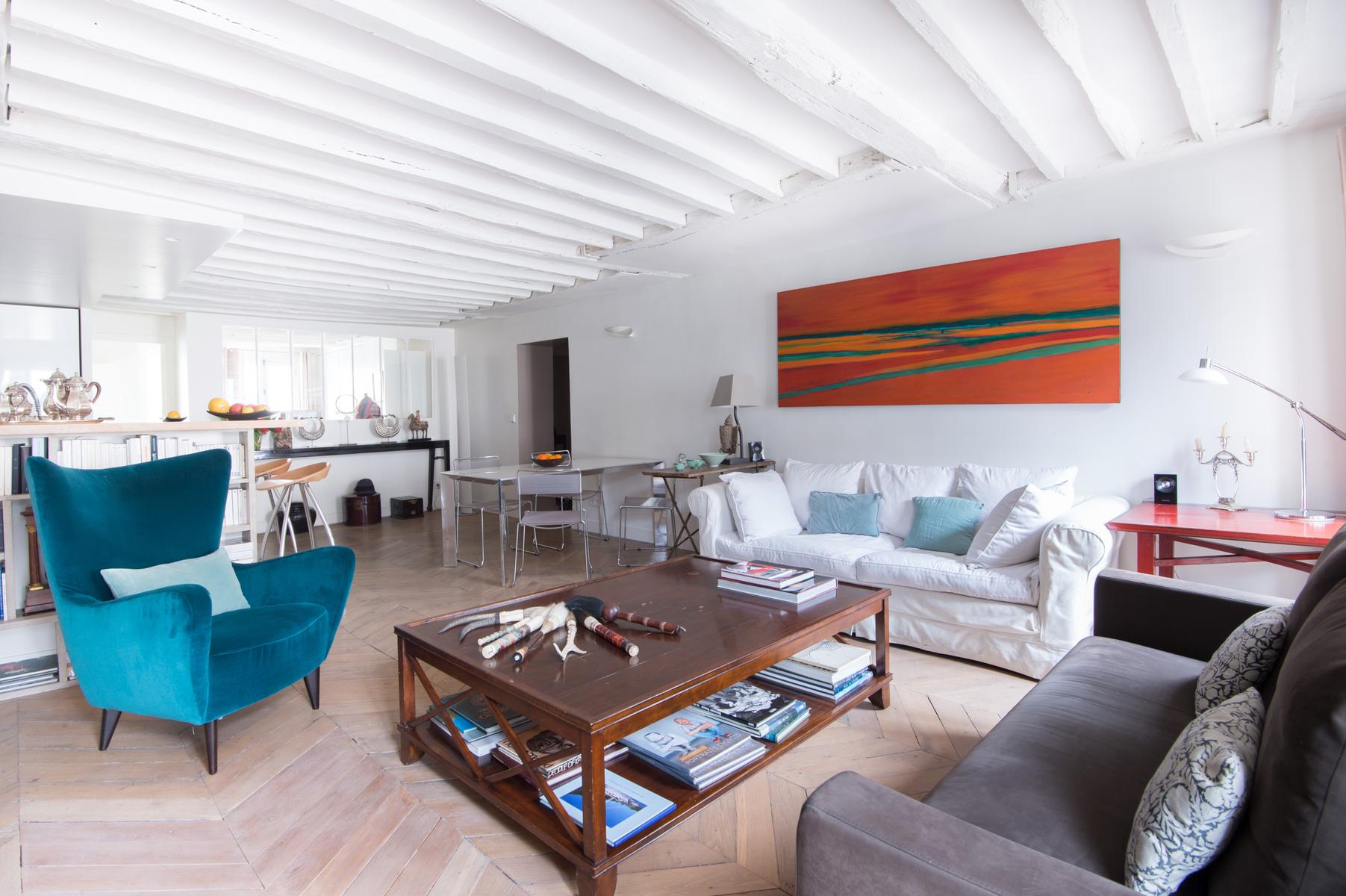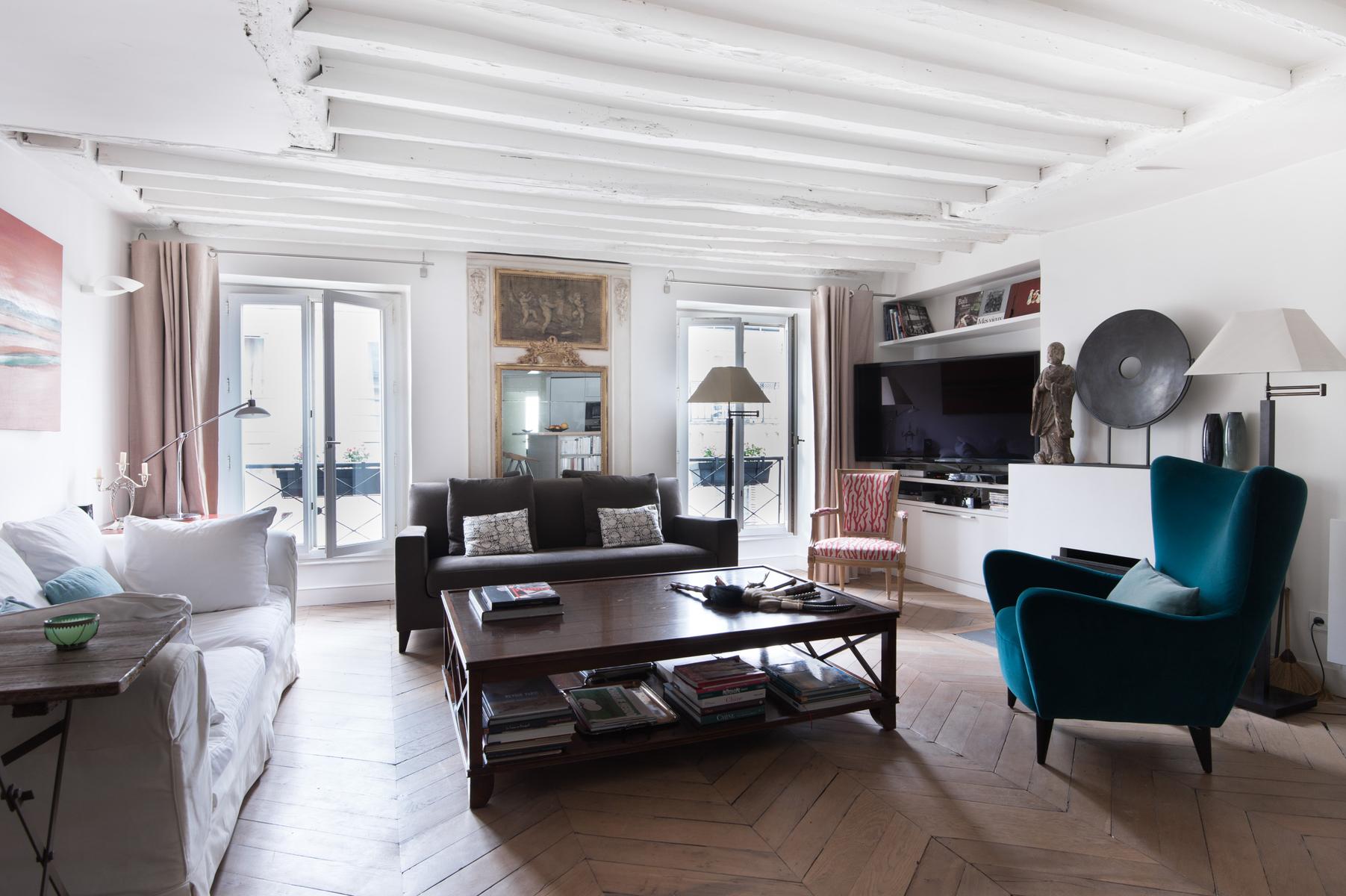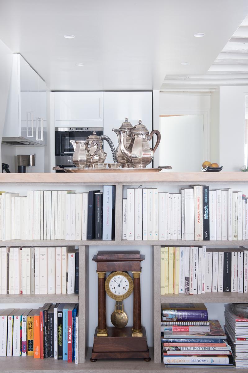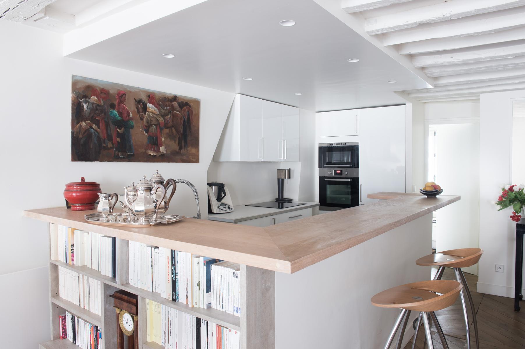 Au cœur de l’Opéra – Grands magasins, la rue Bergère II montre encore ses racines à colombages. Le court couloir d’entrée s’ouvre immédiatement sur le salon, avec un parquet décapé d’origine et des poutres en bois blanchi, et un fauteuil bleu audacieux et un coucher de soleil ponctuent la palette neutre de la pièce. Ici aussi, la cuisine, un espace contemporain séparé de l’espace de vie par un bar à petit-déjeuner élégant avec étagères intégrées.