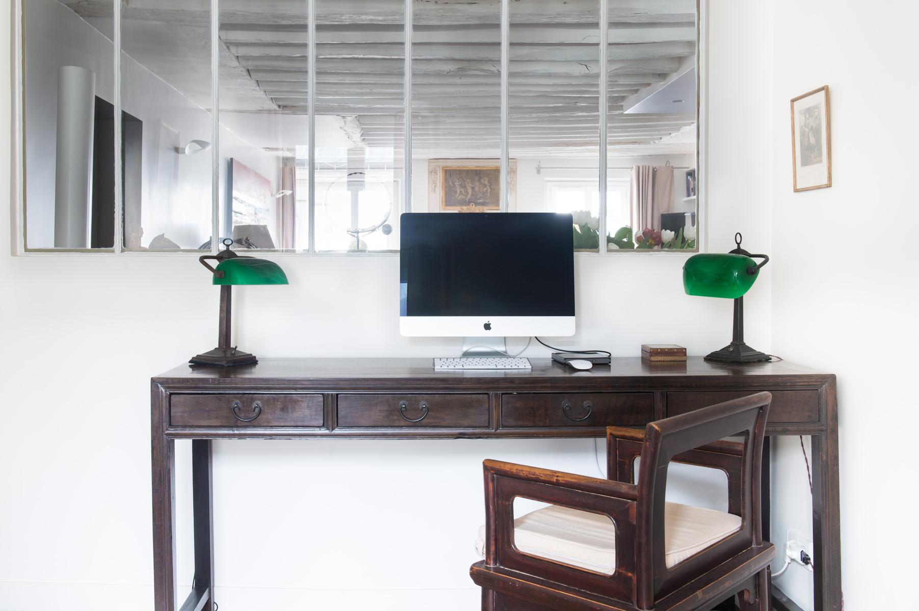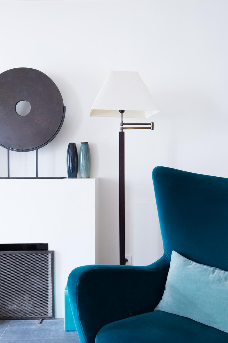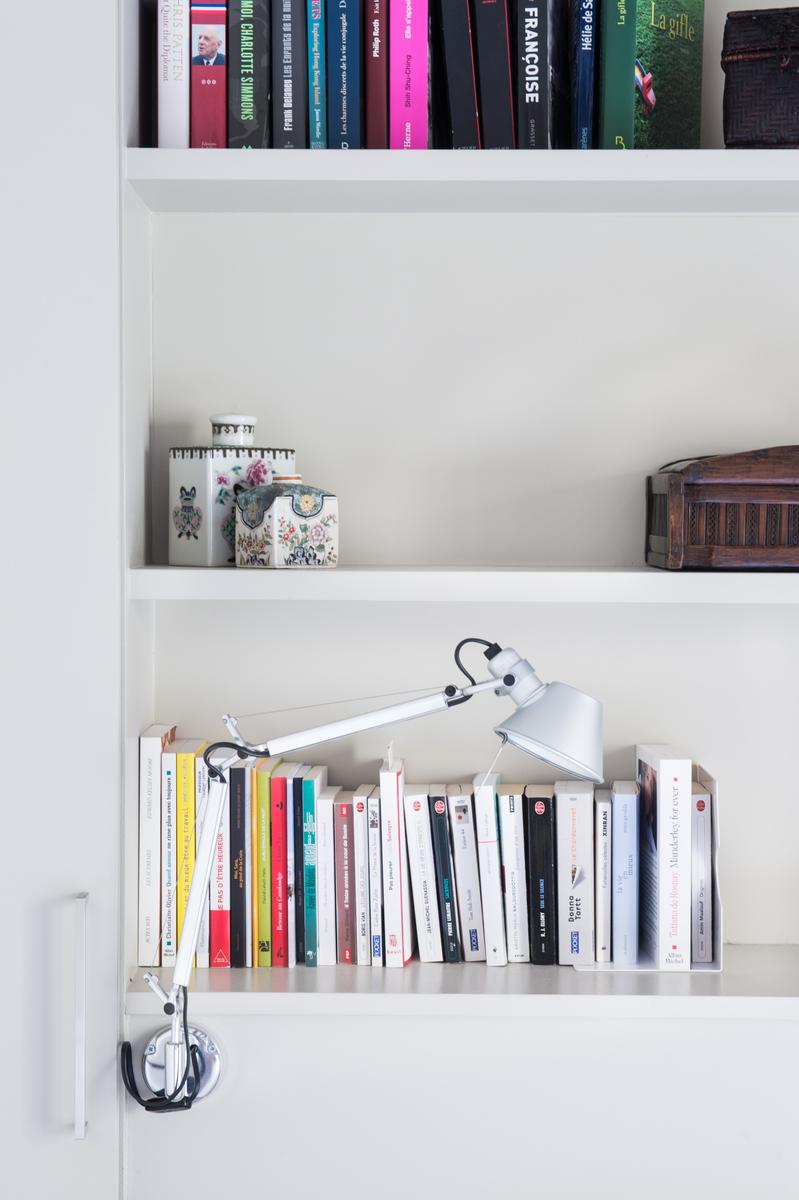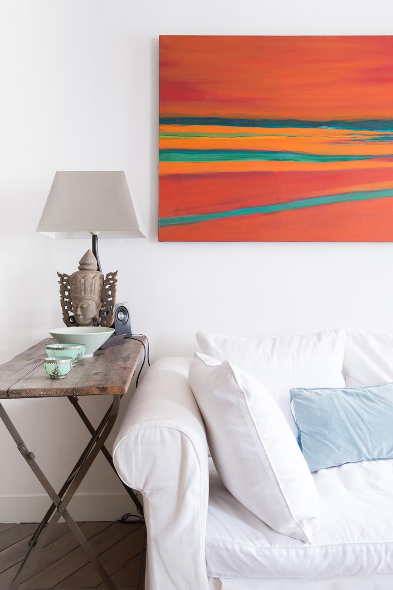 Au cœur de l’Opéra – Grands magasins, la rue Bergère II montre encore ses racines à colombages. Le court couloir d’entrée s’ouvre immédiatement sur le salon, avec un parquet décapé d’origine et des poutres en bois blanchi, et un fauteuil bleu audacieux et un coucher de soleil ponctuent la palette neutre de la pièce. Ici aussi, la cuisine, un espace contemporain séparé de l’espace de vie par un bar à petit-déjeuner élégant avec étagères intégrées.