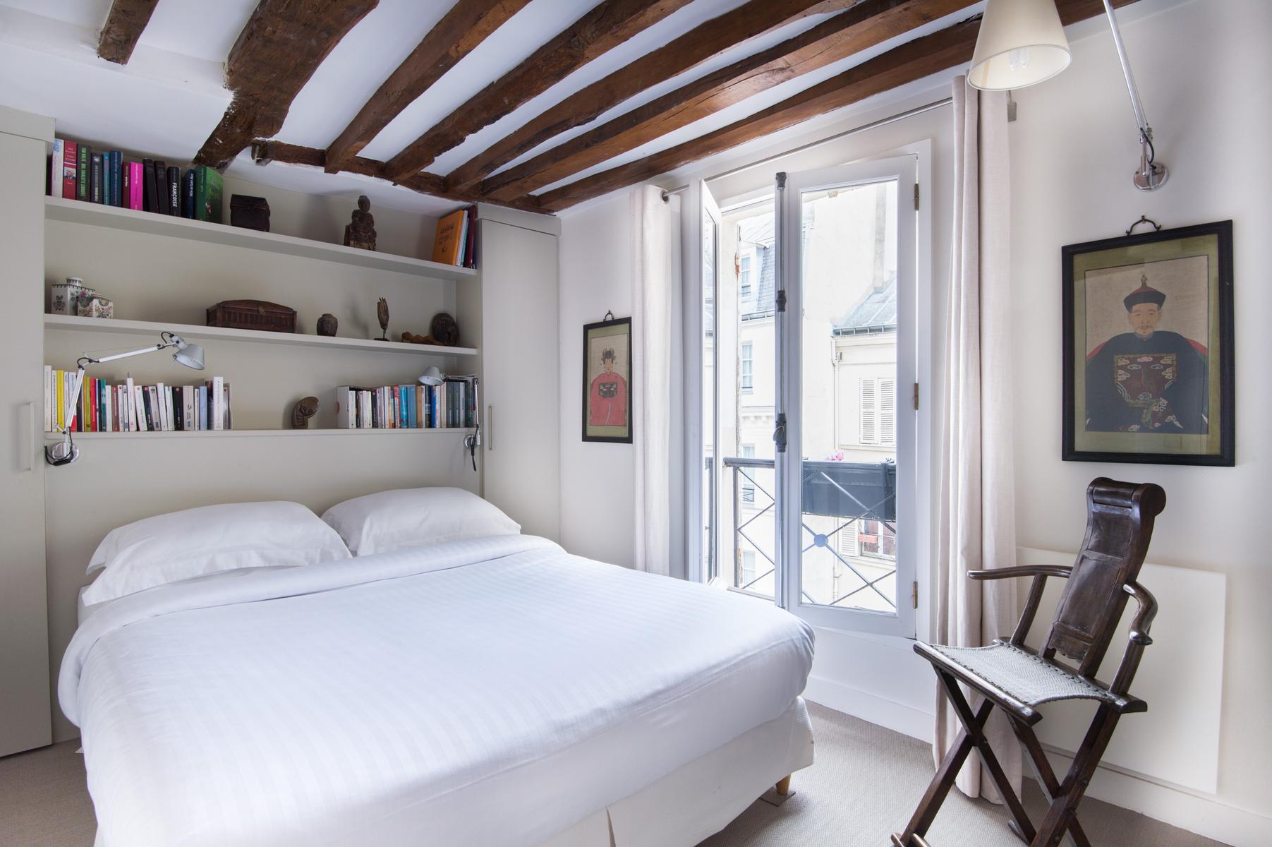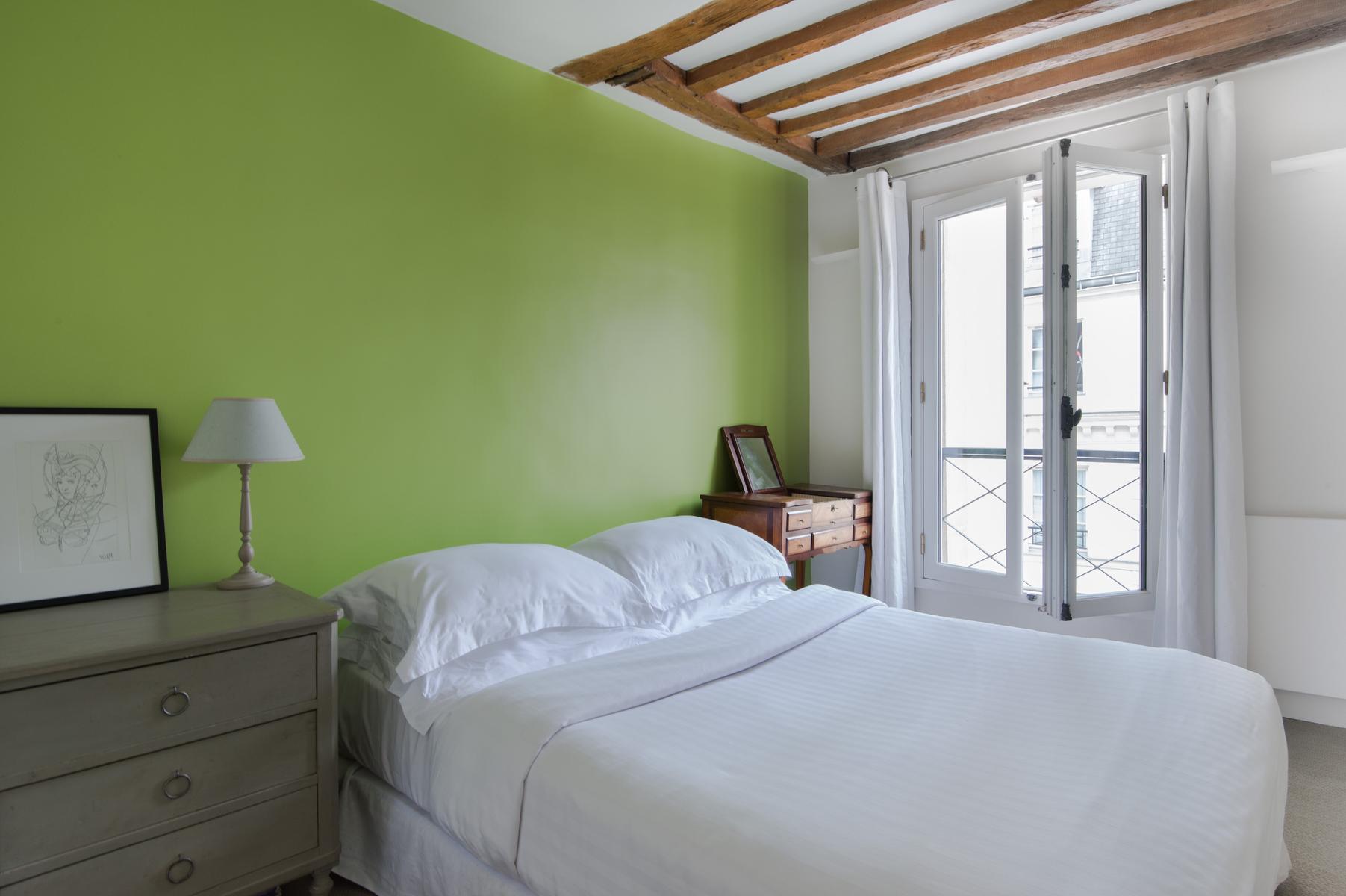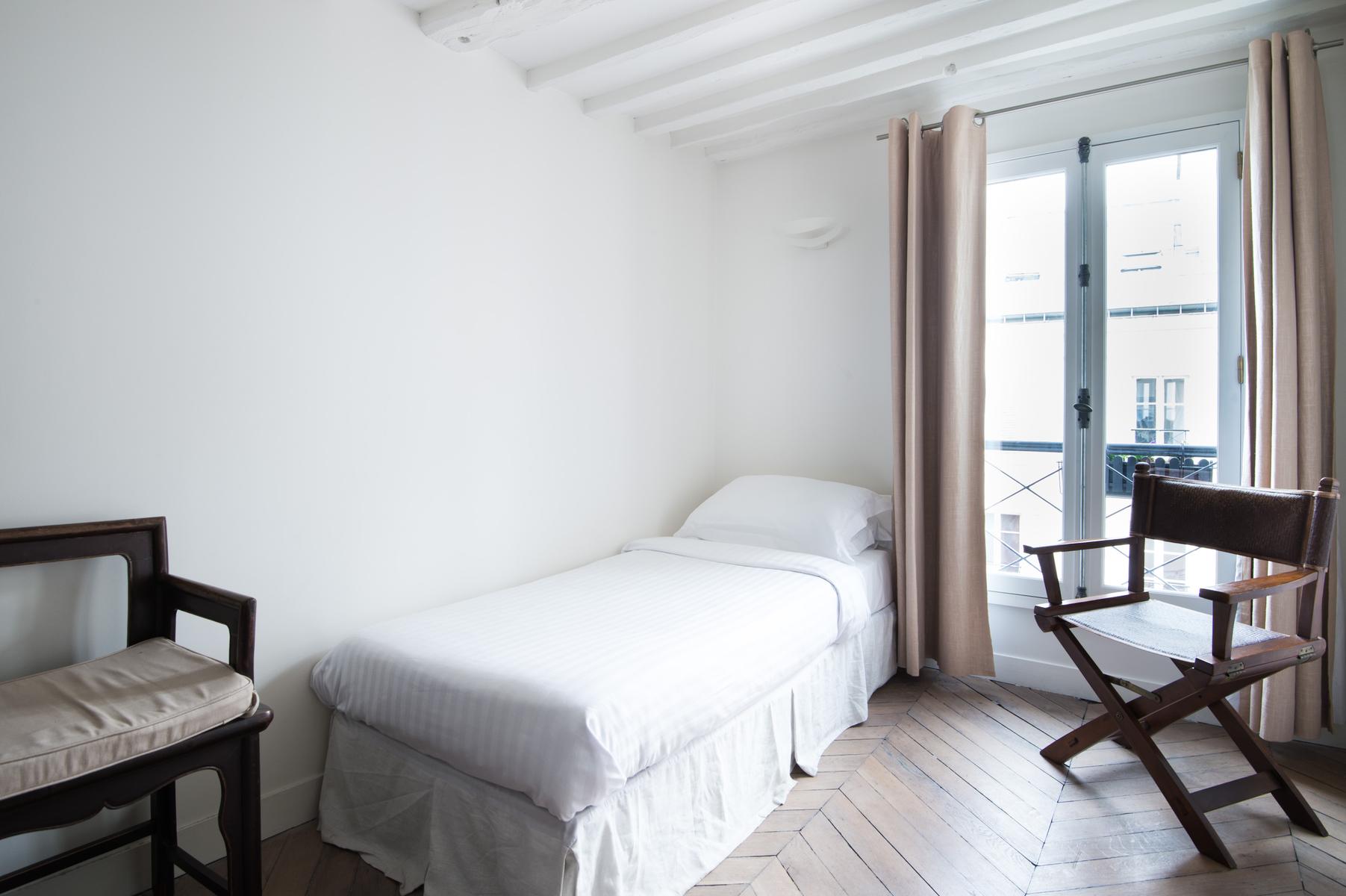 En face de l’espace de vie se trouvent trois chambres à coucher qui donnent sur une cour tranquille par des portes-fenêtres et des balcons Juliette. Tout d’abord, la chambre des maîtres – des poutres d’acajou courent le long du plafond sur un lit queen-size. Dans la deuxième chambre, plus loin, il y a un lit double et un mur vert citron vert. Il y a un lit simple dans la troisième chambre à coucher avec parquet. En face de la chambre principale se trouve la salle de bain avec des carreaux gris ardoise et des murs miroirs.