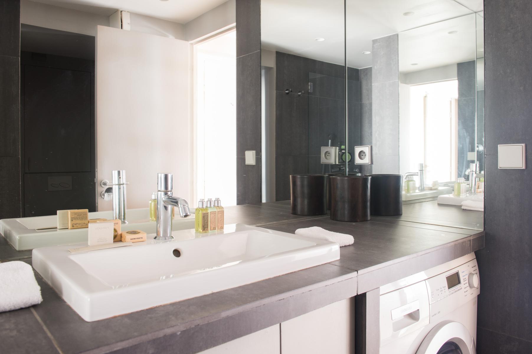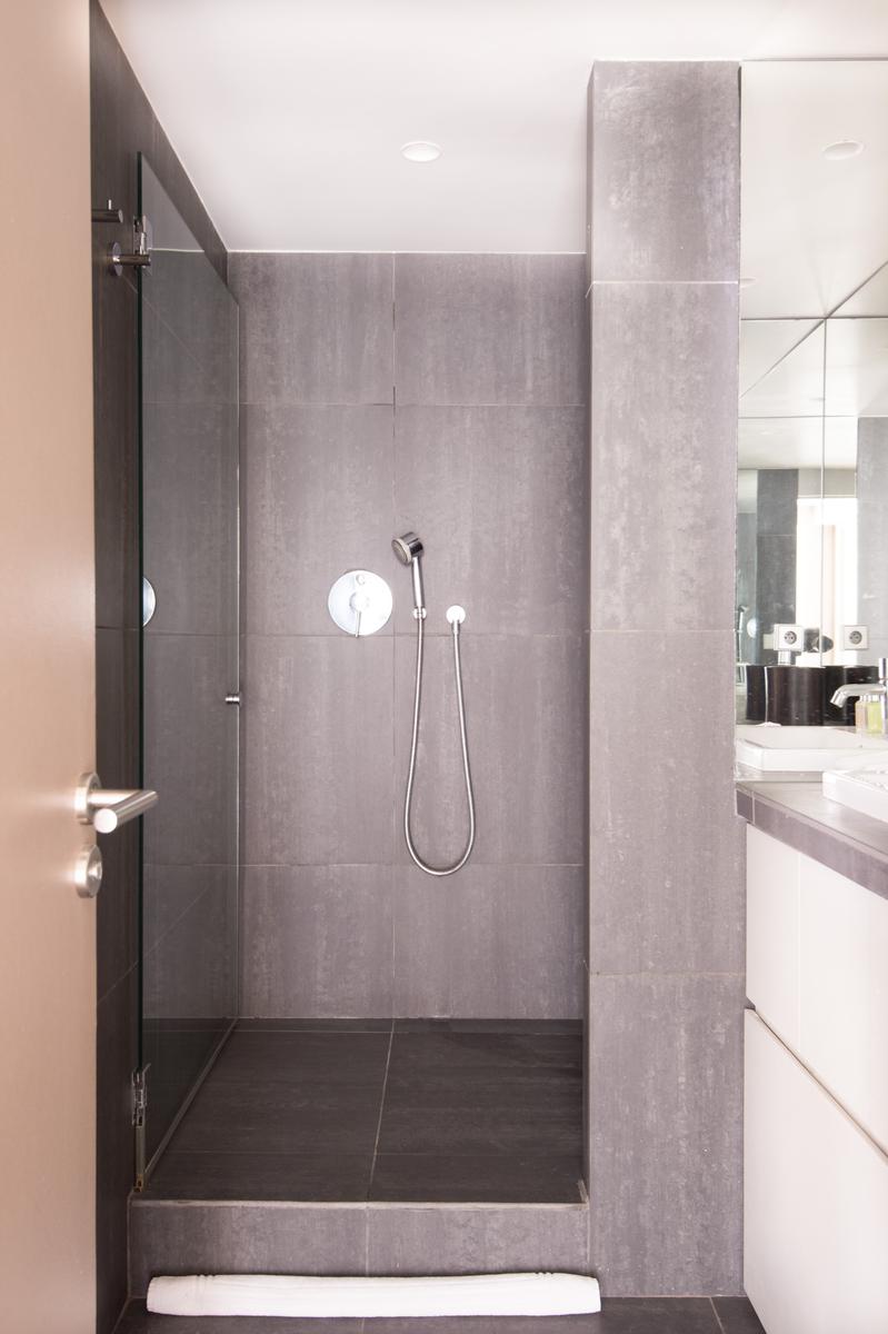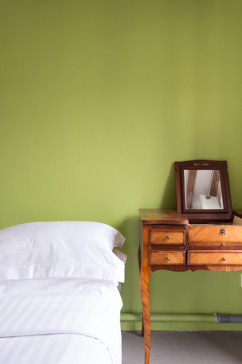 En face de l’espace de vie se trouvent trois chambres à coucher qui donnent sur une cour tranquille par des portes-fenêtres et des balcons Juliette. Tout d’abord, la chambre des maîtres – des poutres d’acajou courent le long du plafond sur un lit queen-size. Dans la deuxième chambre, plus loin, il y a un lit double et un mur vert citron vert. Il y a un lit simple dans la troisième chambre à coucher avec parquet. En face de la chambre principale se trouve la salle de bain avec des carreaux gris ardoise et des murs miroirs.