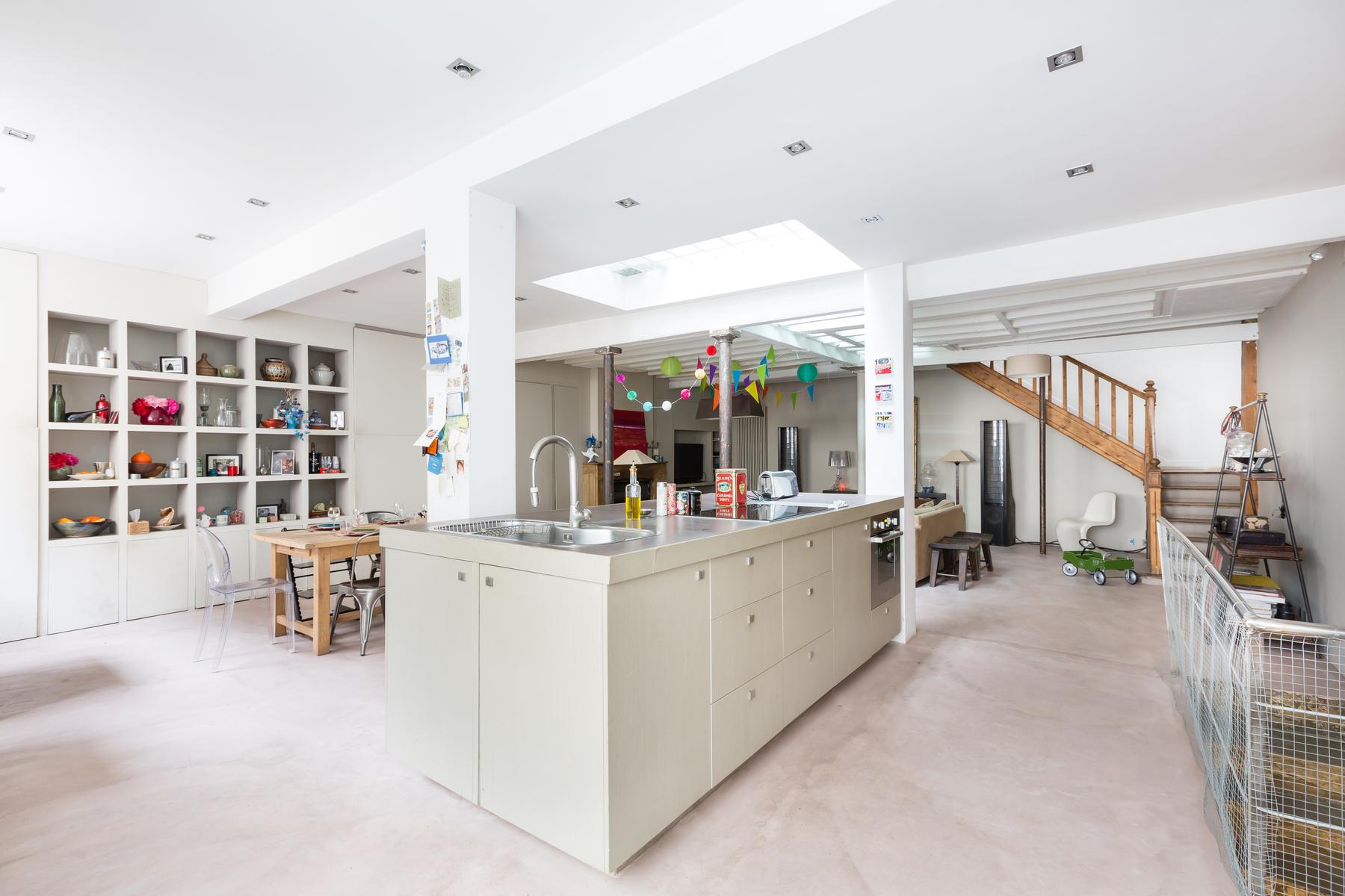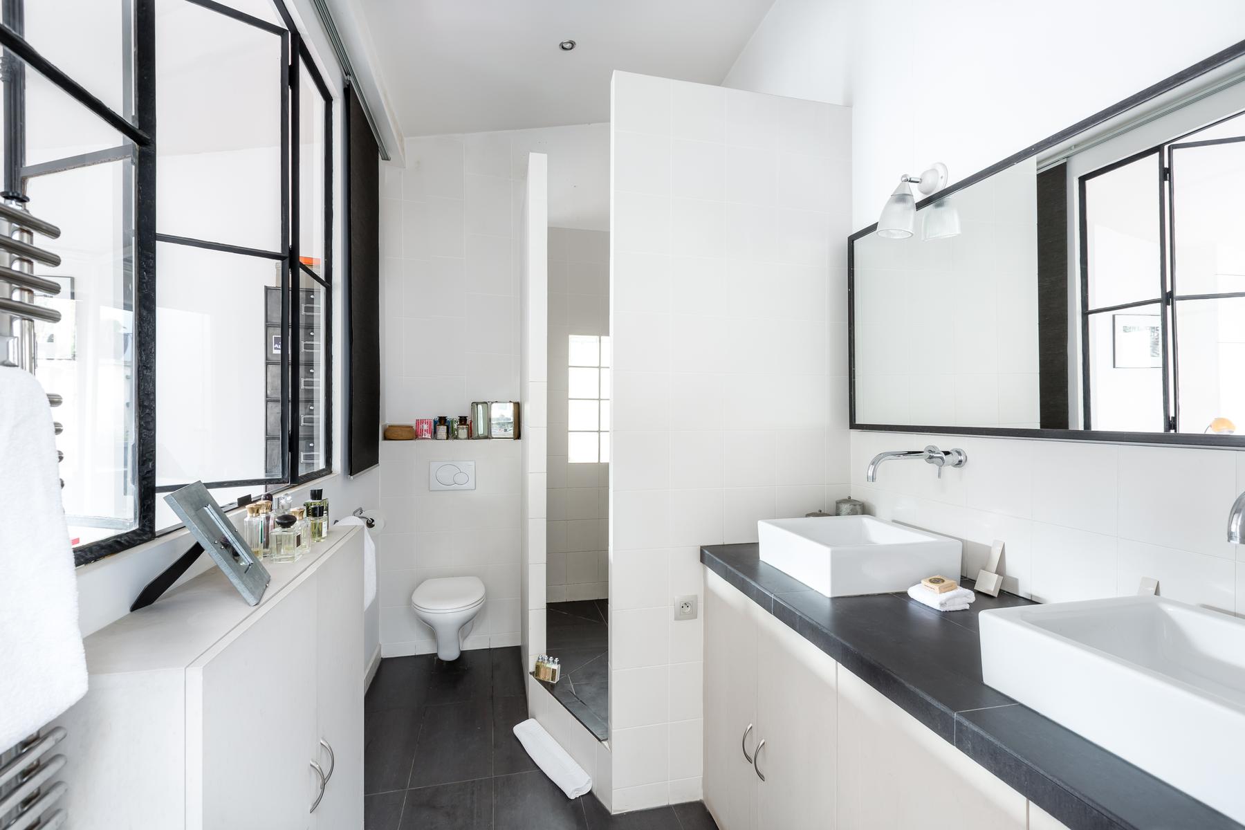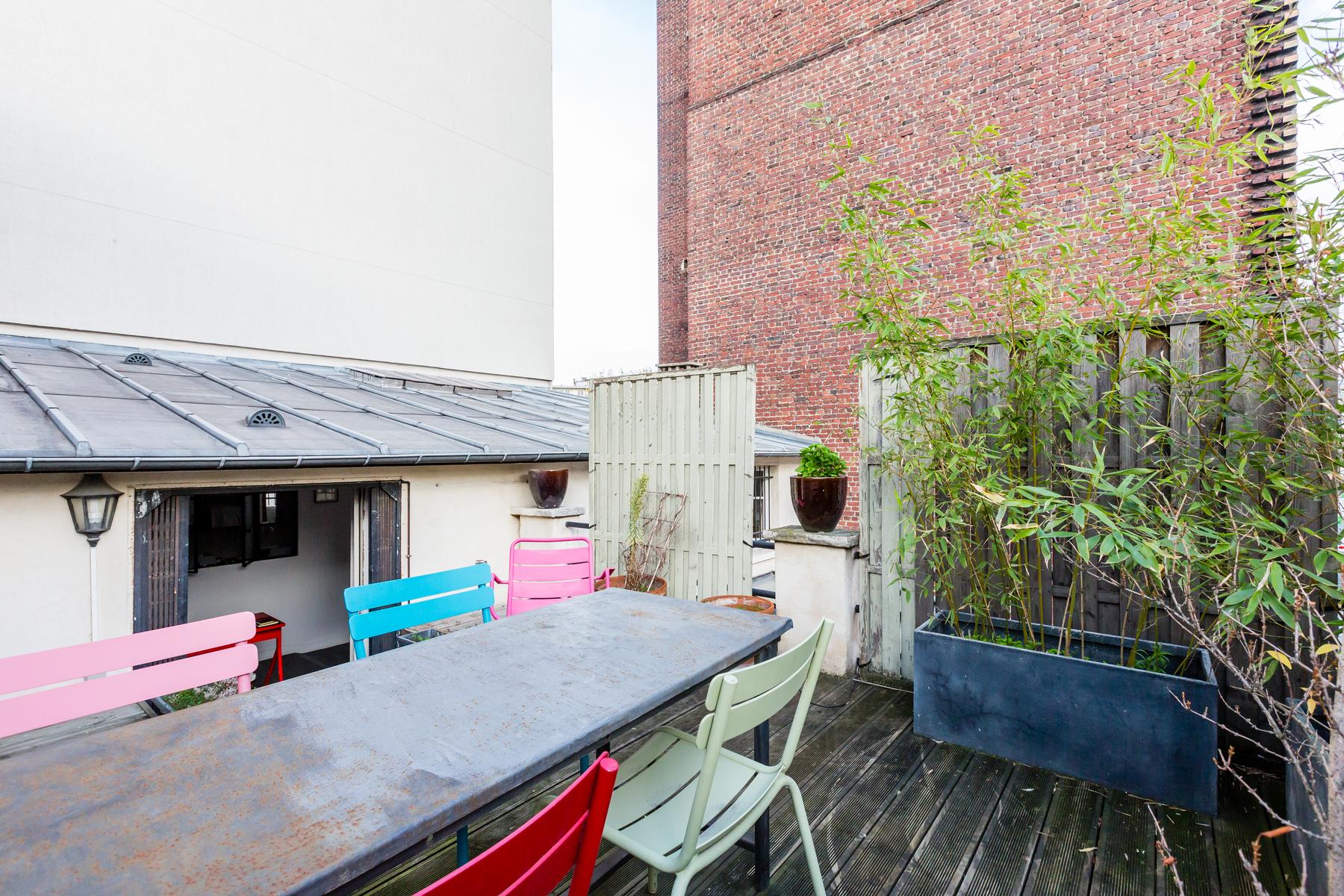En haut de l’escalier, vous trouverez la suite des maîtres, un lieu d’art avec des marches menant à la deuxième terrasse de cette maison avec vue sur les Batignolles. Il y a aussi un sous-sol, en bas de l’escalier de la cuisine, où il y a une chambre double moelleuse et des étagères de livres.
