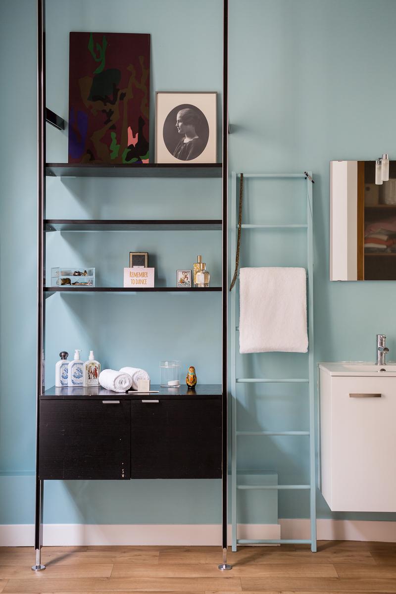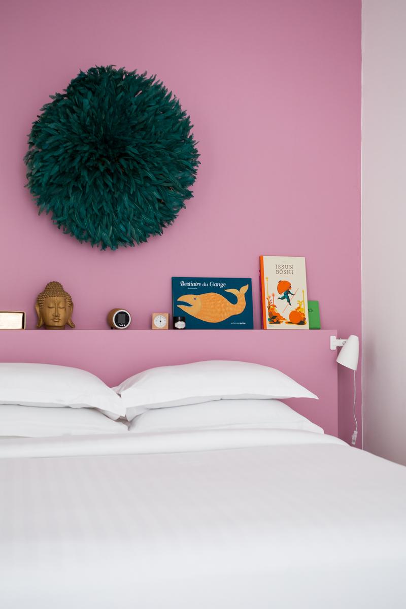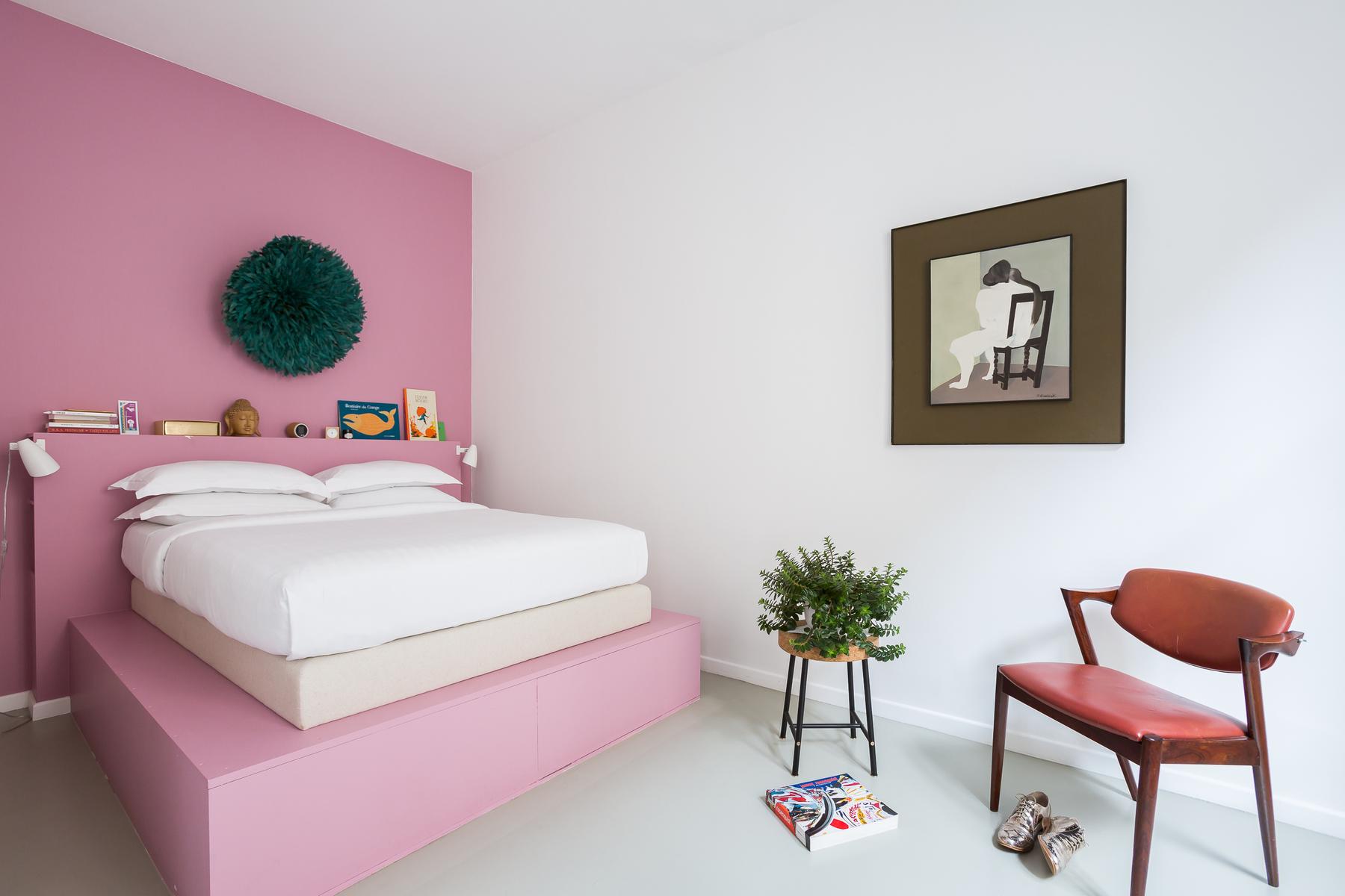 Tout comme dans le salon, il y a une palette de pastel dans la chambre des maîtres, à côté. Le mur d’enceinte et le lit double surélevé sont tous deux rose vif, tandis que les curiosités dispersées comprennent une chaise vintage et un Bouddha en bois sculpté. La salle de bains à aire ouverte est également colorée, avec une douche à l’italienne et un mur bleu bébé.