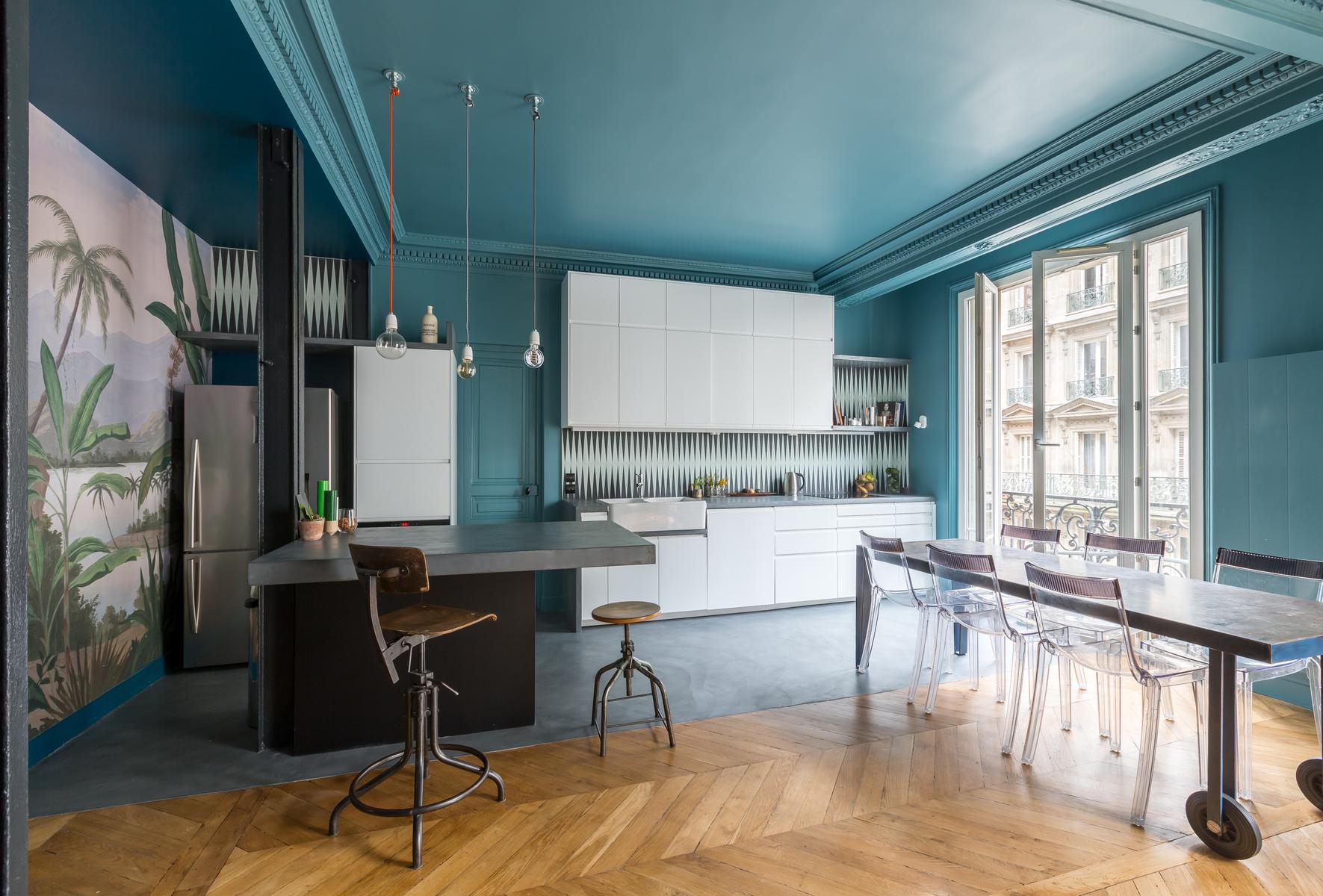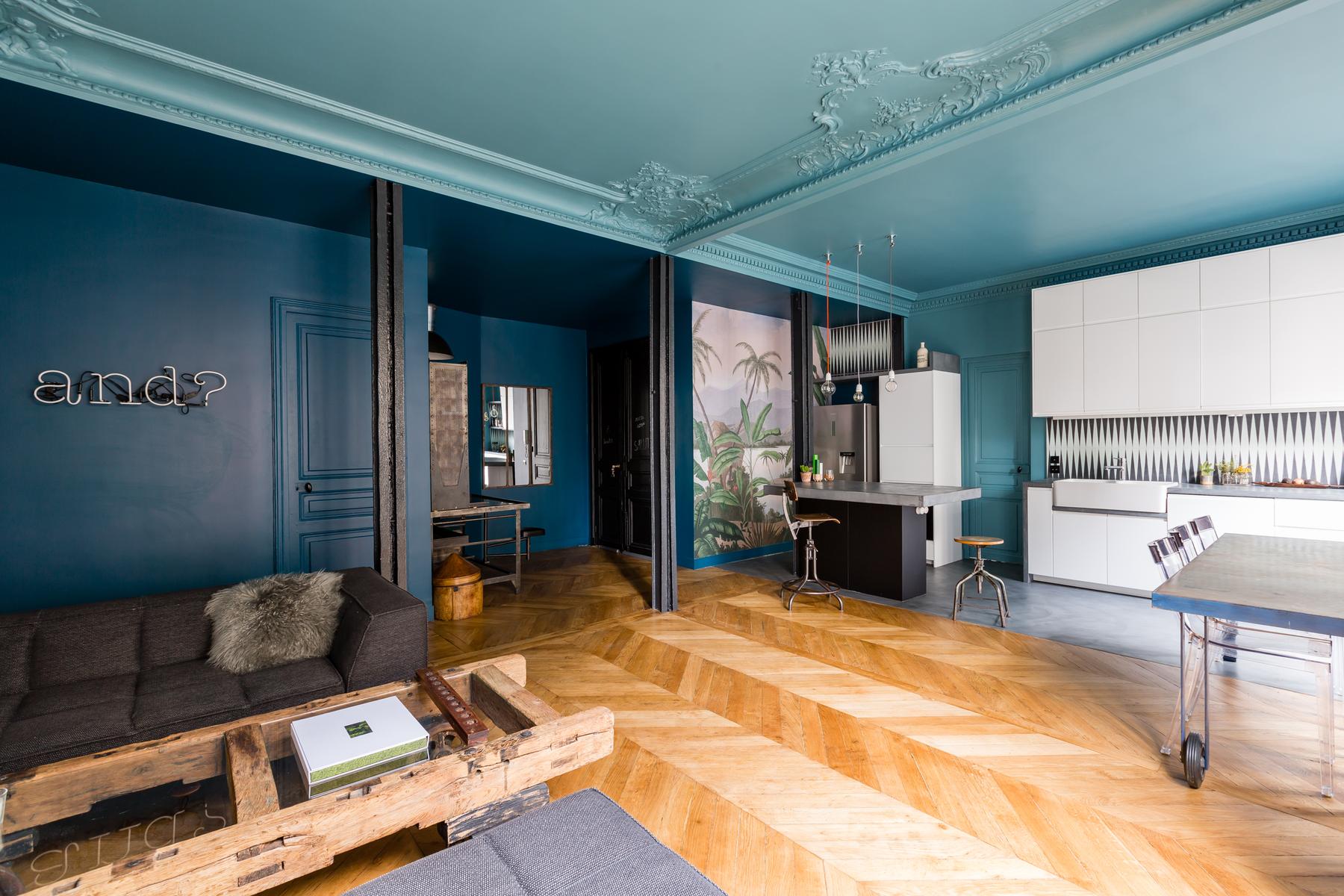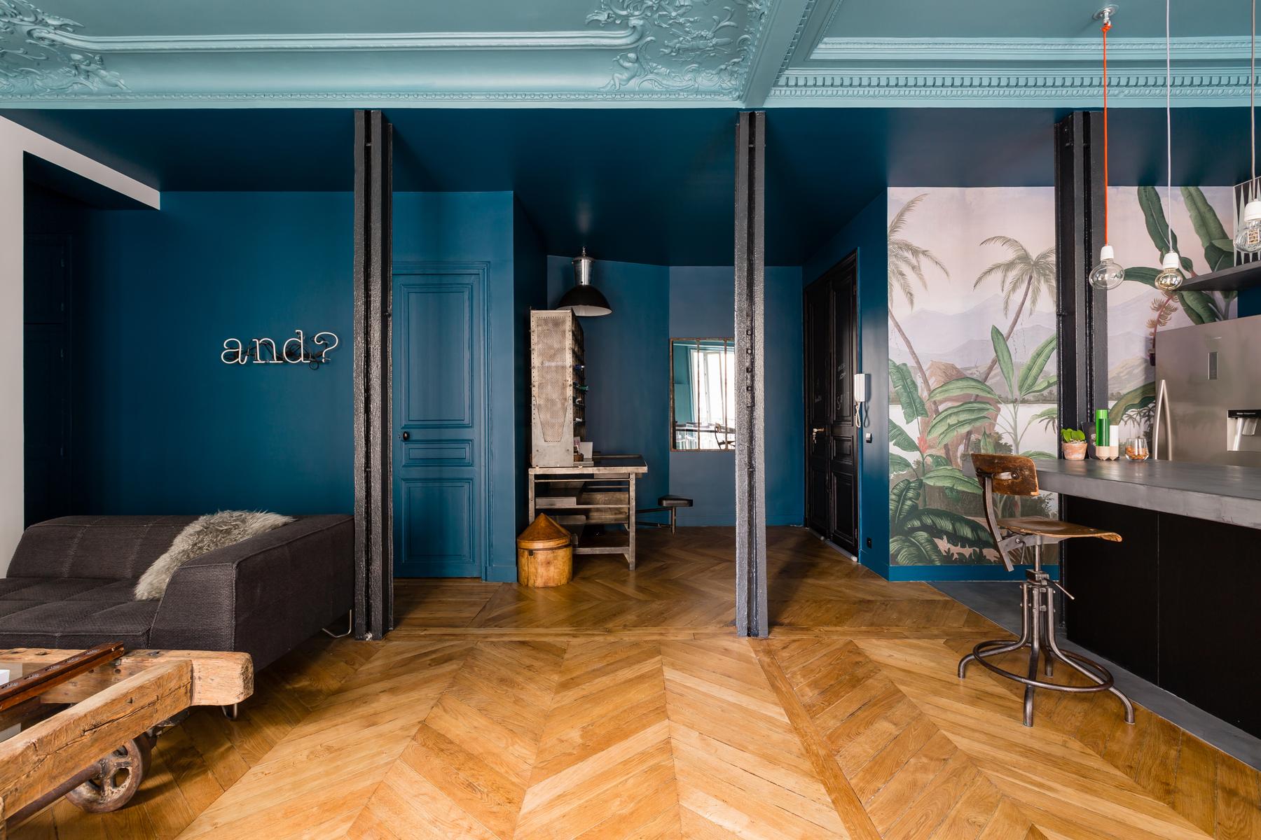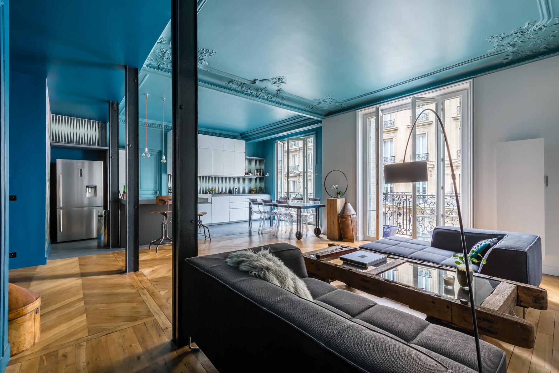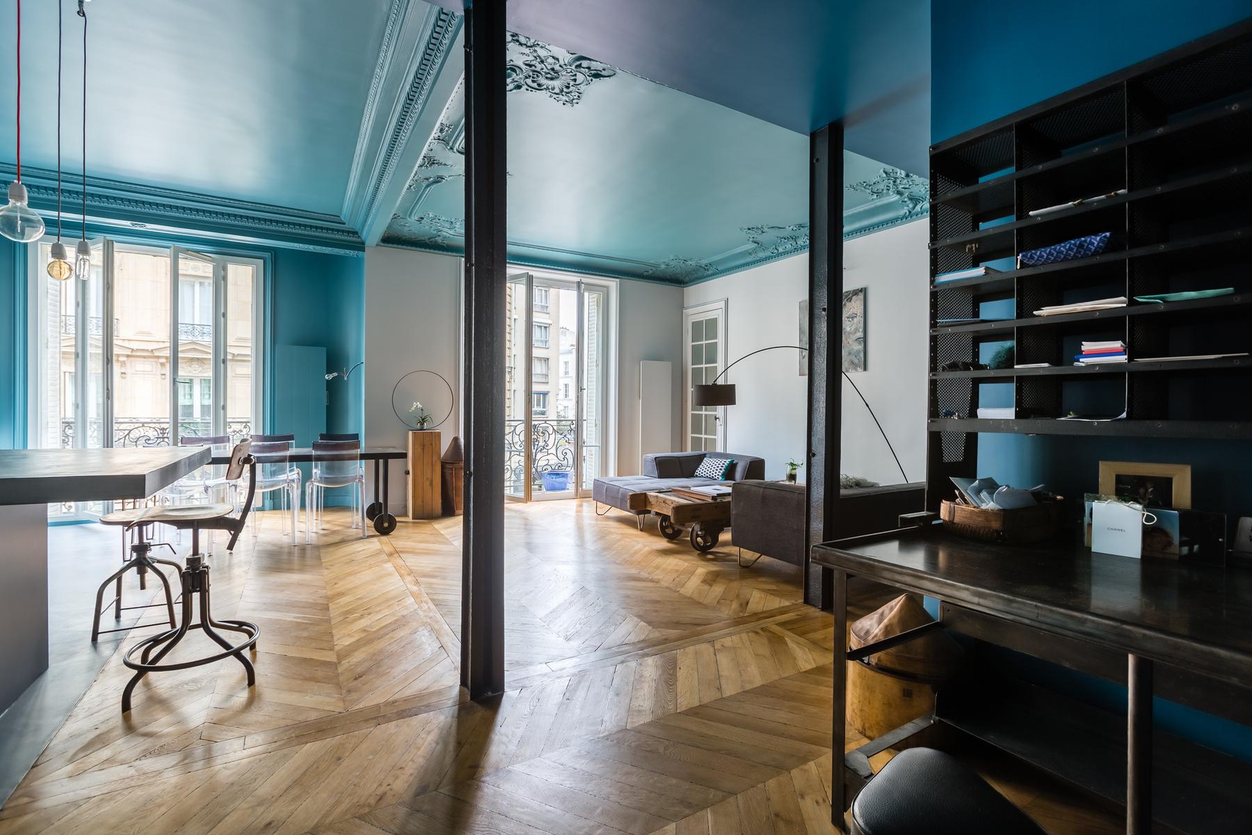 Rue Brunel est un appartement de trois chambres, deux salles de bains à Arc de Triomphe – Champs-Elysées. Le salon principal combine le salon, la salle à manger et la cuisine et offre un mélange de styles traditionnels et contemporains. Il y a un parquet impeccable, des poutres d’acier donnant un aspect industriel, des lampes suspendues sur des plans de travail de cuisine en béton poli et un plafond moulé peint d’un bleu éclatant. A l’extérieur de la Place Saint-Ferdinand, cherchez des parisiens chics qui stationnent des moteurs anciens et s’arrêtent pour surveiller les gens autour d’un café. L’impressionnant Arc de Triomphe et les boutiques de designers de l’avenue des Champs-Elysées sont à 15 minutes à pied au sud-est. Si vous vous dirigez vers le sud-ouest, vous trouverez la vaste étendue verte du Bois de Boulogne. La station de métro Porte Maillot est à cinq minutes à pied.