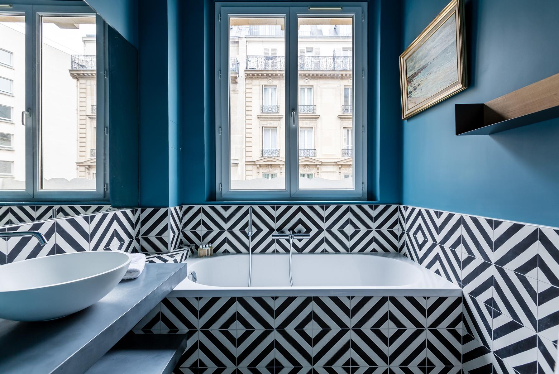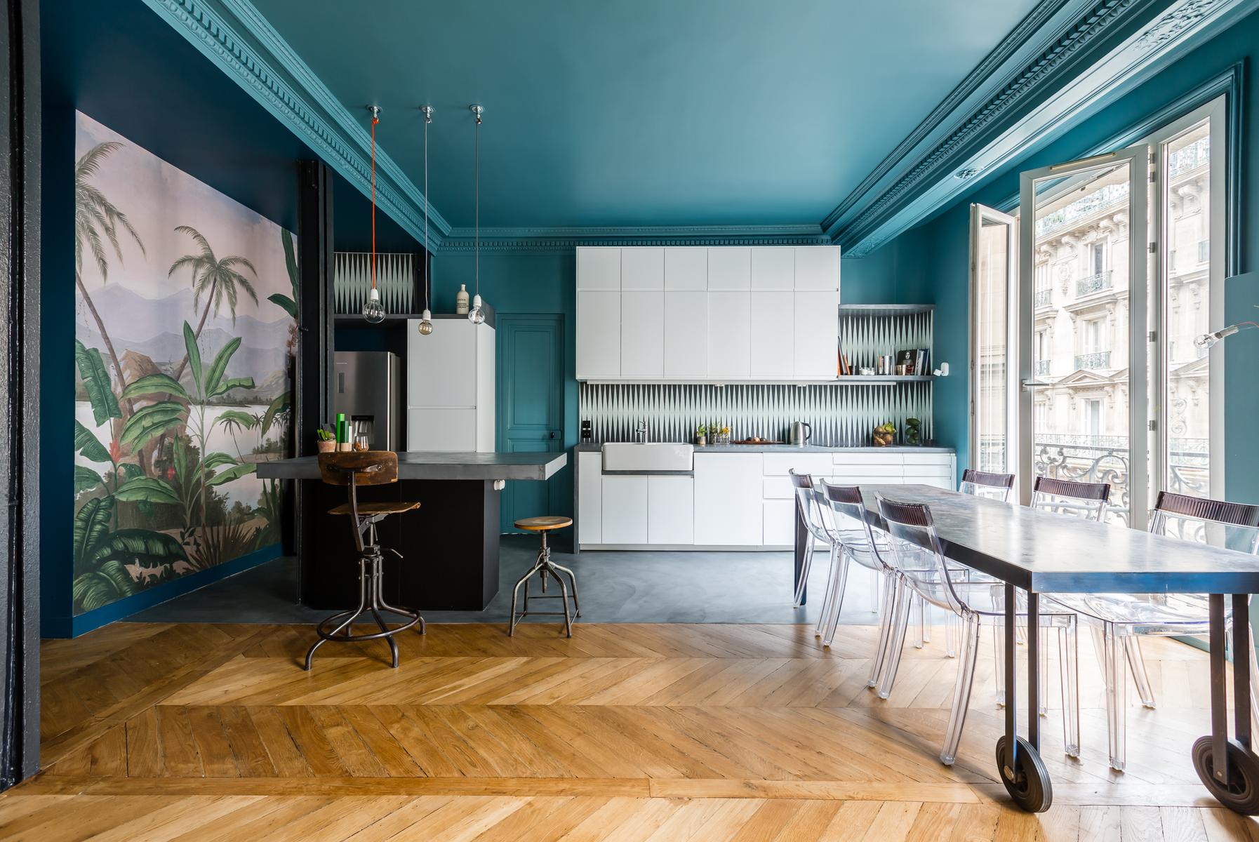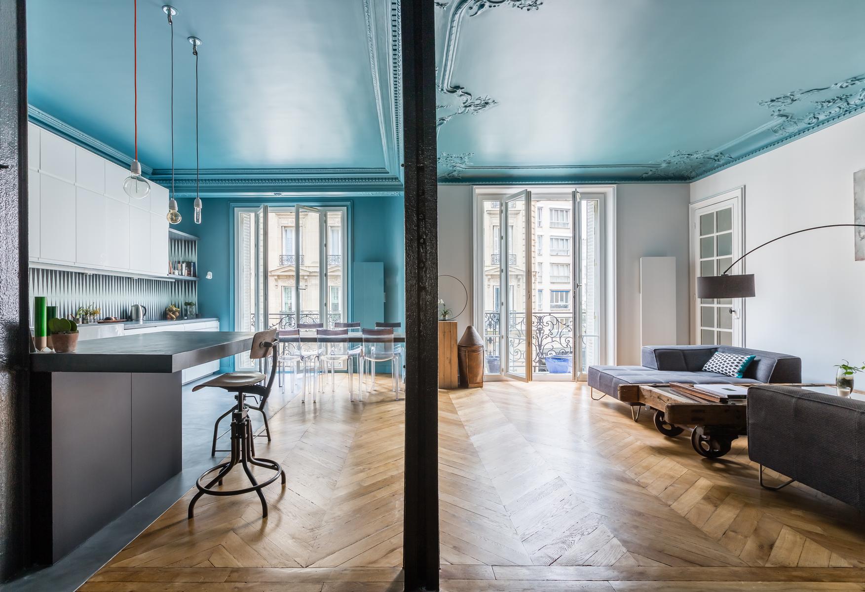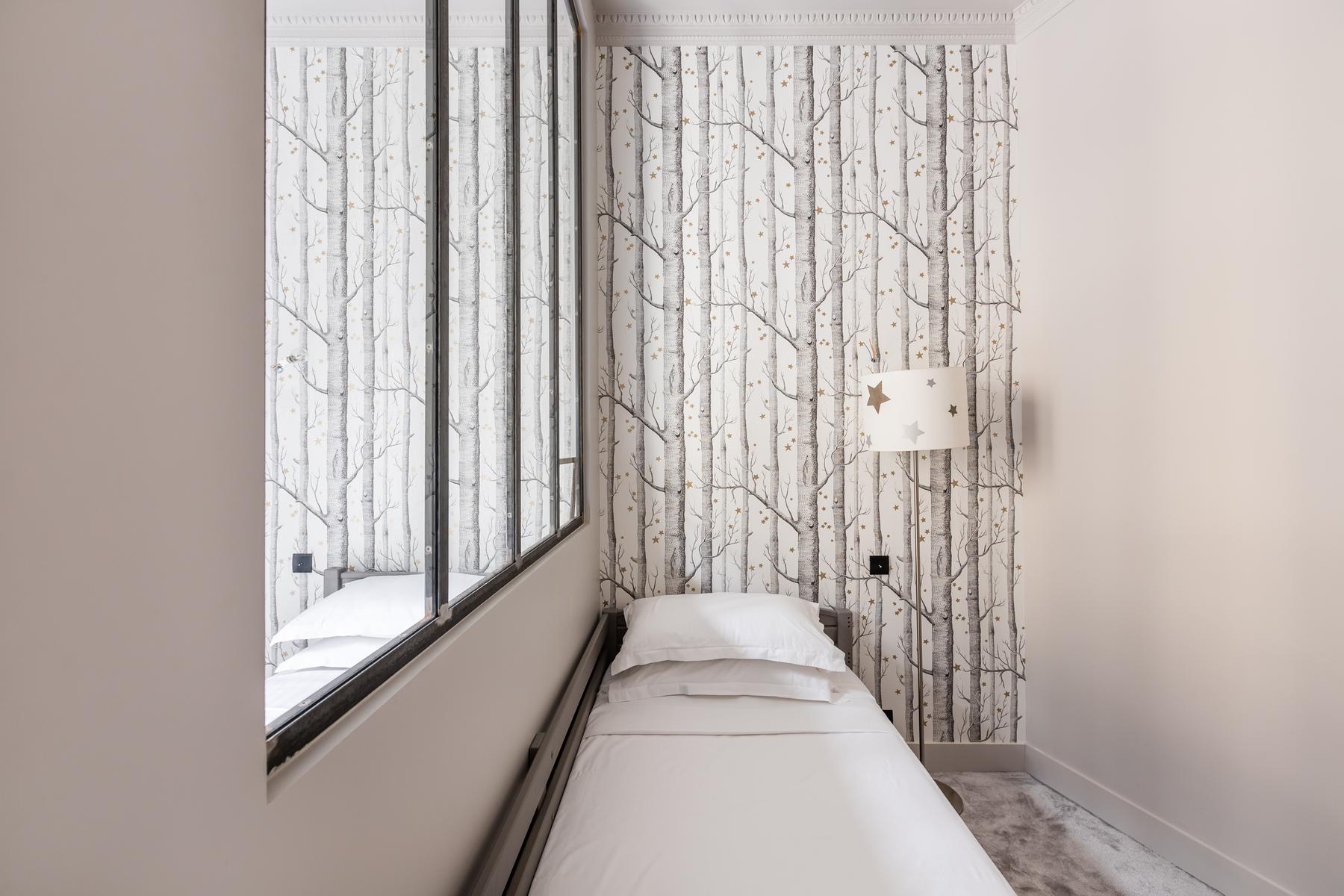 Rue Brunel est un appartement de trois chambres, deux salles de bains à Arc de Triomphe – Champs-Elysées. Le salon principal combine le salon, la salle à manger et la cuisine et offre un mélange de styles traditionnels et contemporains. Il y a un parquet impeccable, des poutres d’acier donnant un aspect industriel, des lampes suspendues sur des plans de travail de cuisine en béton poli et un plafond moulé peint d’un bleu éclatant. A l’extérieur de la Place Saint-Ferdinand, cherchez des parisiens chics qui stationnent des moteurs anciens et s’arrêtent pour surveiller les gens autour d’un café. L’impressionnant Arc de Triomphe et les boutiques de designers de l’avenue des Champs-Elysées sont à 15 minutes à pied au sud-est. Si vous vous dirigez vers le sud-ouest, vous trouverez la vaste étendue verte du Bois de Boulogne. La station de métro Porte Maillot est à cinq minutes à pied.