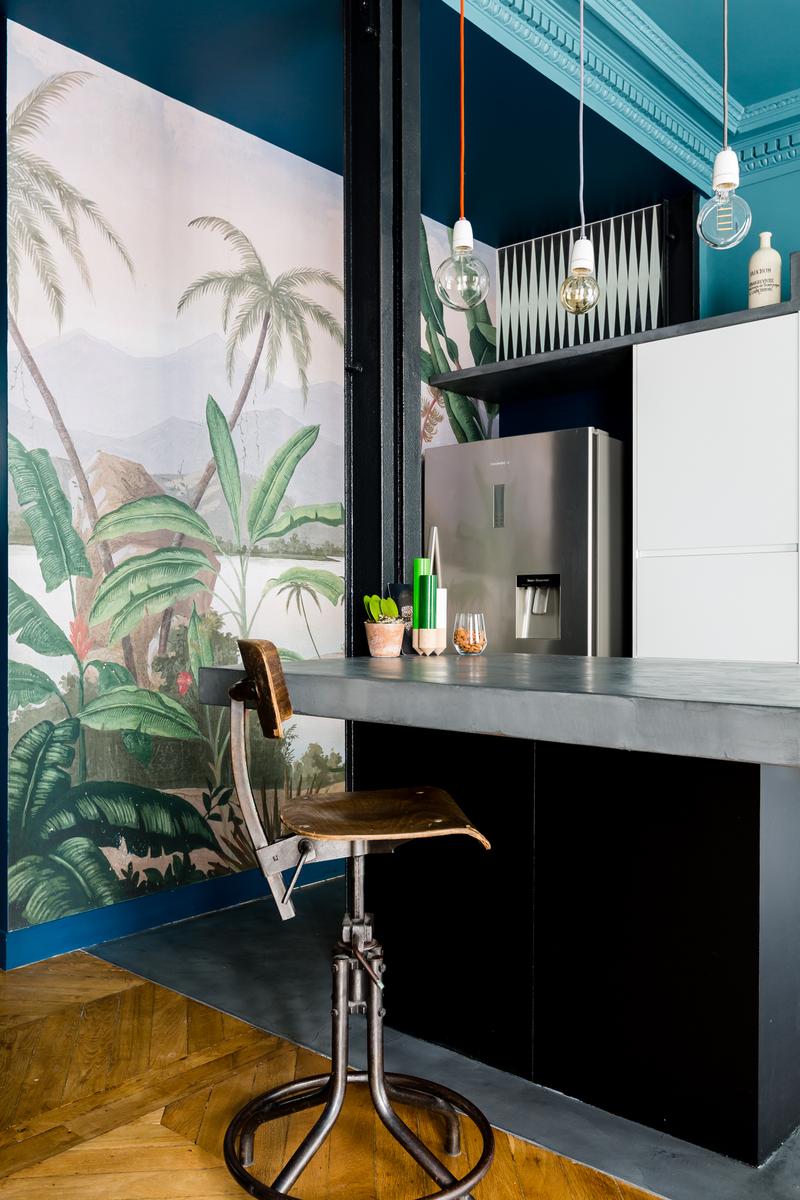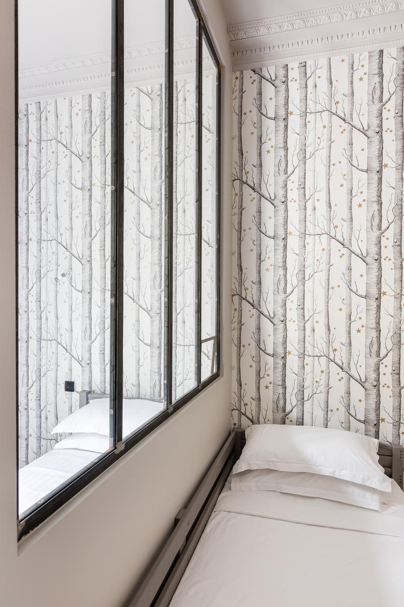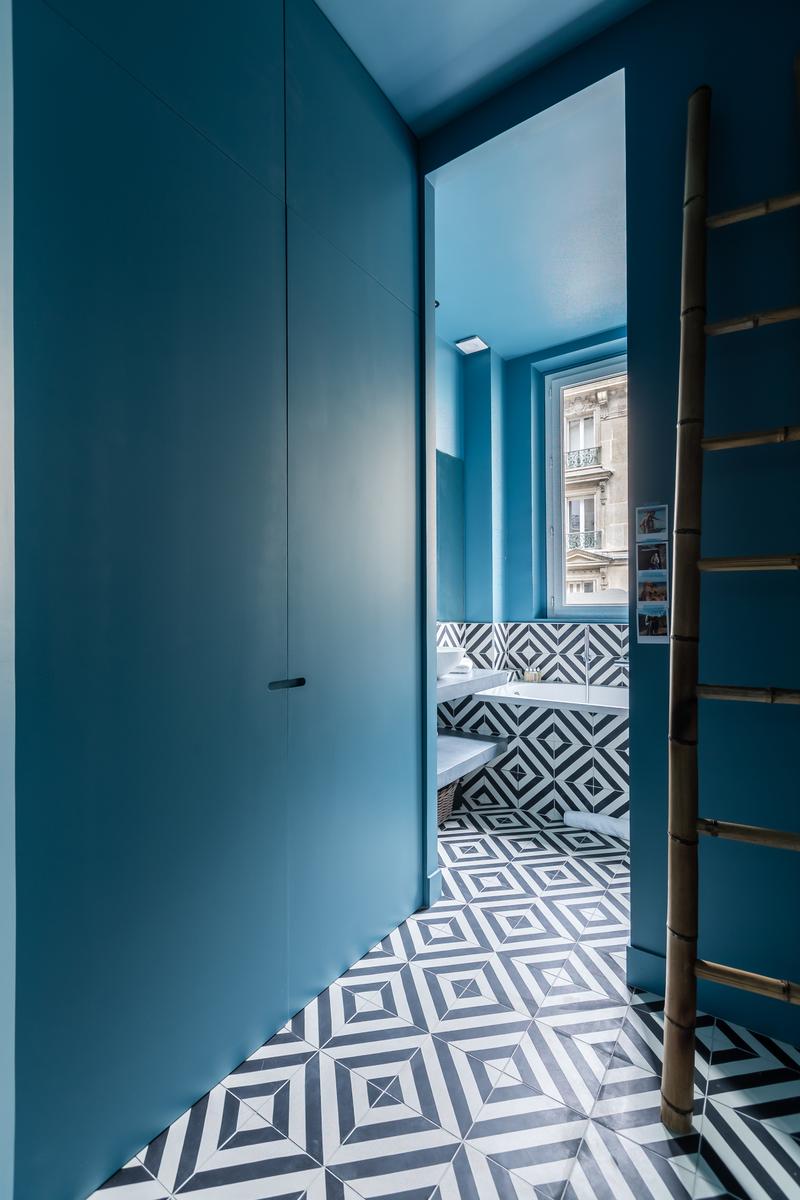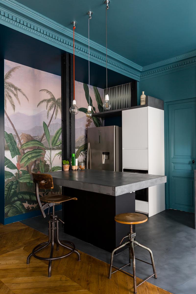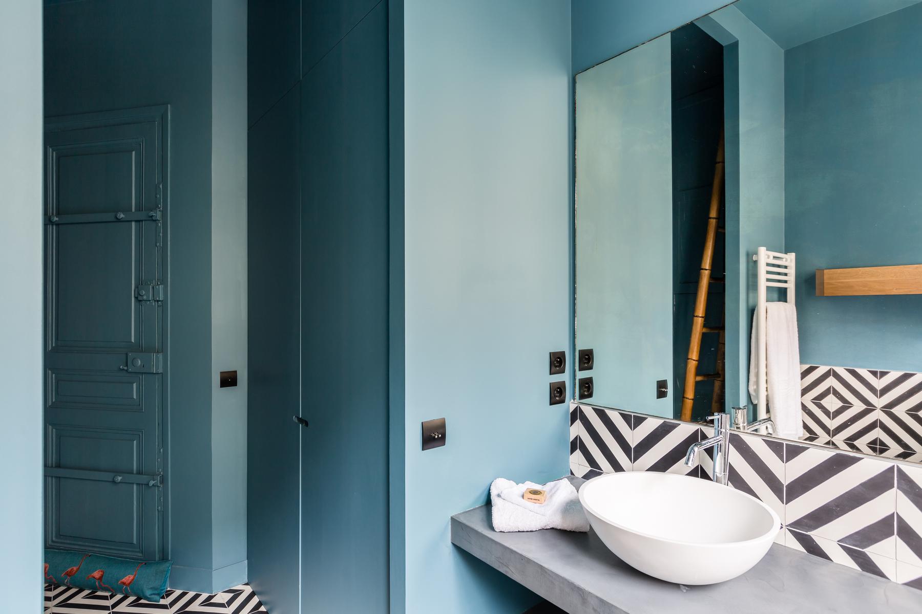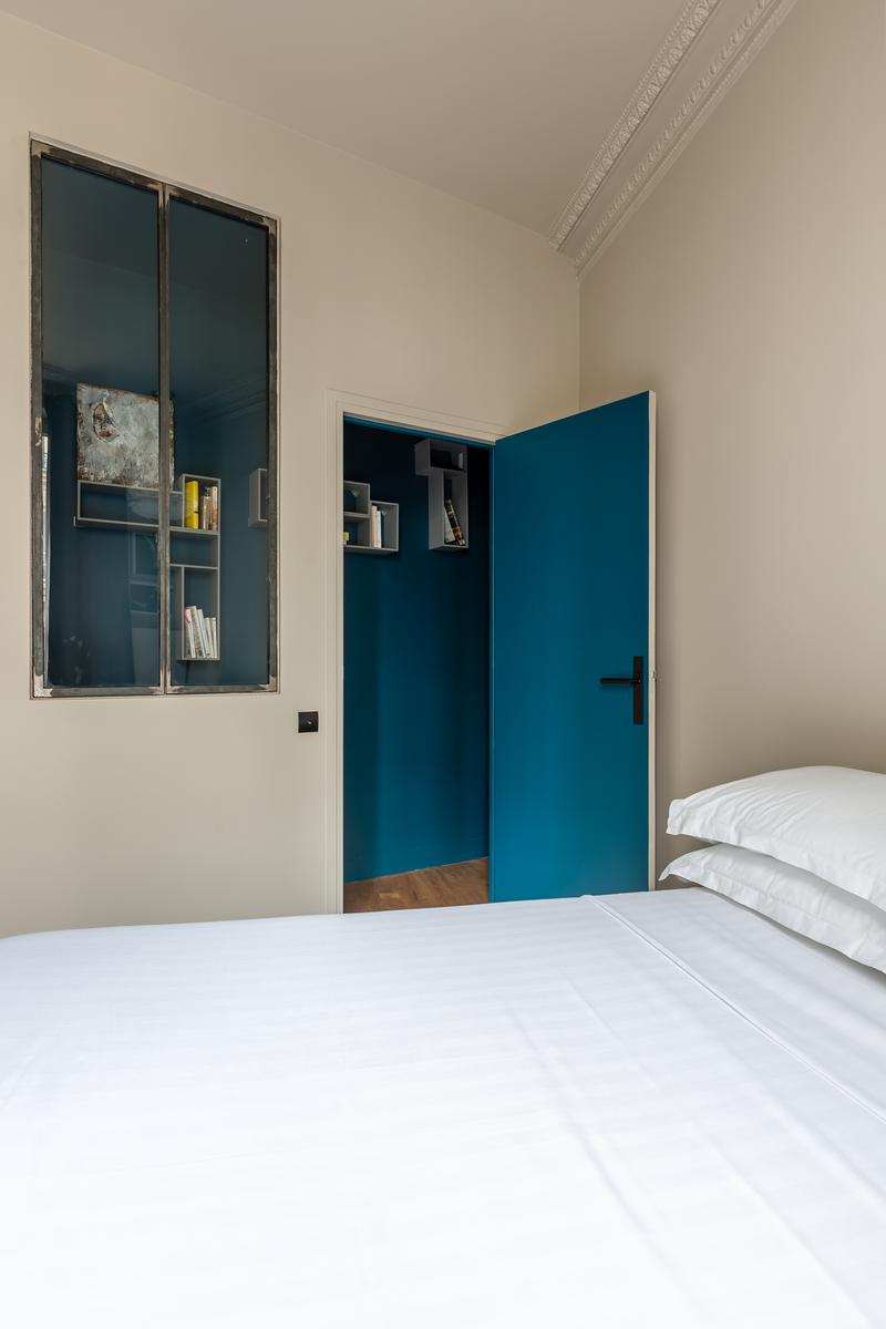 Rue Brunel est un appartement de trois chambres, deux salles de bains à Arc de Triomphe – Champs-Elysées. Le salon principal combine le salon, la salle à manger et la cuisine et offre un mélange de styles traditionnels et contemporains. Il y a un parquet impeccable, des poutres d’acier donnant un aspect industriel, des lampes suspendues sur des plans de travail de cuisine en béton poli et un plafond moulé peint d’un bleu éclatant. A l’extérieur de la Place Saint-Ferdinand, cherchez des parisiens chics qui stationnent des moteurs anciens et s’arrêtent pour surveiller les gens autour d’un café. L’impressionnant Arc de Triomphe et les boutiques de designers de l’avenue des Champs-Elysées sont à 15 minutes à pied au sud-est. Si vous vous dirigez vers le sud-ouest, vous trouverez la vaste étendue verte du Bois de Boulogne. La station de métro Porte Maillot est à cinq minutes à pied.