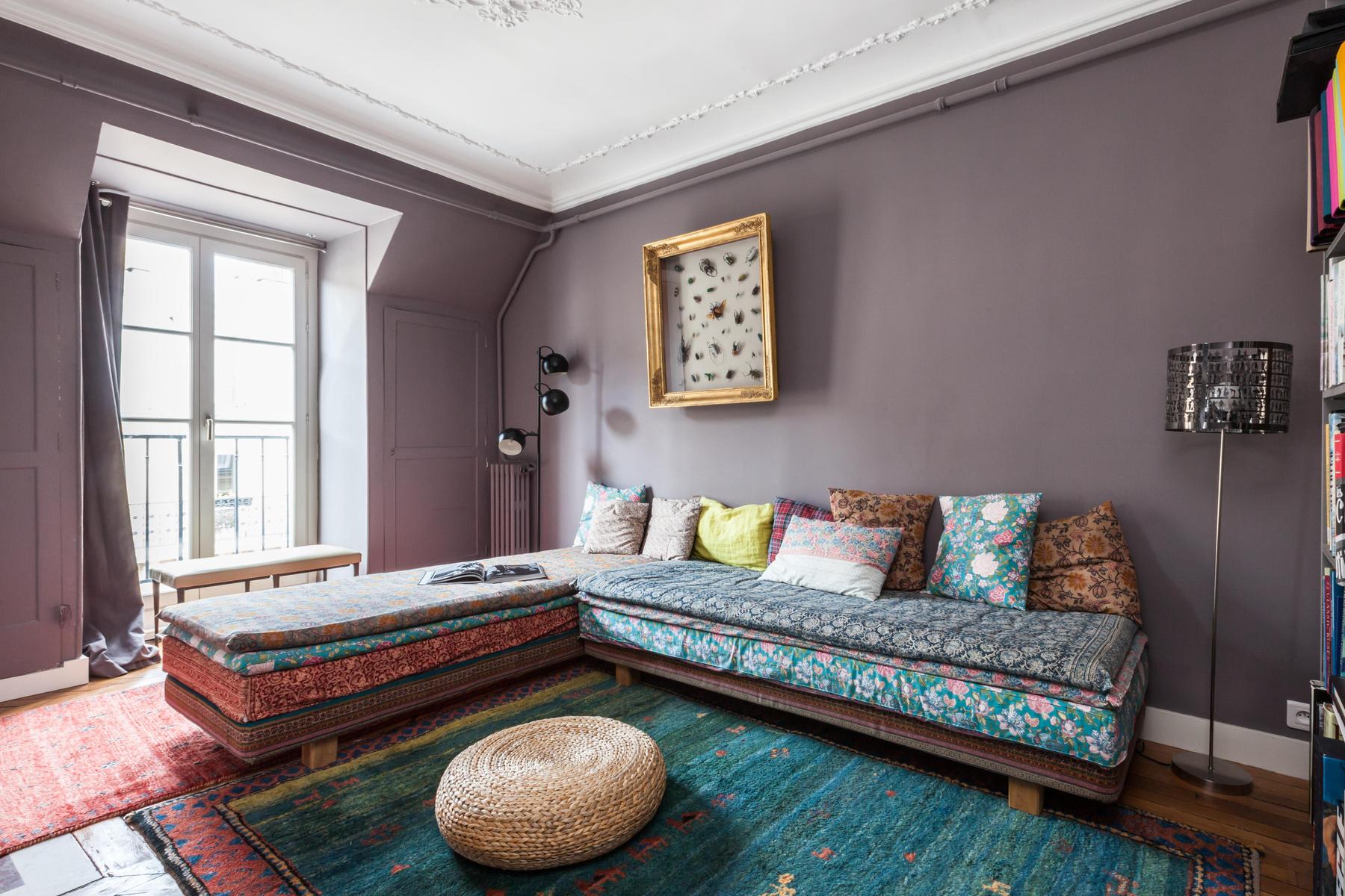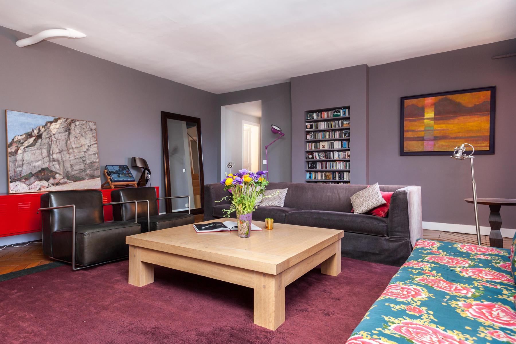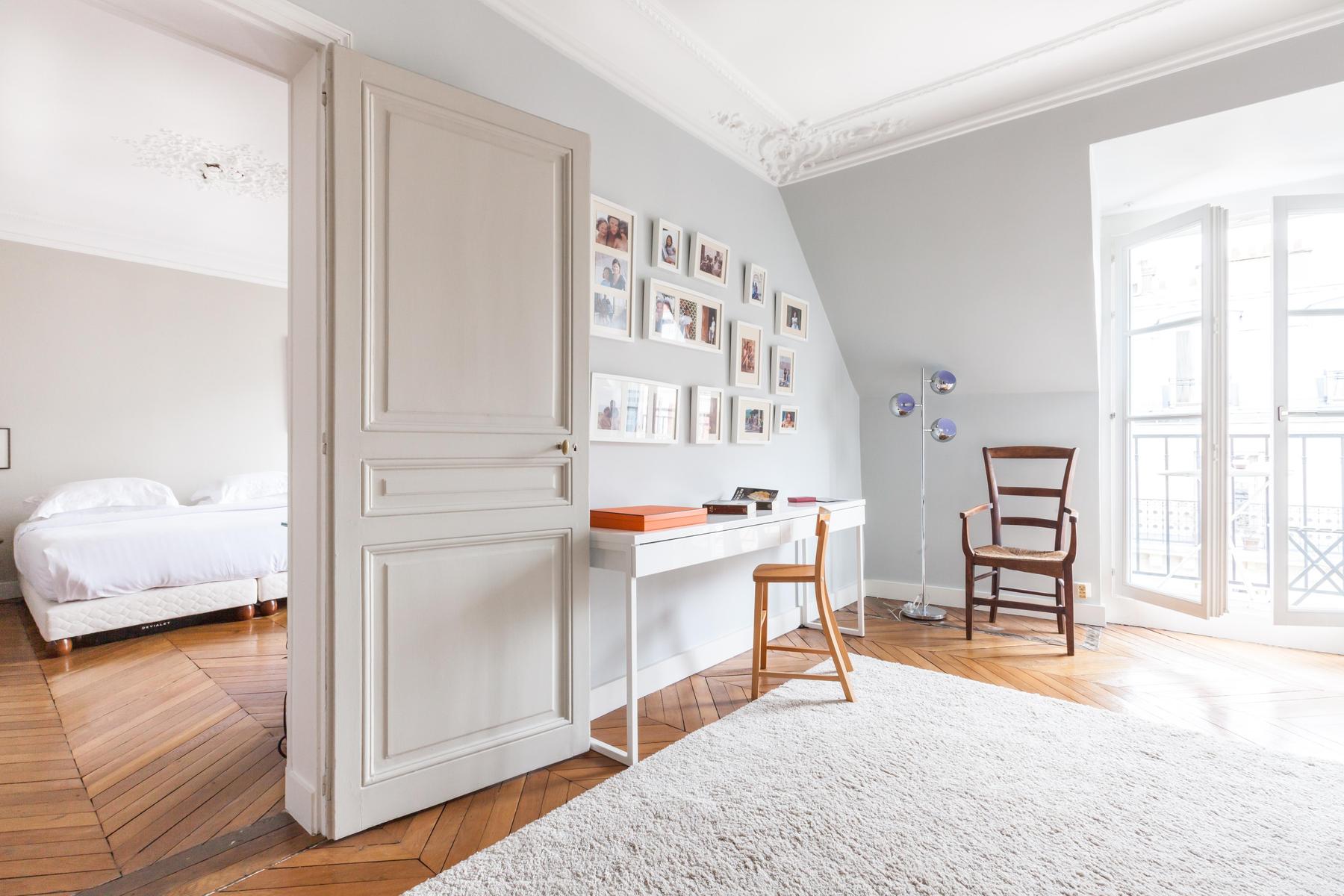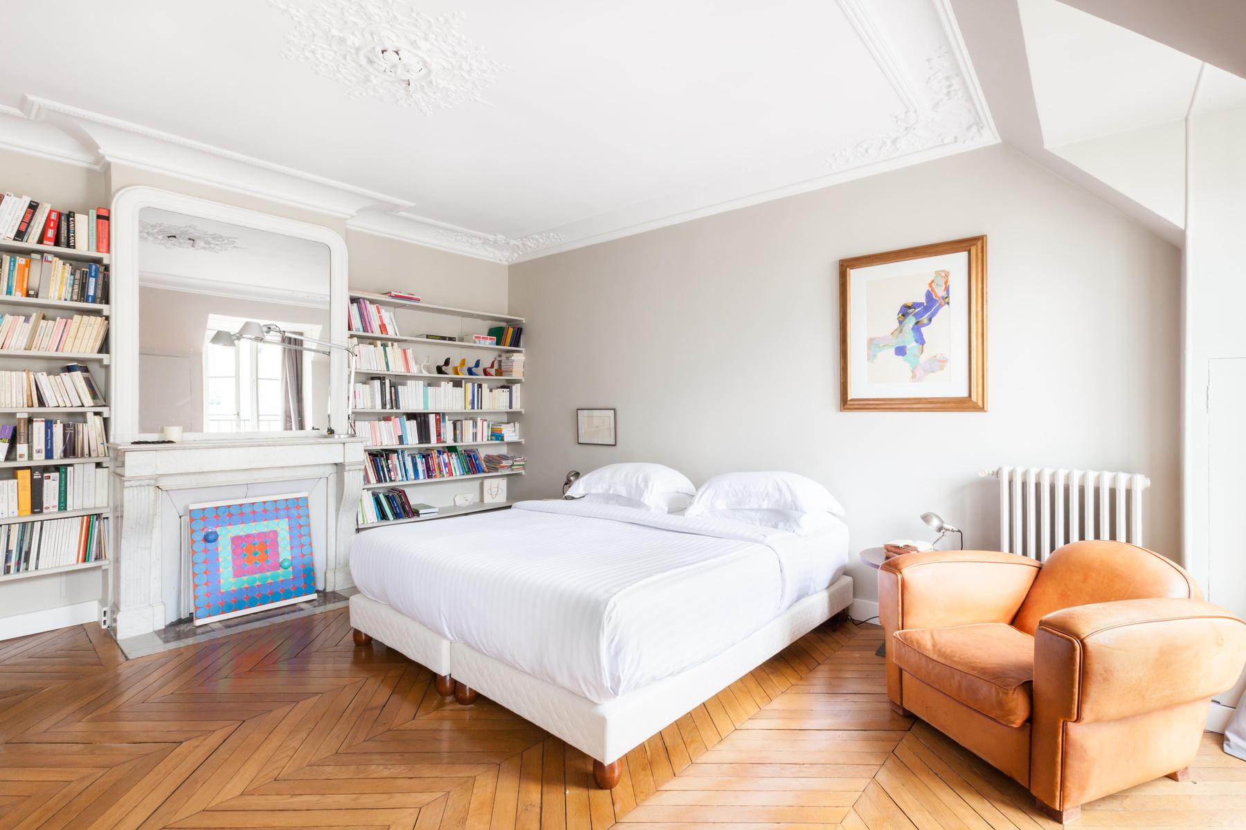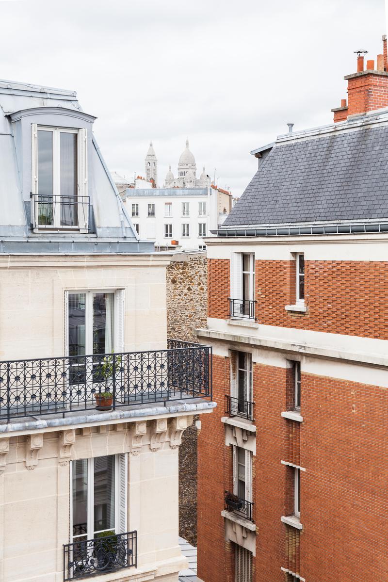 La rue Chaptal est une trouvaille précieuse. Ses pièces brillent de violet améthyste, de bois ambré et de murs d’un blanc nacré. Mais un bijou n’est rien en soi, et celui-ci est installé sur les deux étages supérieurs d’un immeuble essentiellement parisien, avec vue sur le Sacré Coeur et la tour Eiffel. Les couches délicatement contradictoires et les imprimés du canapé d’angle captivent, tandis que les fauteuils aux finitions métalliques éblouissent. Si vous osez l’absinthe émeraude sur la place du Tertre, laissez vos jambes vous porter jusqu’aux marches du Sacré Coeur, où tout Paris s’étale devant vous – des lumières dorées scintillantes sur un ciel de velours noir