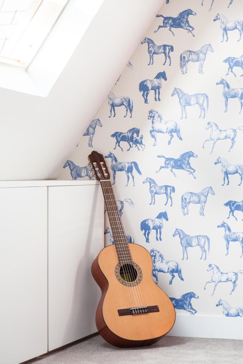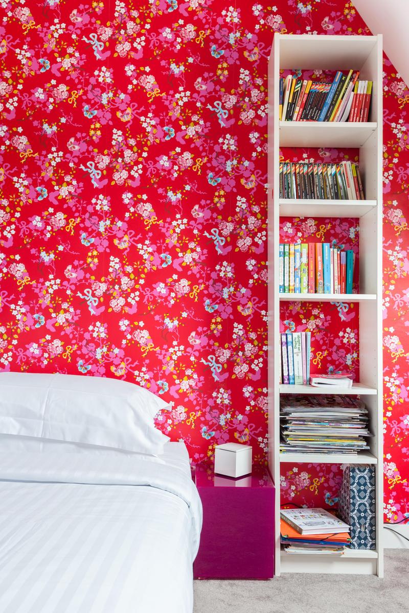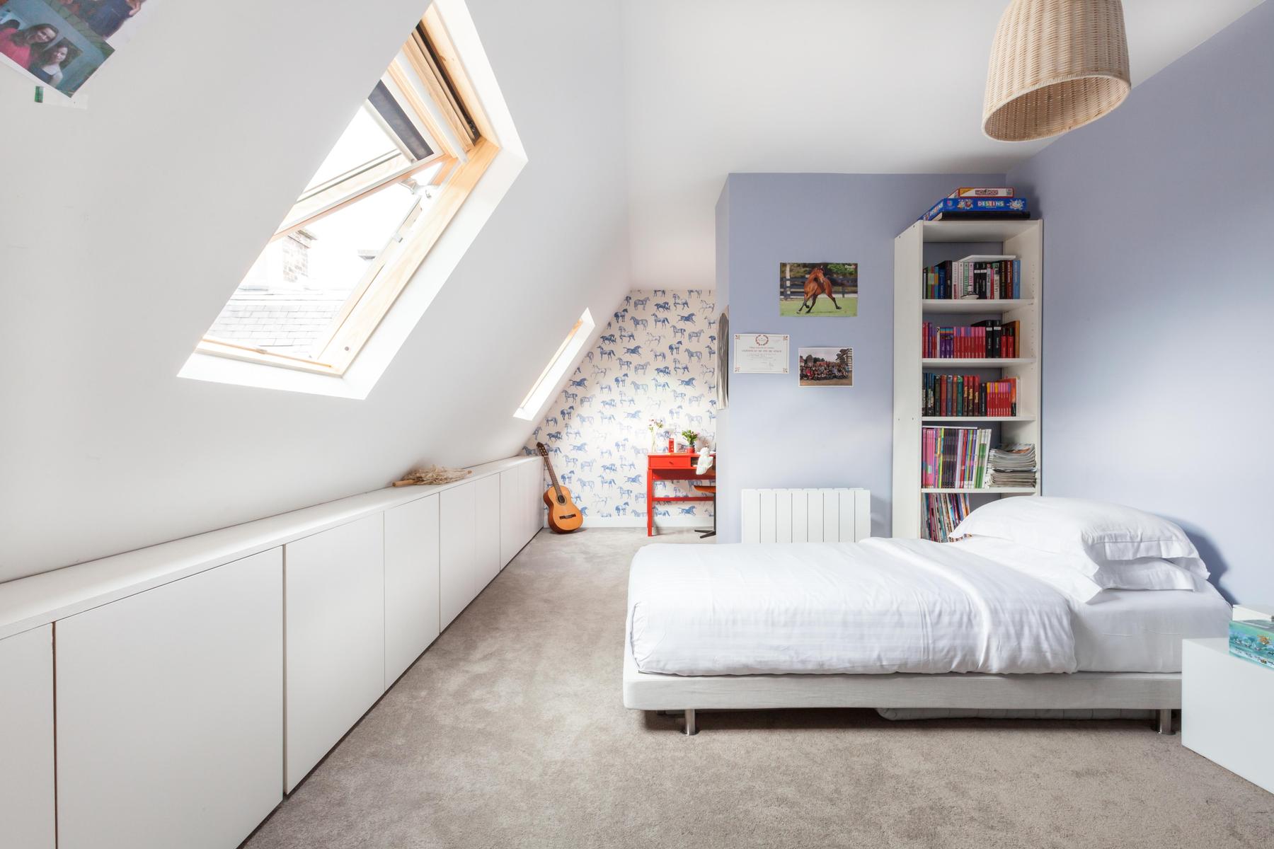 L’agencement des couleurs est délicat, pas de notes effrontées ici. Au lieu de cela, les pièces sont ombragées dans des tons complémentaires au cornique filigrane et aux parquets d’origine. Le salon est une sensation en lilas, l’impressionnante collection de livres encastrée dans le mur, tandis que la cuisine d’à côté est flambant neuve, avec de l’espace pour six convives à la table en acajou . Les deux célibataires – tous les murs en pente et les poutres d’origine – jettent un coup d’œil sur les toits, tandis que la chambre des maîtres avec sa cheminée en marbre, sa vue imprenable et son dressing privé.