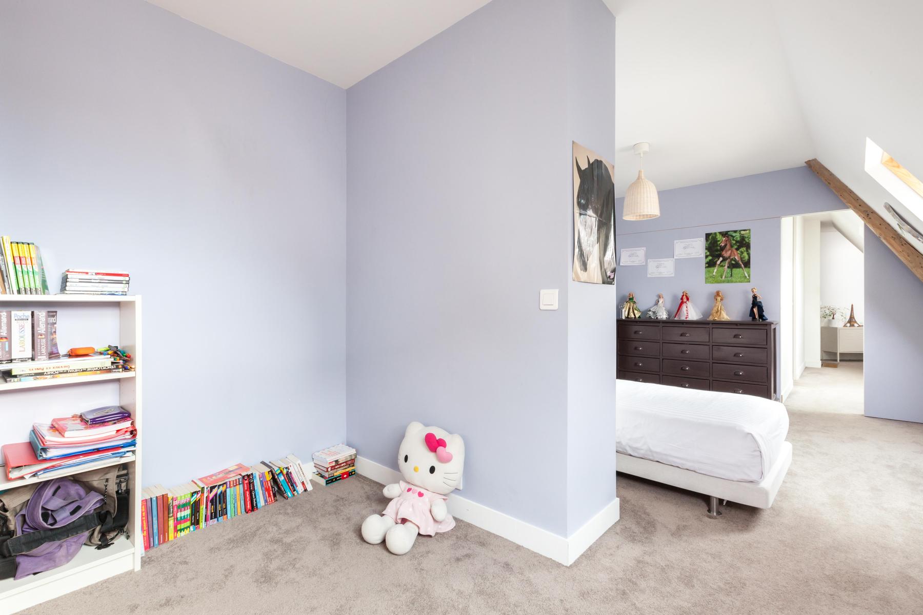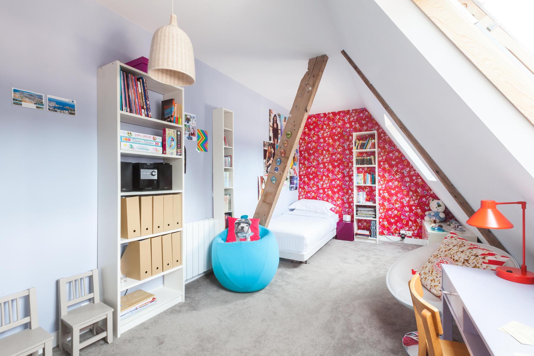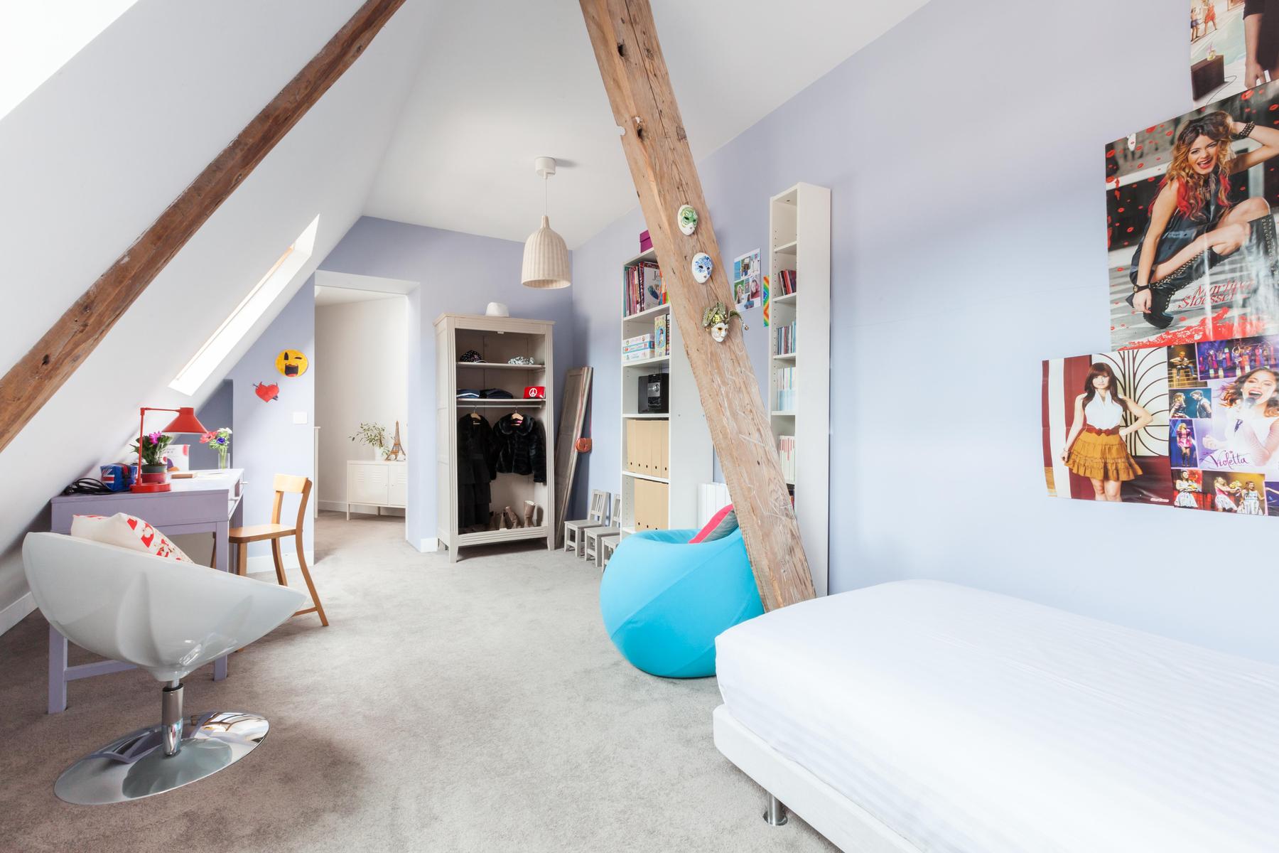 L’agencement des couleurs est délicat, pas de notes effrontées ici. Au lieu de cela, les pièces sont ombragées dans des tons complémentaires au cornique filigrane et aux parquets d’origine. Le salon est une sensation en lilas, l’impressionnante collection de livres encastrée dans le mur, tandis que la cuisine d’à côté est flambant neuve, avec de l’espace pour six convives à la table en acajou . Les deux célibataires – tous les murs en pente et les poutres d’origine – jettent un coup d’œil sur les toits, tandis que la chambre des maîtres avec sa cheminée en marbre, sa vue imprenable et son dressing privé.