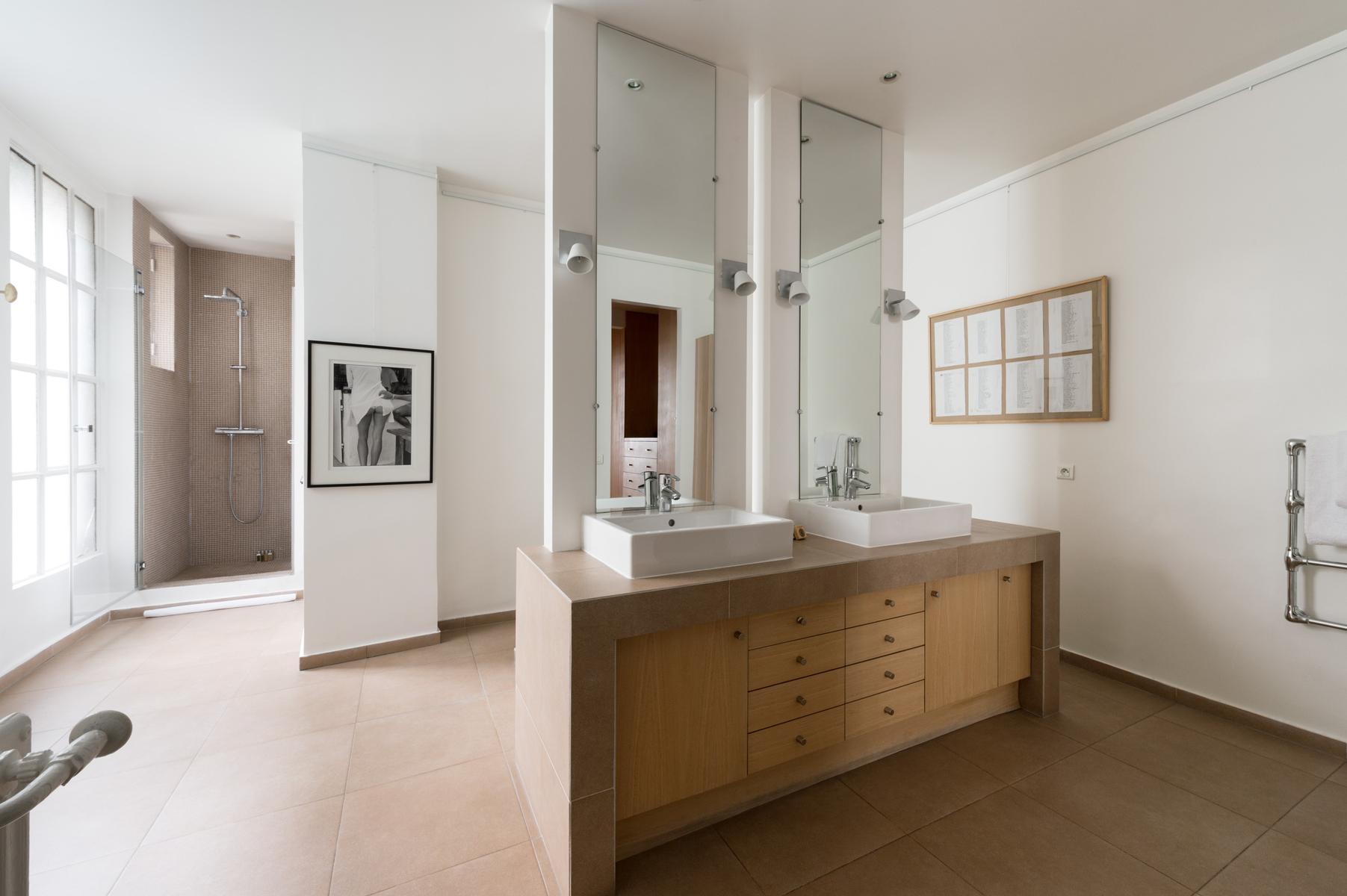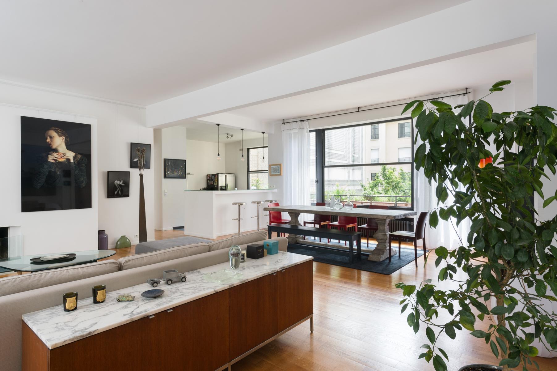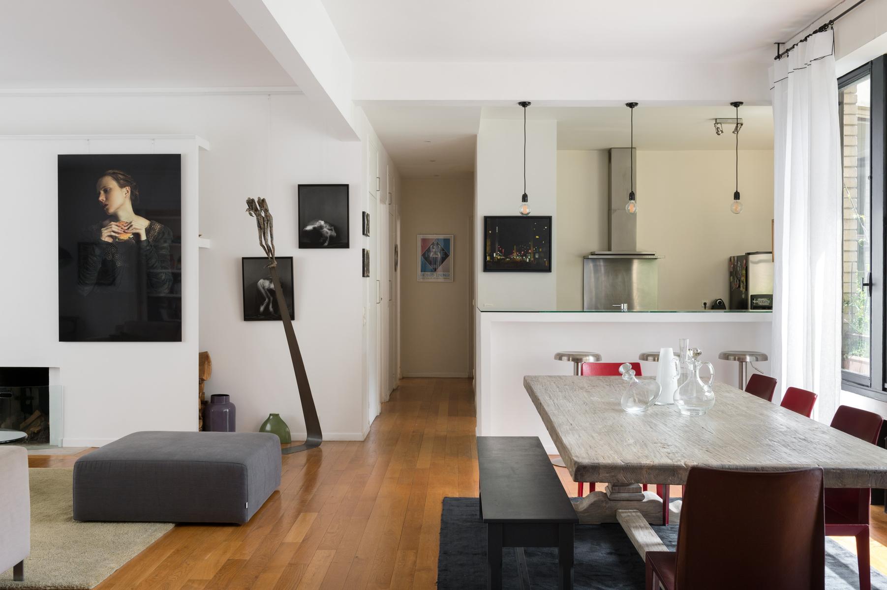 Cette maison au bord de la Seine a l’air décontracté. Vous entrez dans un couloir, où vous trouverez la chambre principale sur la gauche. Elle dispose d’un lit king size (sur lequel est suspendue une toile de bord de mer), de deux fauteuils roses et d’une salle de bain super-style. Ensuite, tout droit devant la porte, se trouve un confortable coin bibliothèque qui s’ouvre sur le salon. À l’extrémité proche, des canapés et des fauteuils discrets sont entourés d’œuvres d’art absorbantes. Il y a aussi une table à manger antique à côté des fenêtres, avec des chaises et des bancs colorés. Dans le coin le plus éloigné, vous apercevrez la cuisine attenante, avec son bar à déjeuner vitré et ses armoires argentées aux lignes épurées.