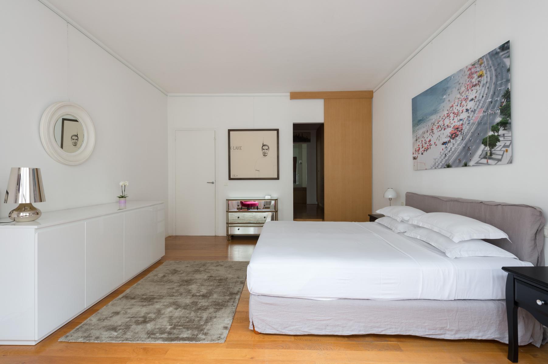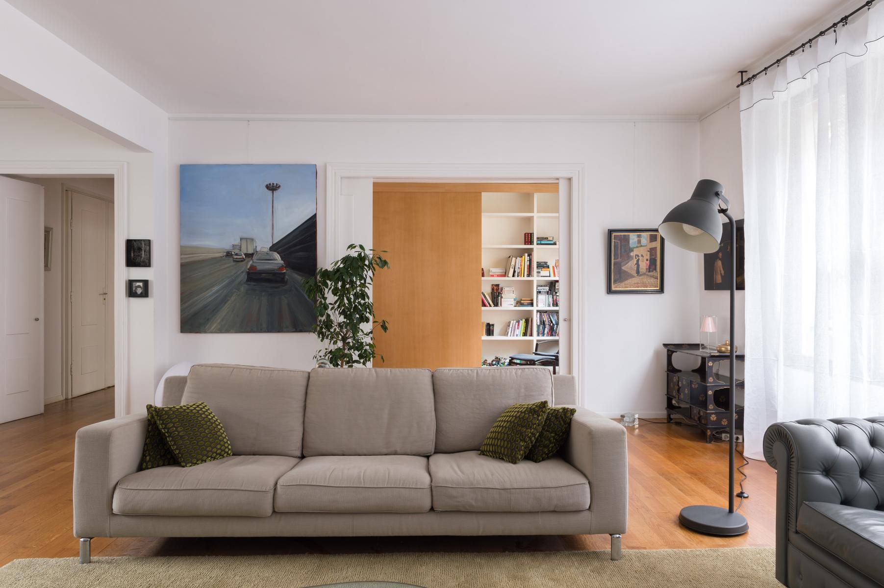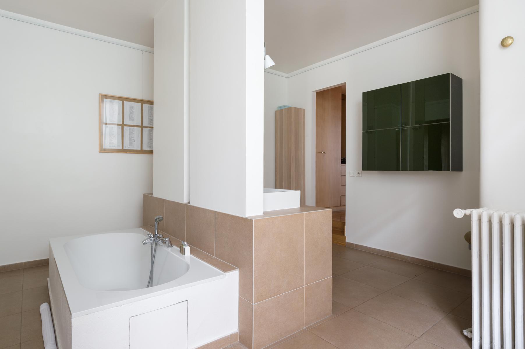 Cette maison au bord de la Seine a l’air décontracté. Vous entrez dans un couloir, où vous trouverez la chambre principale sur la gauche. Elle dispose d’un lit king size (sur lequel est suspendue une toile de bord de mer), de deux fauteuils roses et d’une salle de bain super-style. Ensuite, tout droit devant la porte, se trouve un confortable coin bibliothèque qui s’ouvre sur le salon. À l’extrémité proche, des canapés et des fauteuils discrets sont entourés d’œuvres d’art absorbantes. Il y a aussi une table à manger antique à côté des fenêtres, avec des chaises et des bancs colorés. Dans le coin le plus éloigné, vous apercevrez la cuisine attenante, avec son bar à déjeuner vitré et ses armoires argentées aux lignes épurées.