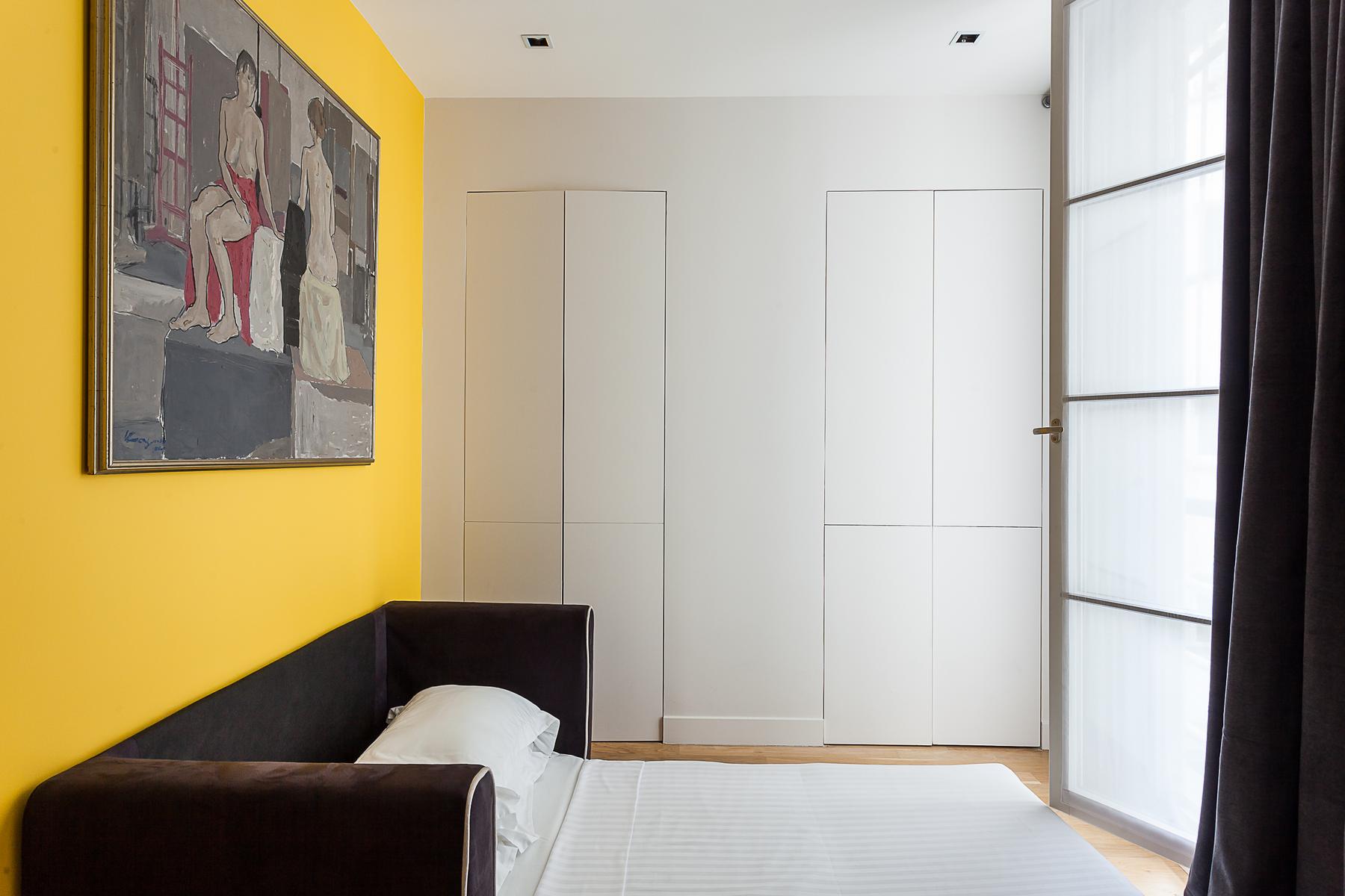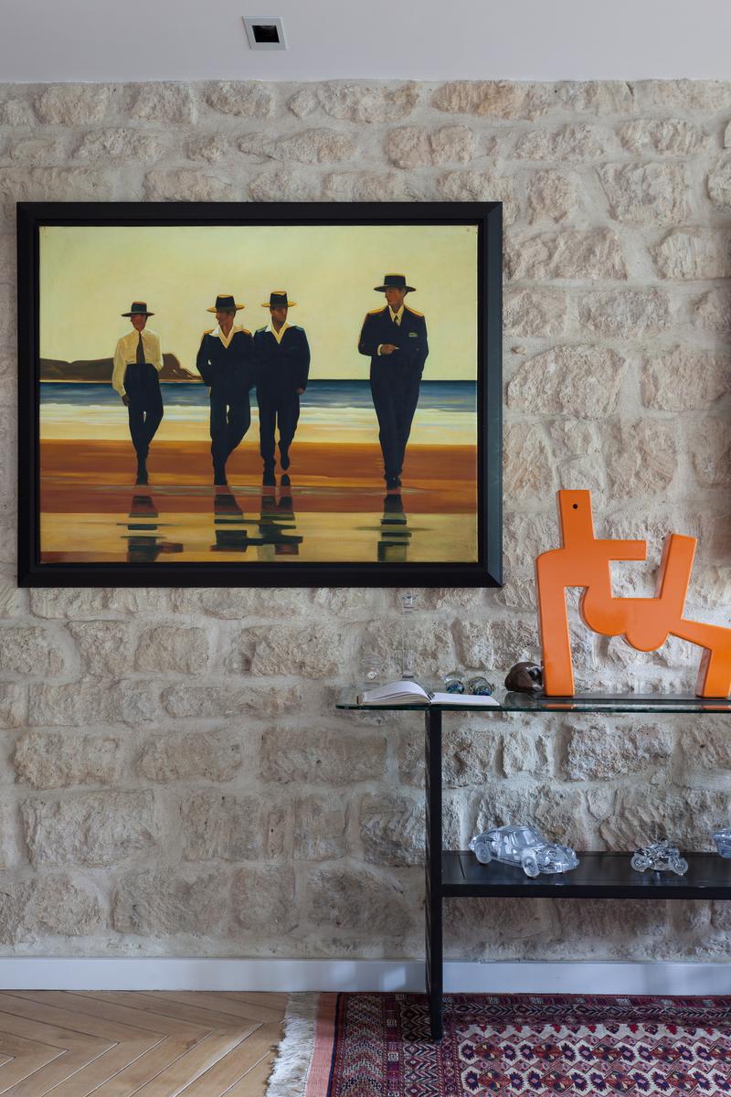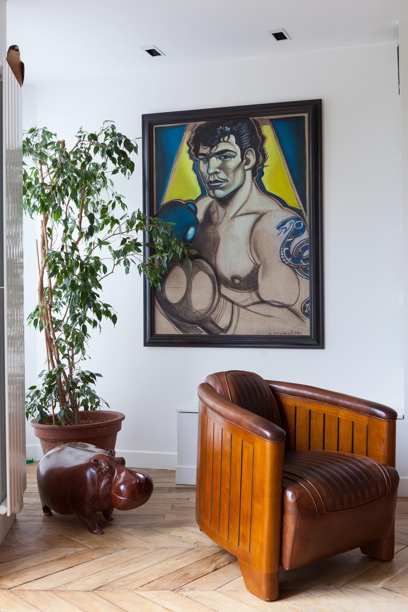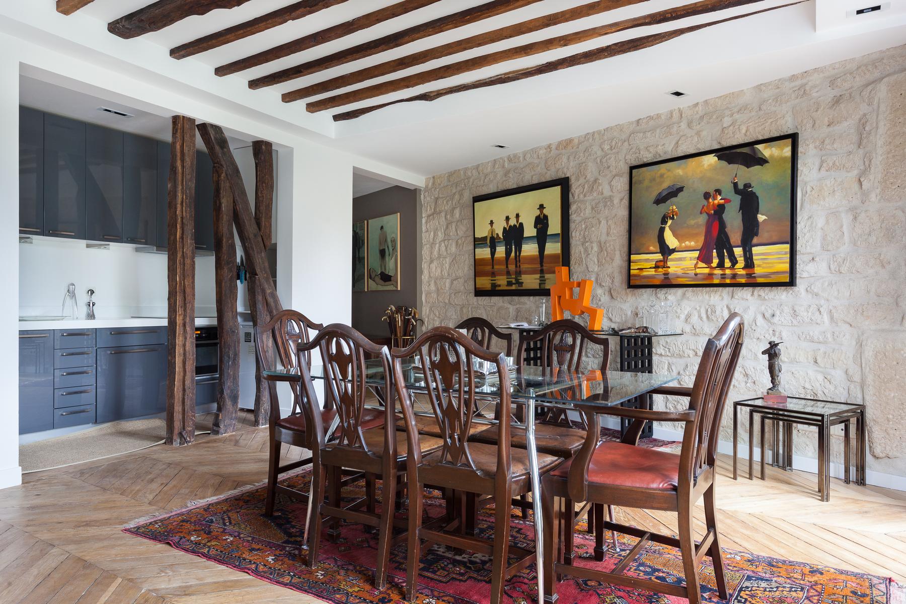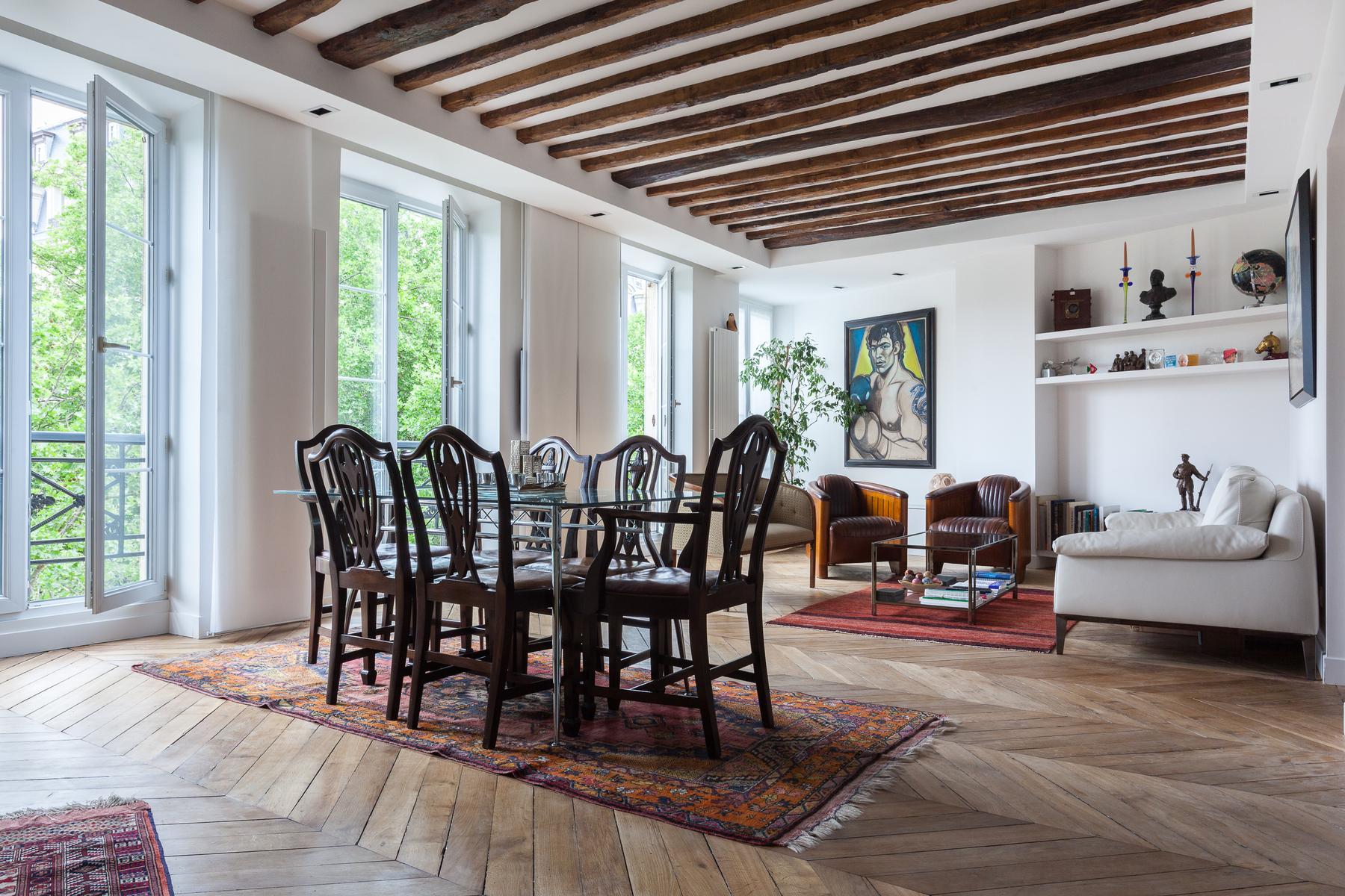Dans le quartier chic du Louvre – Opéra, vous trouverez la rue Coquillière à trois étages au-dessus d’un boulevard particulièrement grand. Et l’intérieur de la maison de ce passionné d’art est plutôt impressionnant aussi. Vous entrez dans un couloir bordé d’images et l’espace de vie ouvert est droit devant vous. Simplement meublée, avec une élégante table à manger à une extrémité et un canapé aux couleurs douces au-delà, cette chambre est mise en valeur par son mur de pierre apparente, son plafond à poutres et ses œuvres d’art originales.
