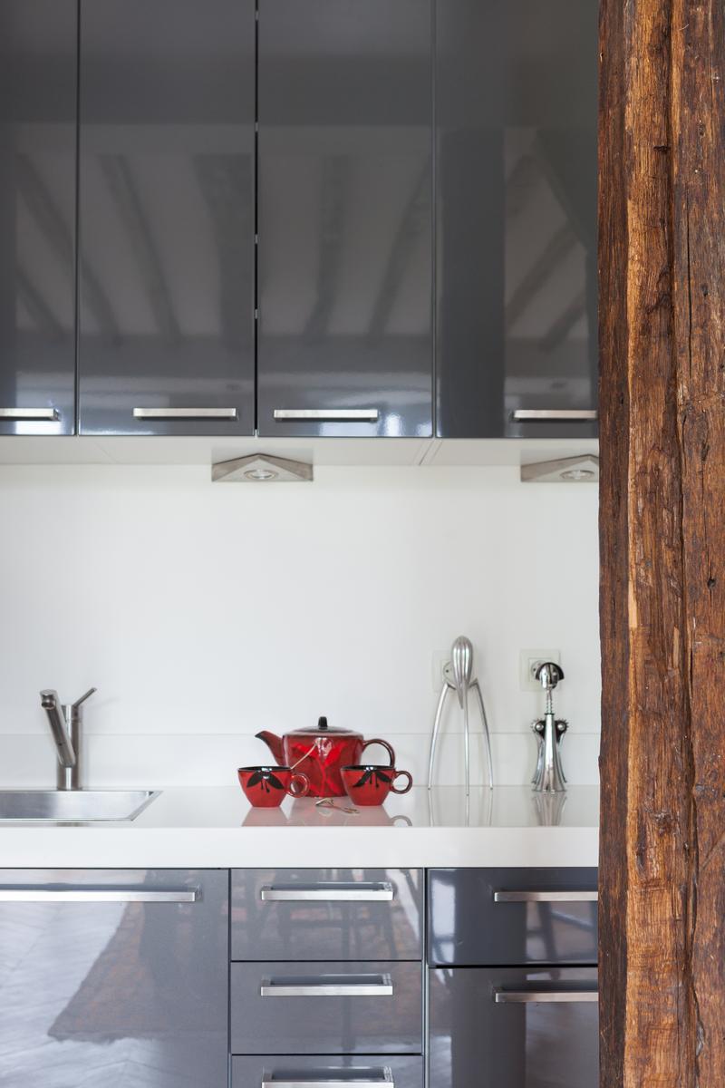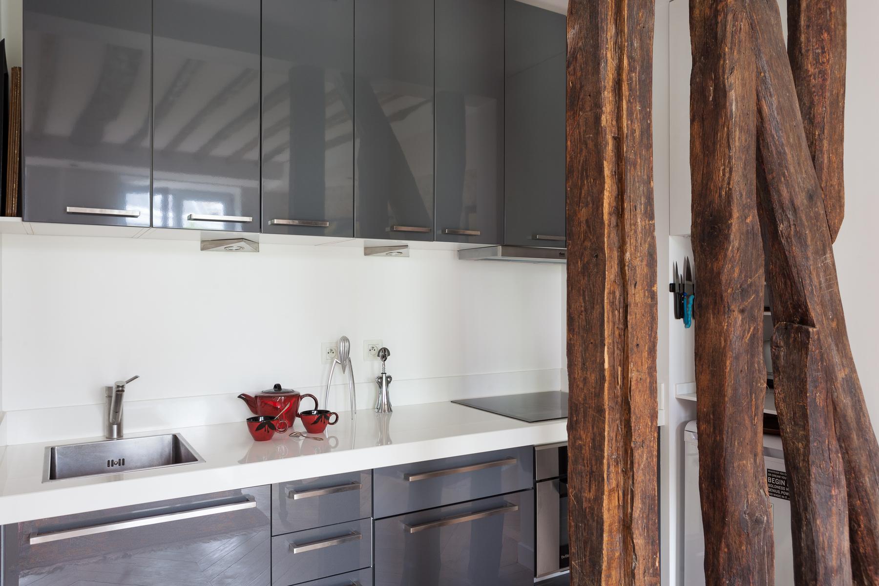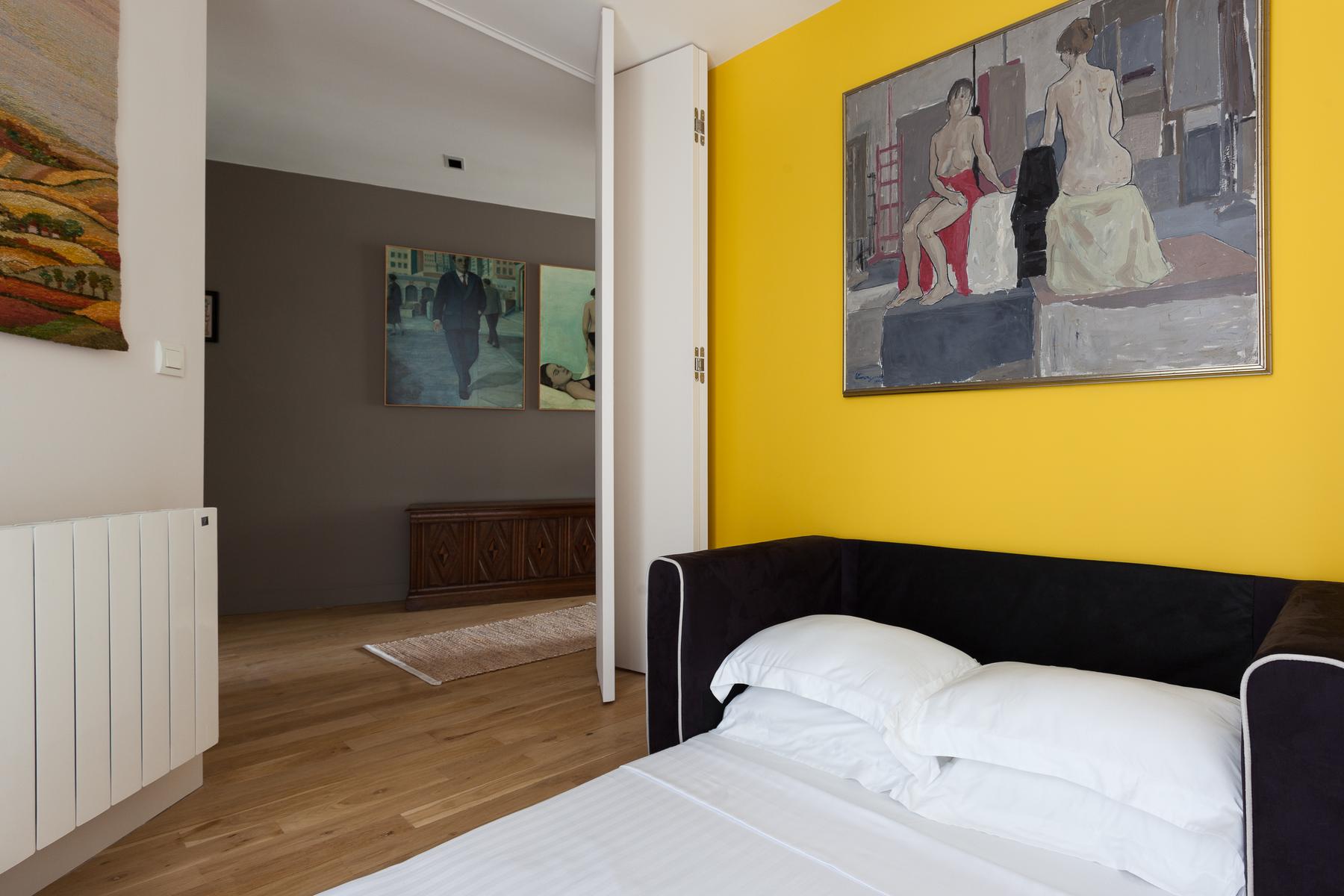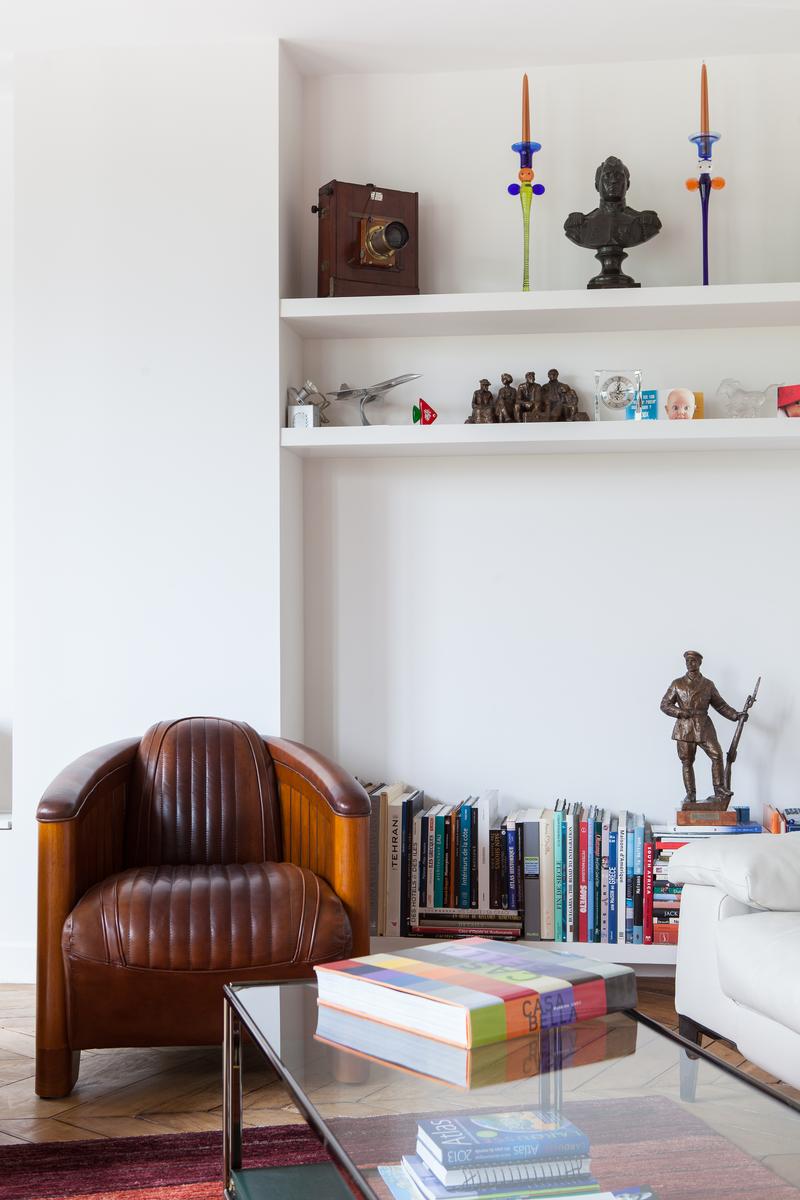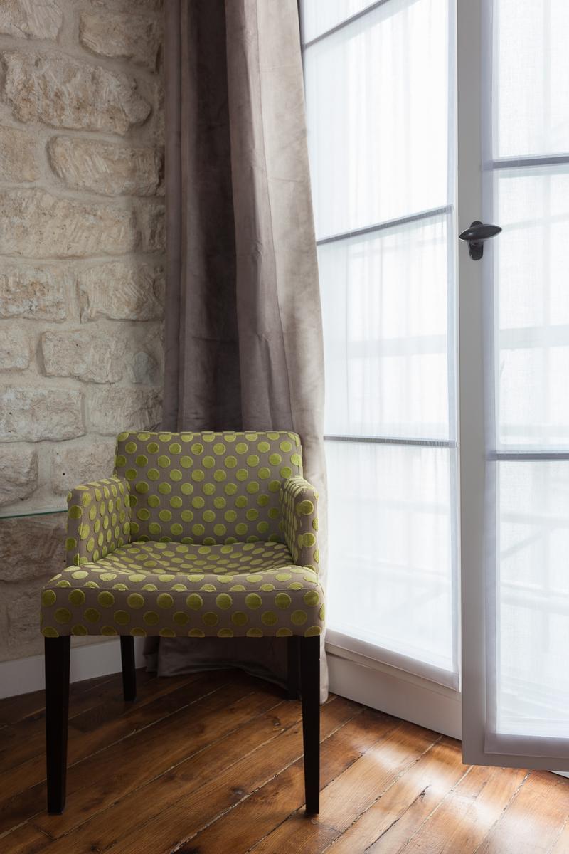 Dans le quartier chic du Louvre – Opéra, vous trouverez la rue Coquillière à trois étages au-dessus d’un boulevard particulièrement grand. Et l’intérieur de la maison de ce passionné d’art est plutôt impressionnant aussi. Vous entrez dans un couloir bordé d’images et l’espace de vie ouvert est droit devant vous. Simplement meublée, avec une élégante table à manger à une extrémité et un canapé aux couleurs douces au-delà, cette chambre est mise en valeur par son mur de pierre apparente, son plafond à poutres et ses œuvres d’art originales.