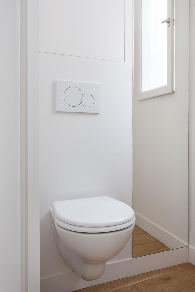 À droite, juste après la cuisine, se trouve la chambre des maîtres, qui a un lit queen-size. Puis, de retour dans le hall d’entrée, il y a une salle de toilette et une salle de bain élégante au fond d’un passage à gauche, et un deuxième salon (en jaune vif) à droite.