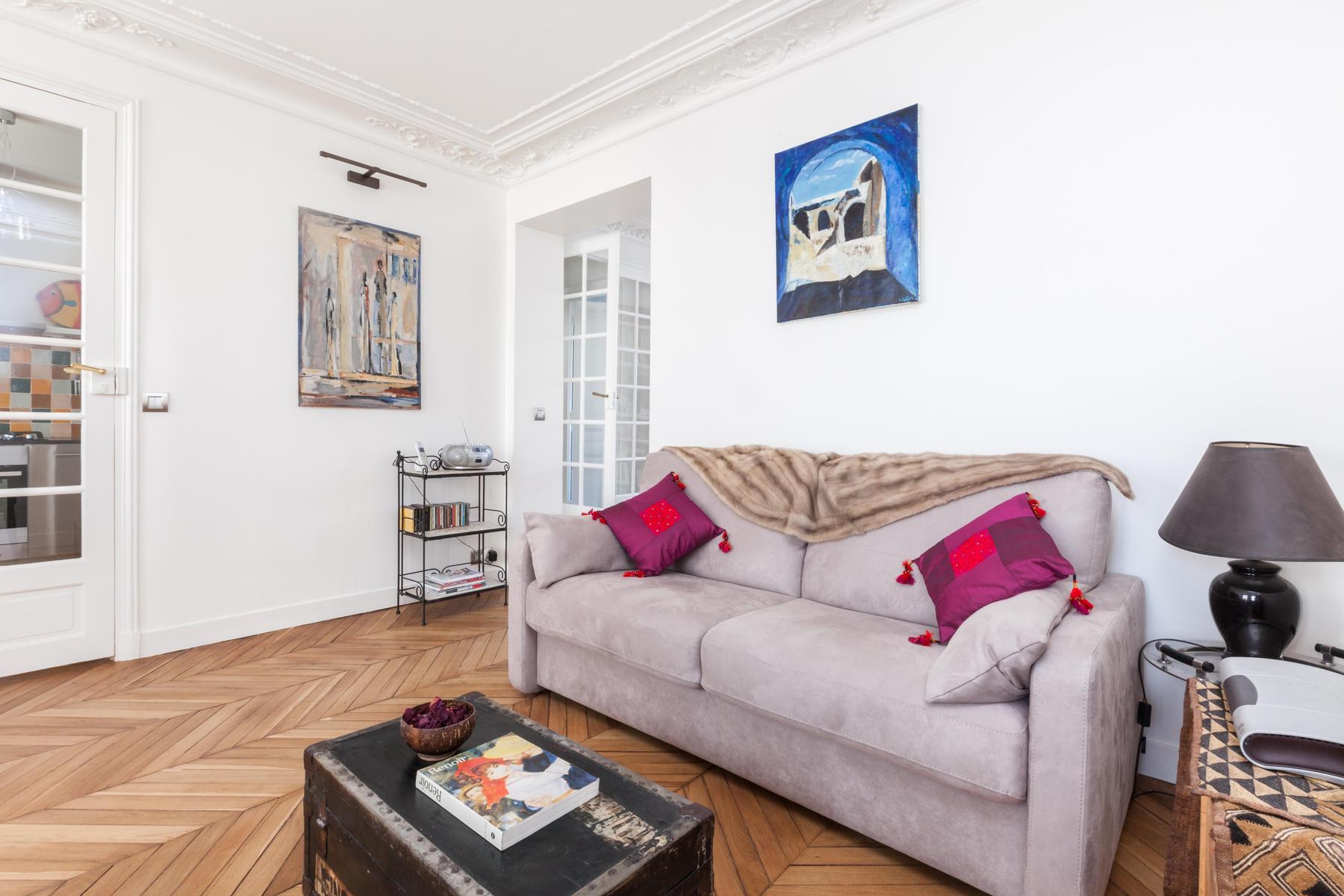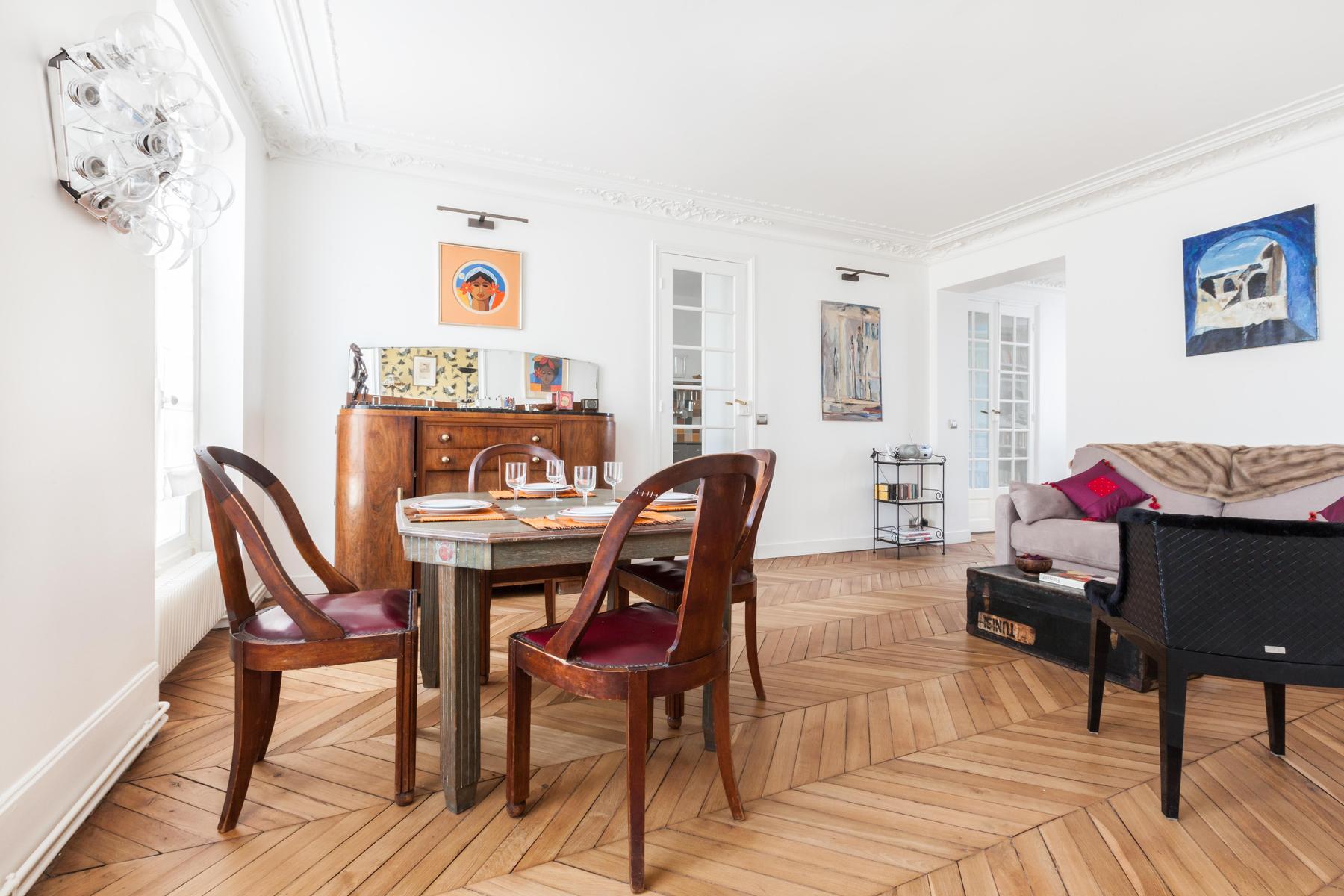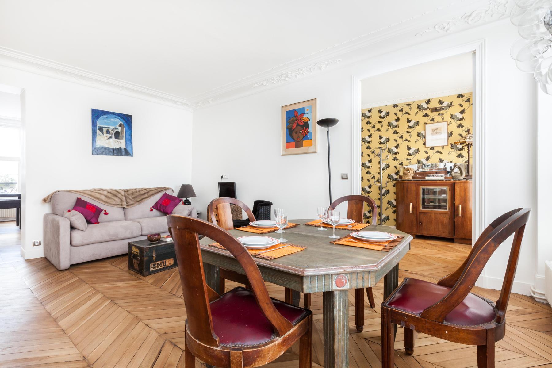 When you set out across crystal oceans, who knew you’d arrive where the breeze is balmy and flowers bloom bright whether it’s December or July. Rue d’Amsterdam is a cheerful hideaway on the fourth floor, where sprawling rooms are filled with luminous art, shelves of books and colourful objets that have travelled from afar. And Batignolles is an equally dynamic area of the city, a walk from the wistful alleyways of Montmartre and close to the cafés that cluster around Gare Saint-Lazare. But don’t stray too far –in this apartment all the glories of the world are spread before you in dazzling, infinite array.