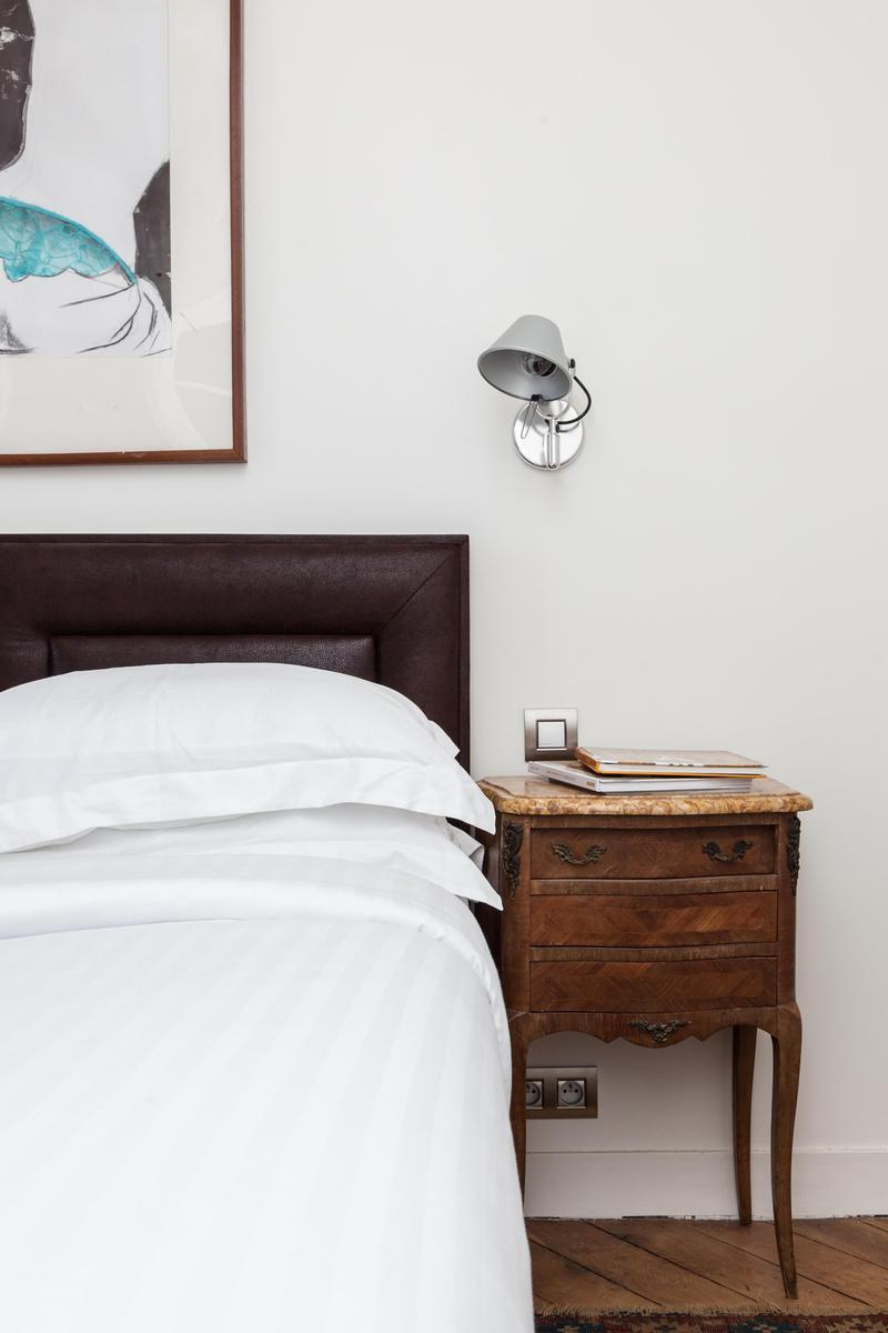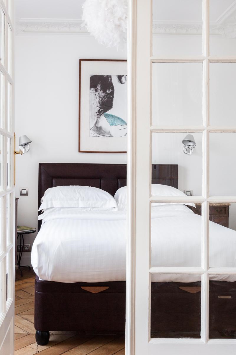 Rue d’Amsterdam’s rooms all flow outwards from a central study, where you’ve a contemporary ghost chair, black and white photography and a chic, angular writing desk. The open-plan sitting room features an octagonal dining table with majestic dark wood and cherry leather chairs, while the sleek chrome kitchen is cheered by a romantic window seat and spicy tiles. Characterful and uncluttered, one bedroom is decorated with floral prints the colour of golden shores, the other white sands, and the bathroom has the feel of a hammam with its grand shower and intricate tiling in deepest turquoise.