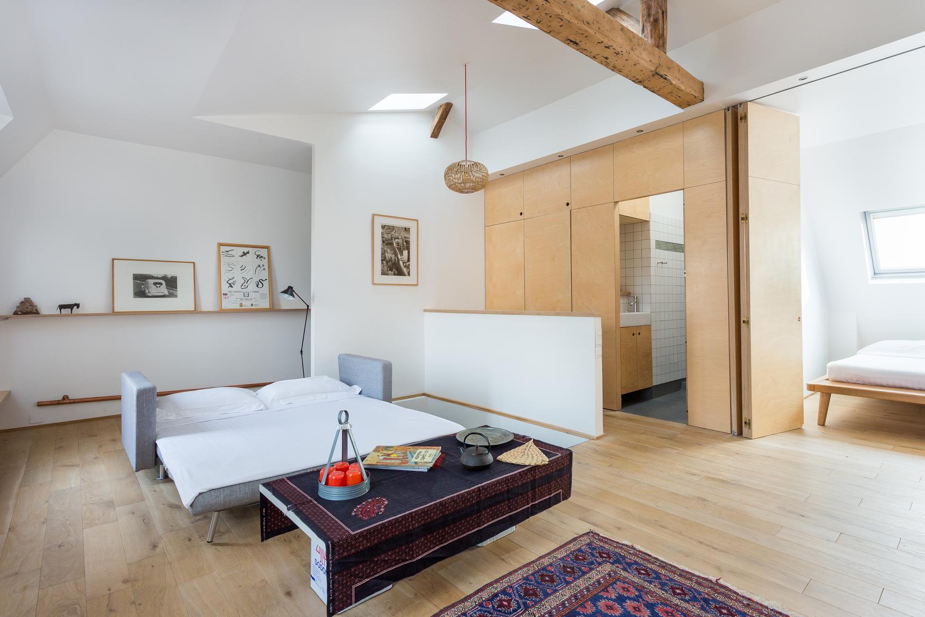 C’est Notre-Dame, les courbes de la Seine et les rangées de restaurants qui font la renommée de l’île de la Cité. Mais il y a un côté secret – des places tranquilles et des marchés que seuls les locaux connaissent. Et la rue d’Arcole, où les grandes fenêtres à volets, les planchers de bois brillant et les poutres vieillies sont classiques et complètent les canapés crème et les pièces anciennes. Mais les tables et les chaises contemporaines, et la multitude de tapis et de jetés colorés, sont aussi captivants. Et l’envoûtante Notre-Dame est à moins d’une minute à pied.