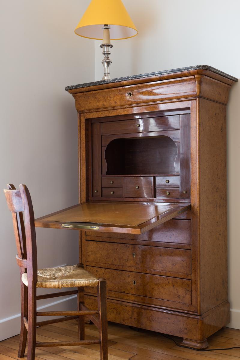 Des pops de couleurs vives et des pièces modernes rendent cette maison par ailleurs classique aussi vivante que le Louvre – Opéra lui-même. Vous entrez dans un couloir, où vous trouverez la cuisine immédiatement à droite. Il est doté d’armoires blanches, de comptoirs en bois blond et d’un bar à déjeuner assorti, le tout agrémenté de deux tabourets jaune vif. Le salon est directement en face – une pièce au sol en bois peint en blanc avec une cheminée décorative pour une pièce maîtresse. Il dispose d’un canapé et de deux fauteuils élégants, qui se tiennent sur un tapis vert chaux et sous une œuvre d’art frappante.