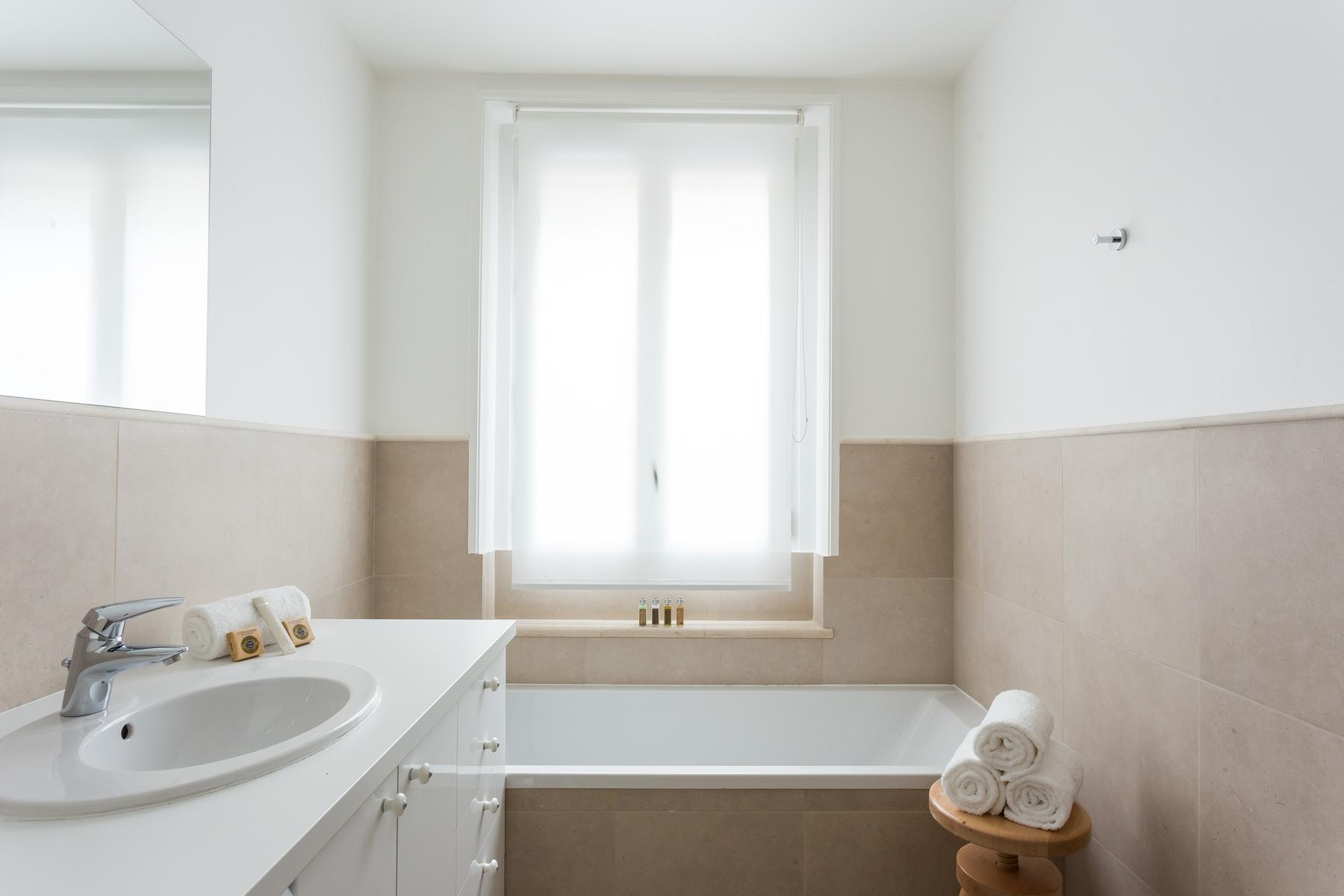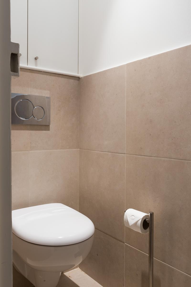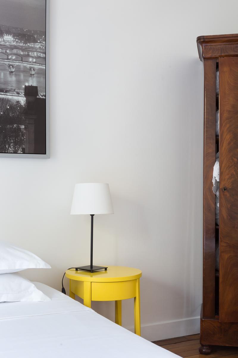 Un peu plus loin dans le couloir, vous trouverez une salle de toilettes et une salle de bains aux couleurs douces. Et puis à gauche, par la dernière porte, il y a la chambre principale. C’est un espace simple, avec quelques accessoires vifs et un paysage urbain en noir et blanc qui se trouve au-dessus du grand lit.