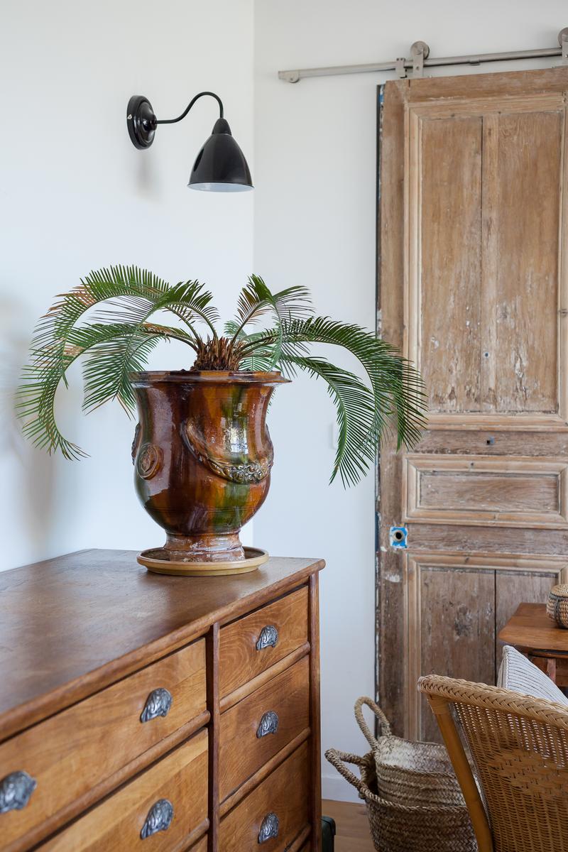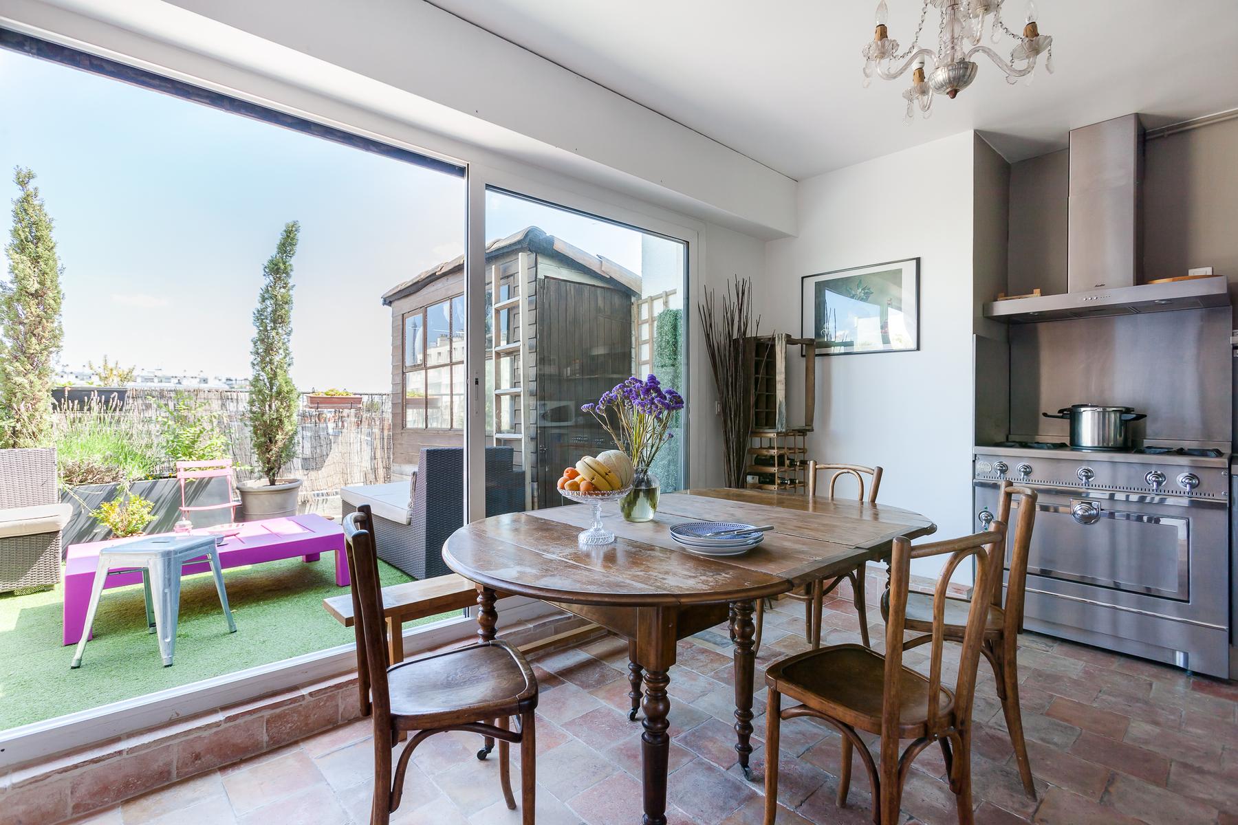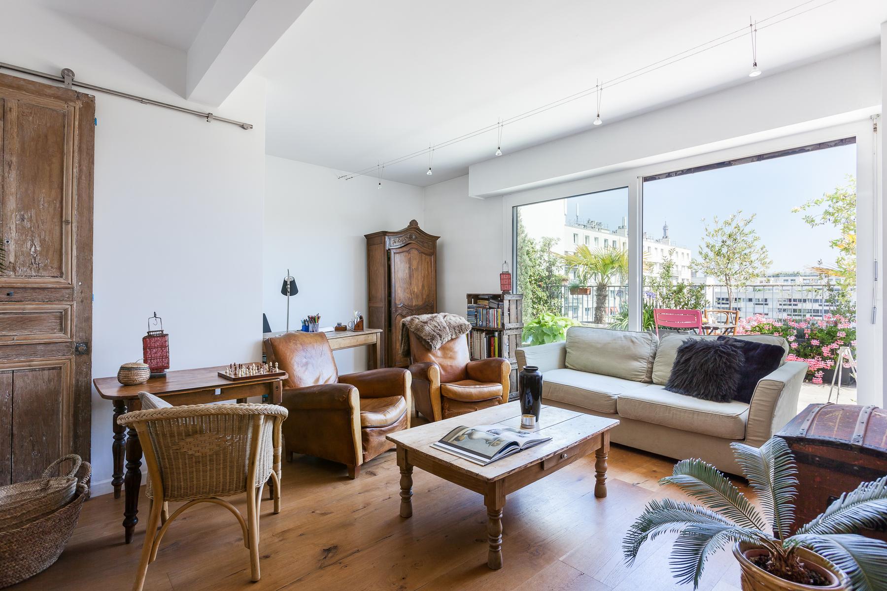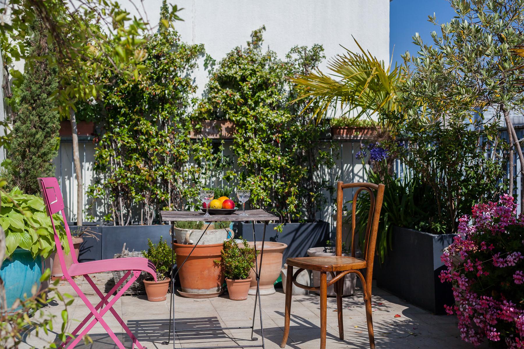 La rue de la Convention II est située à huit étages au-dessus de Vaugirard. Vous entrez dans un couloir, au bout duquel se trouve le salon. Des antiquités de caractère (nous avons trouvé le coffre en bois particulièrement charmant), des fauteuils en cuir adouci et des tapis et coussins en fourrure donnent à cette chambre une atmosphère détendue. Elle jouxte la cuisine tout aussi accueillante – peinte au pastel, avec une table familiale classique – à droite. Dans les deux pièces, de larges fenêtres s’ouvrent sur la terrasse surélevée de cette maison, où vous trouverez un canapé en osier, entouré de plantes florissantes, et une vue de Paris d’en haut.