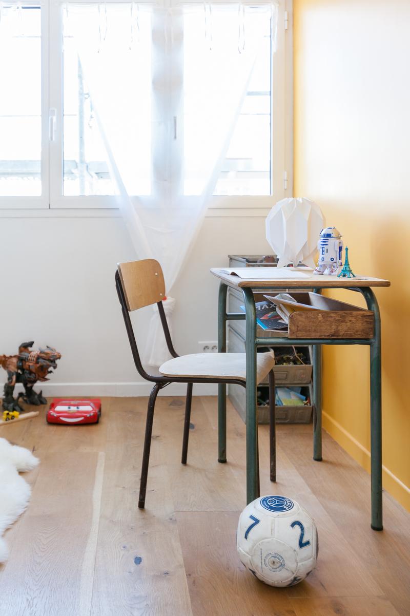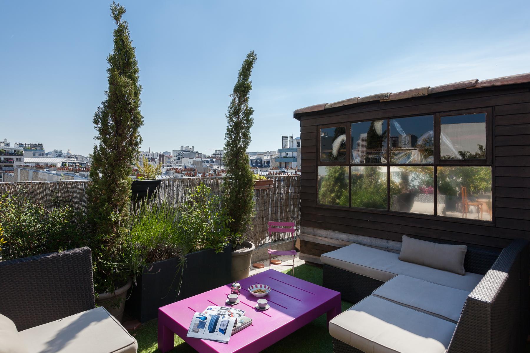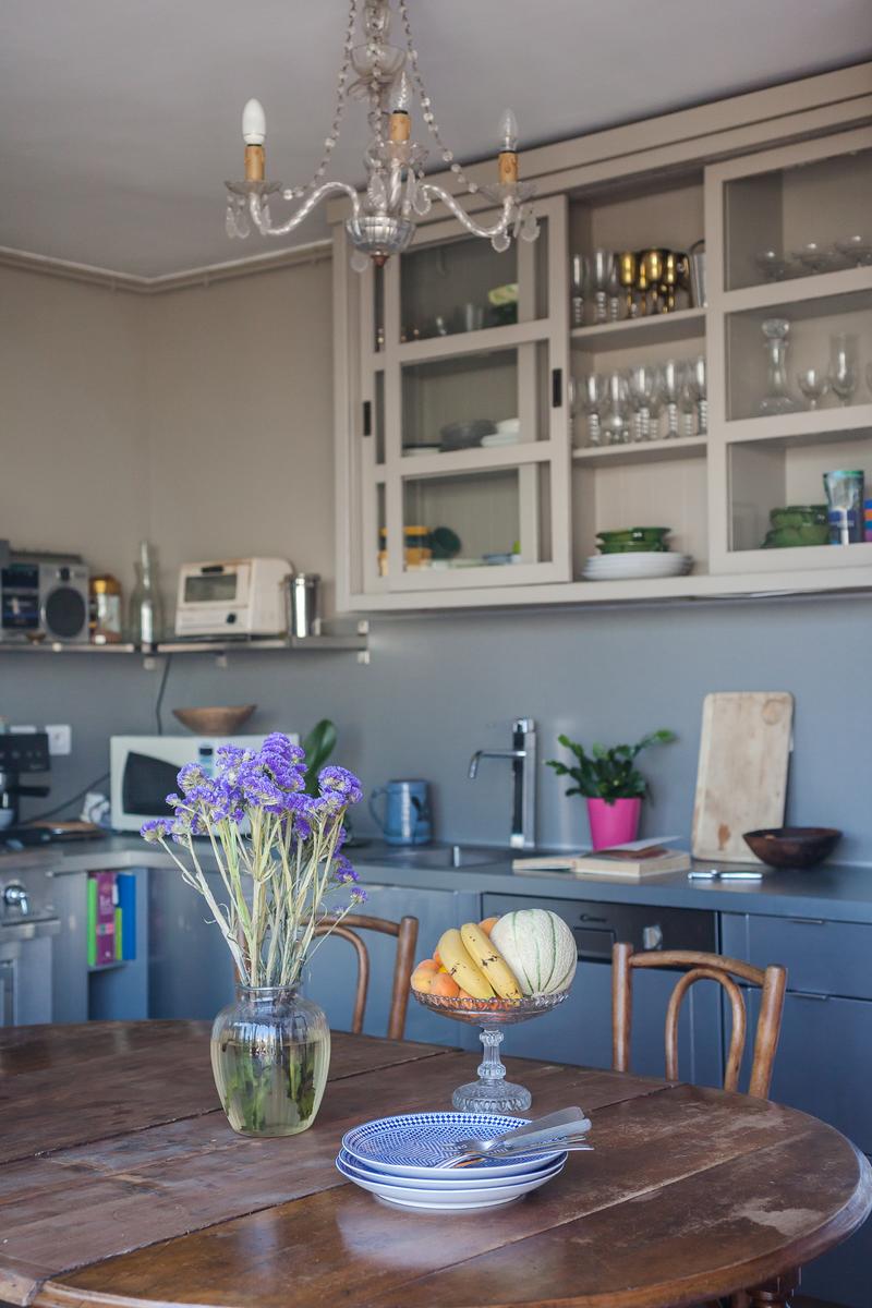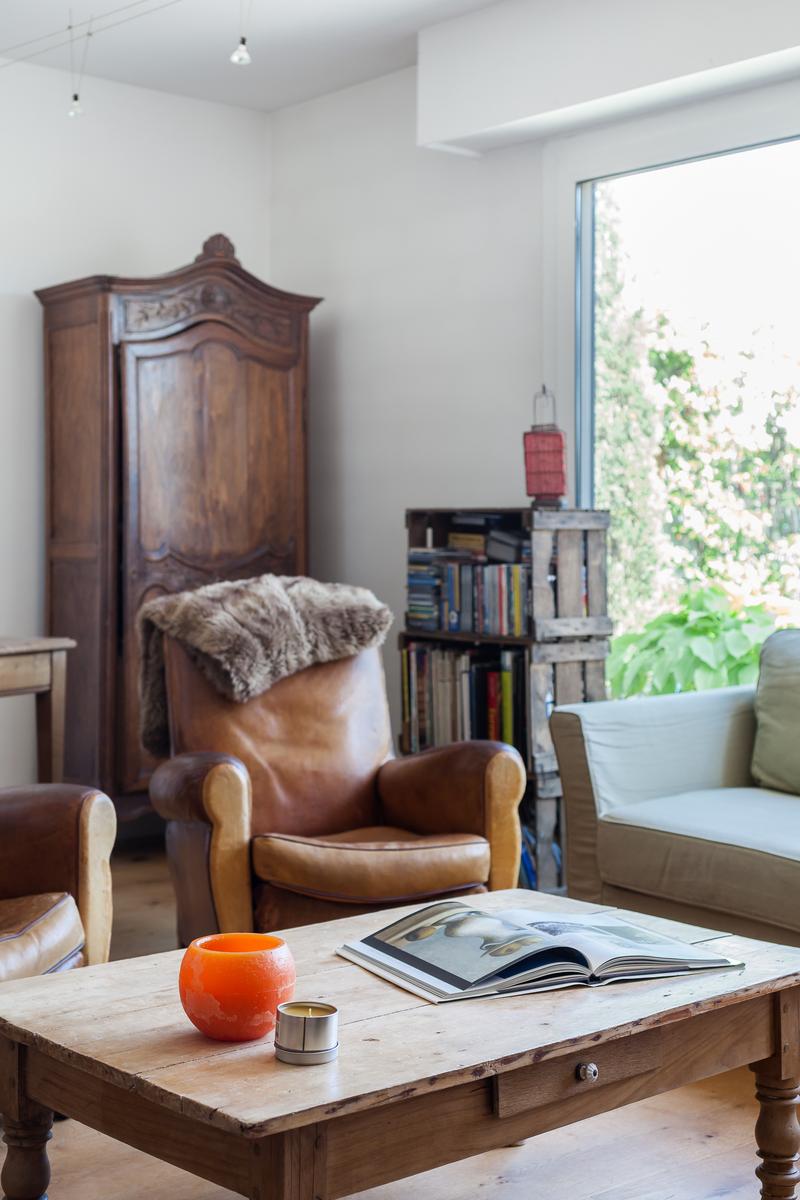 La rue de la Convention II est située à huit étages au-dessus de Vaugirard. Vous entrez dans un couloir, au bout duquel se trouve le salon. Des antiquités de caractère (nous avons trouvé le coffre en bois particulièrement charmant), des fauteuils en cuir adouci et des tapis et coussins en fourrure donnent à cette chambre une atmosphère détendue. Elle jouxte la cuisine tout aussi accueillante – peinte au pastel, avec une table familiale classique – à droite. Dans les deux pièces, de larges fenêtres s’ouvrent sur la terrasse surélevée de cette maison, où vous trouverez un canapé en osier, entouré de plantes florissantes, et une vue de Paris d’en haut.