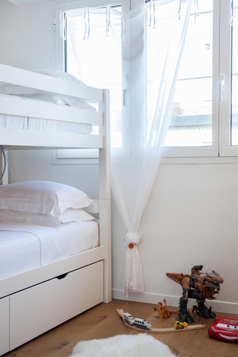 Les chambres à coucher de la maison sont situées le long du couloir à gauche du salon. Il y a d’abord une douce chambre à coucher superposée, puis une élégante salle de bain (avec un bain à roulettes) et une salle de toilette. La dernière à gauche est la chambre à coucher principale, qui est gris pâle et agréablement paisible.