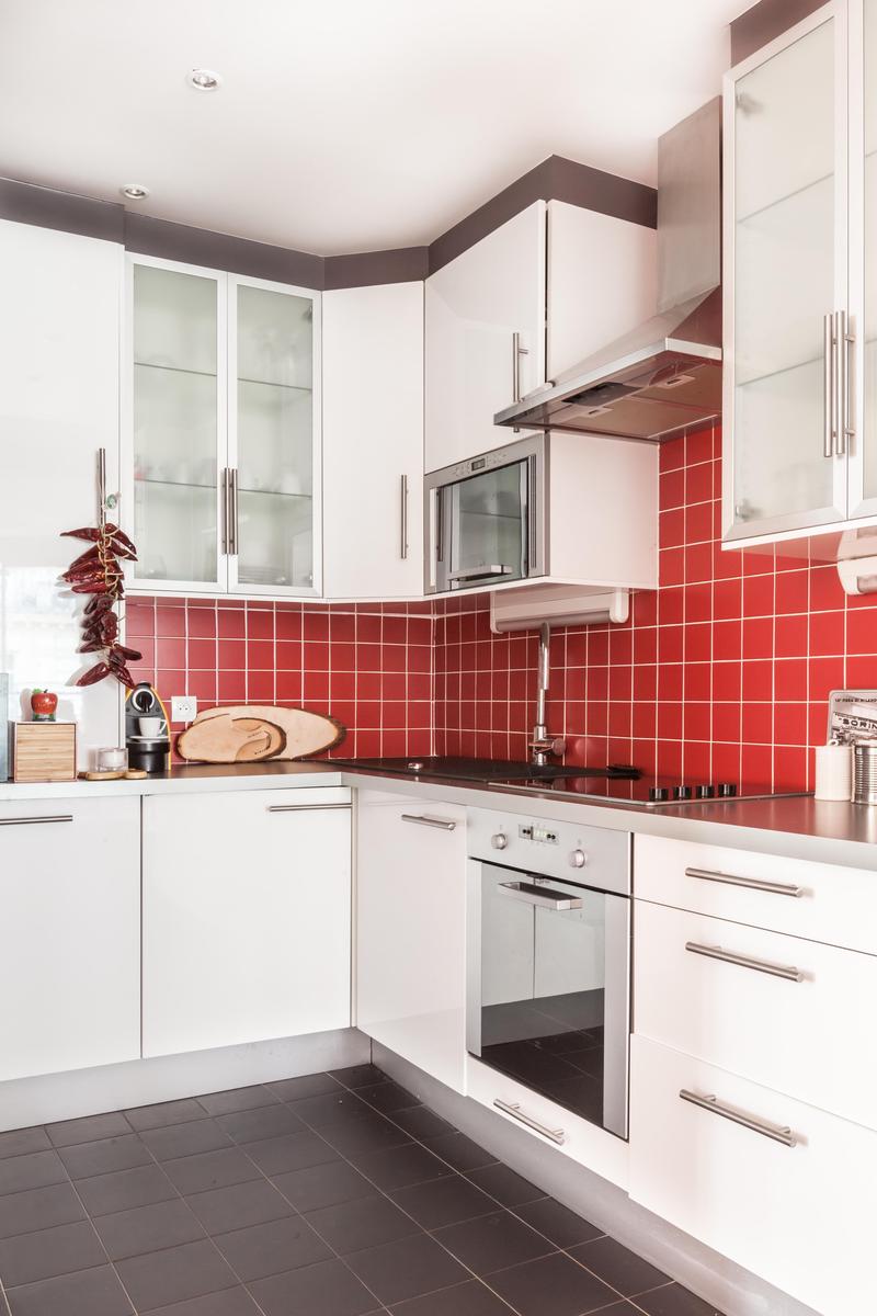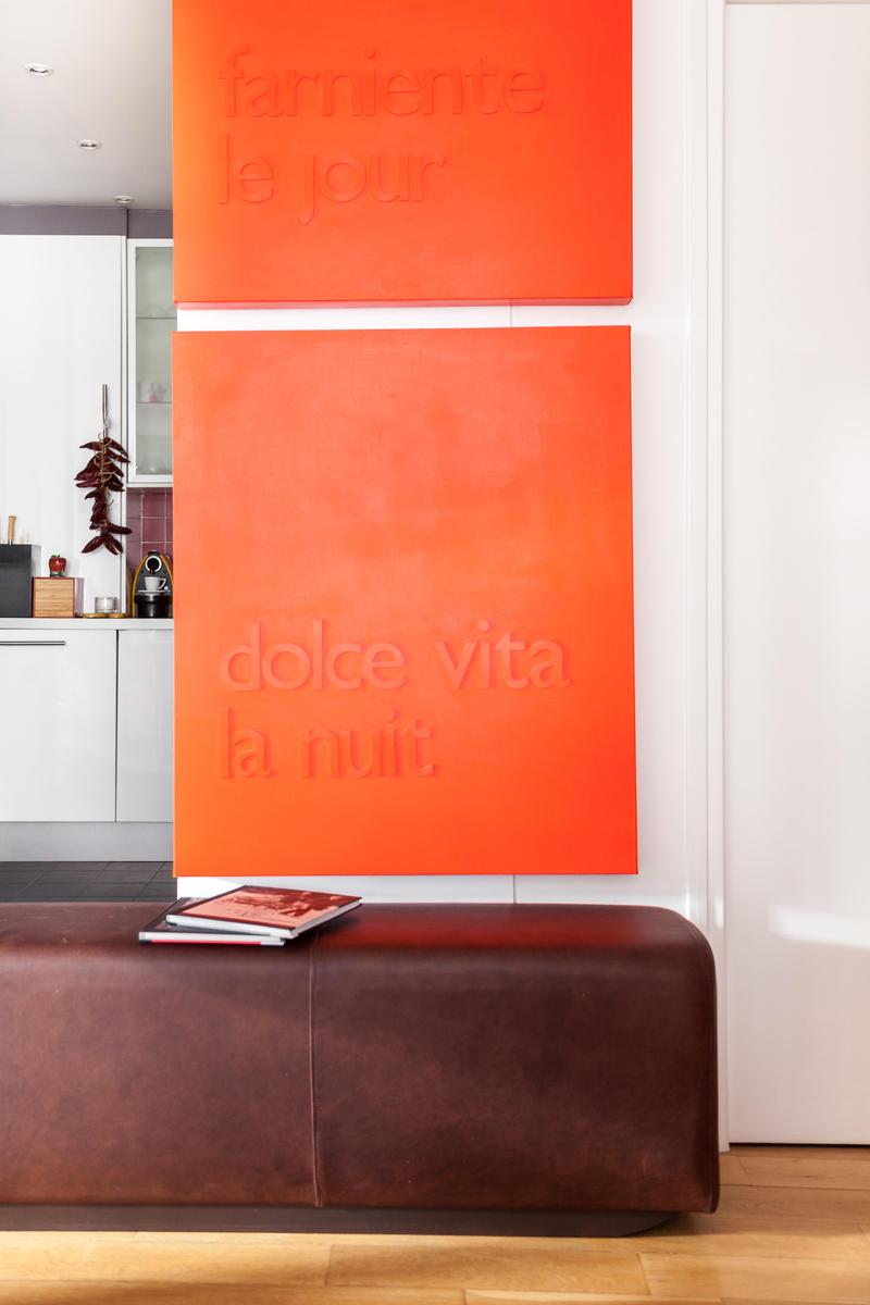 Les deux salles de bains sont toutes neuves dans un rouge fascinant, et la cuisine moderne est élégante avec du chrome poli. Et tandis que le balcon est luxuriant avec des éclats orange juteux, la chambre principale est toute rougeoyante dans un jaune soleil glorieux.