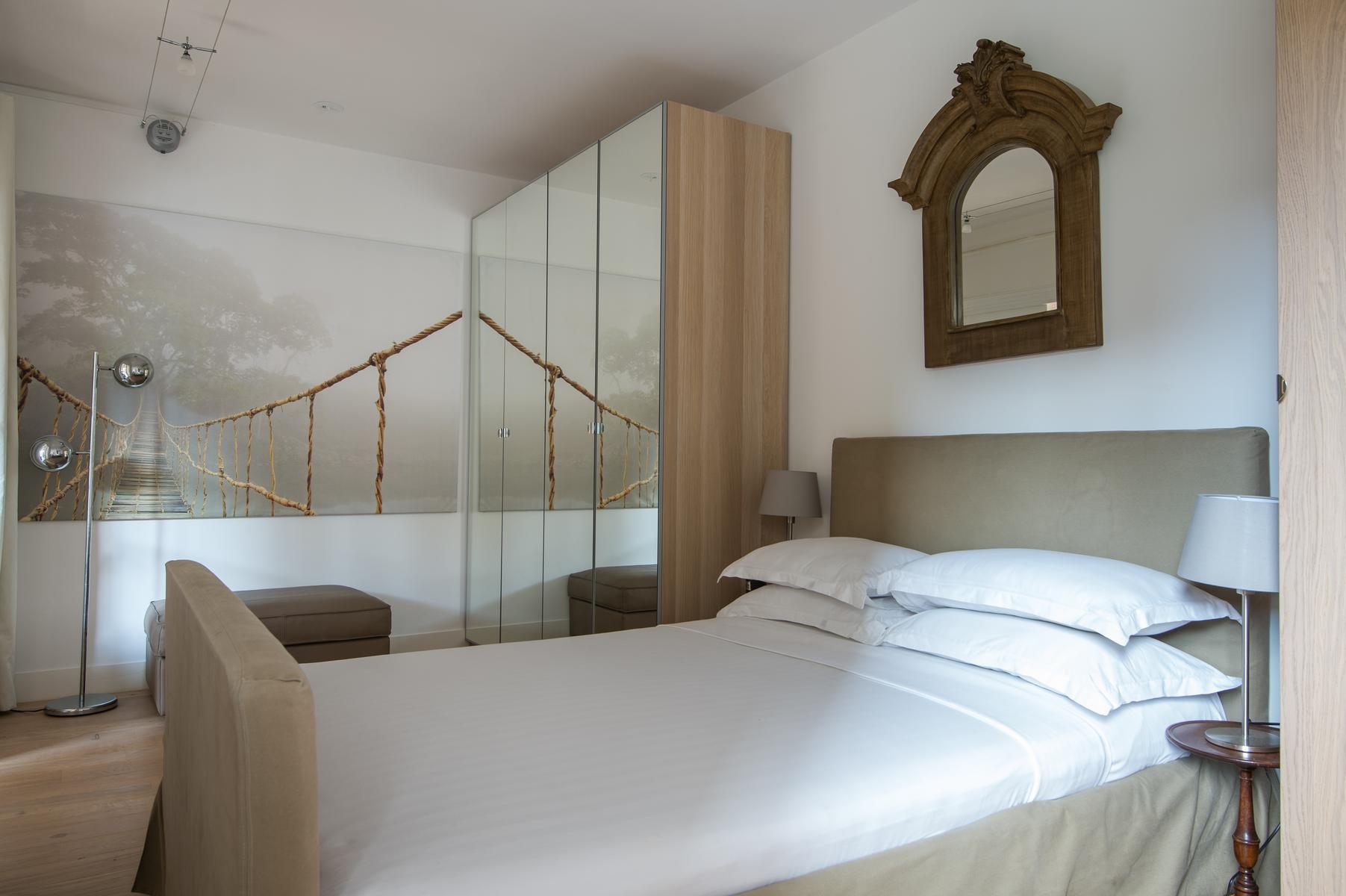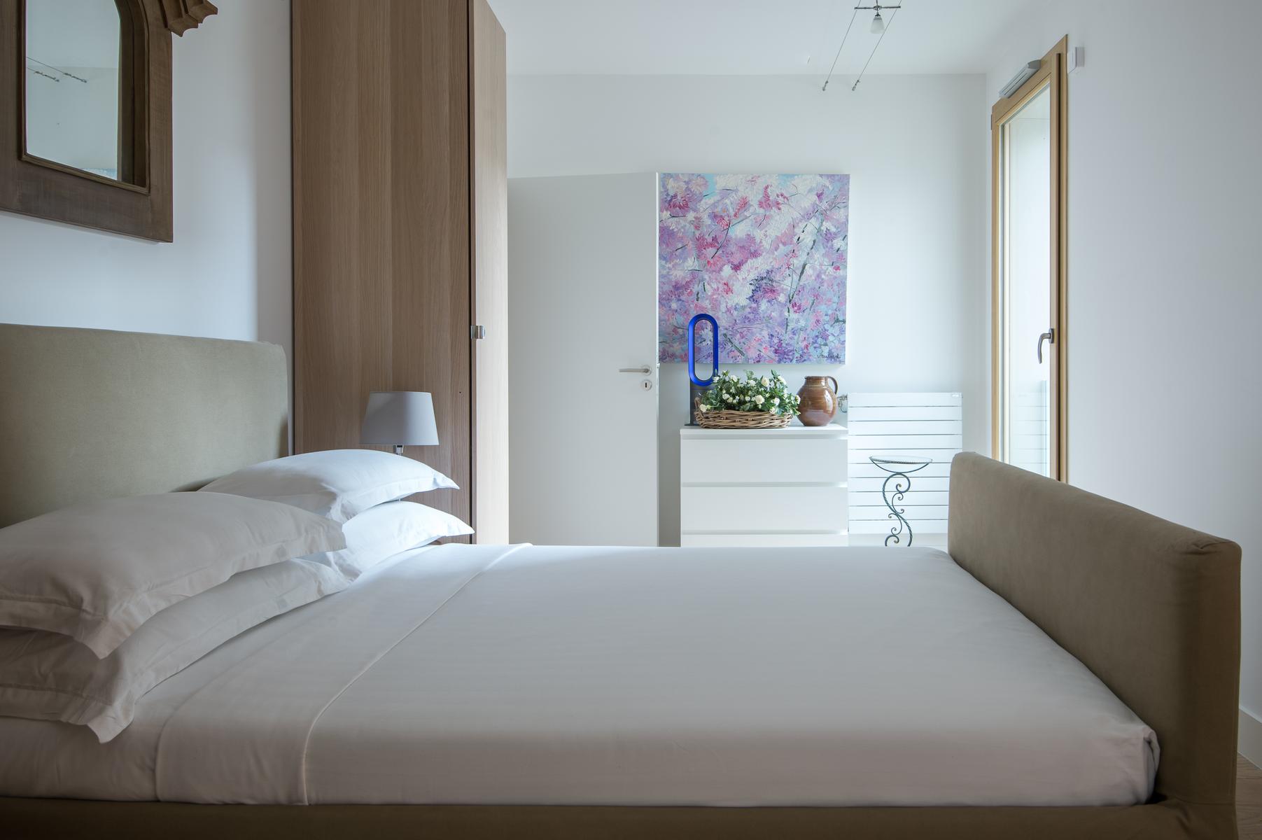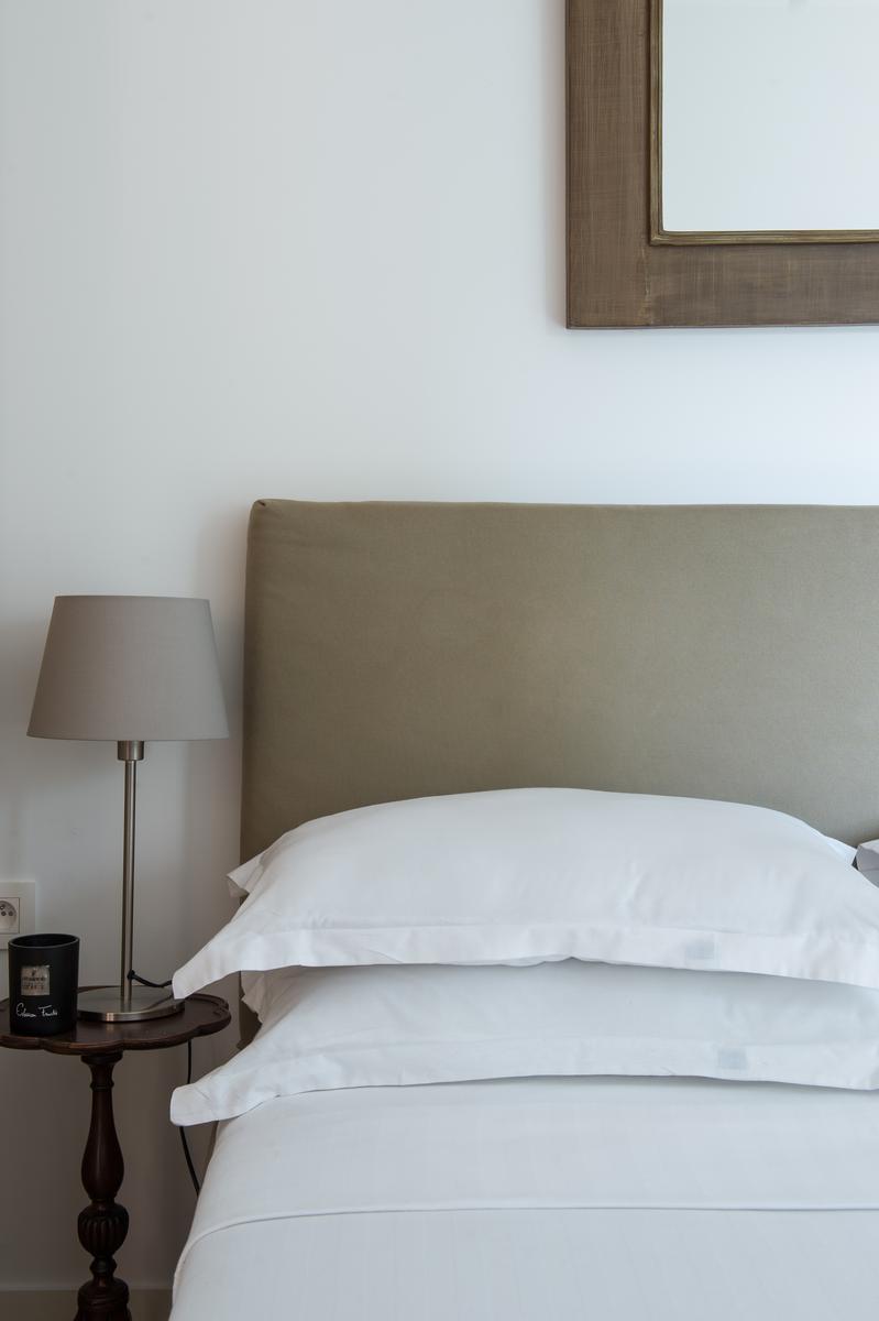 Ensuite, une porte donnant sur un côté de l’espace de vie ouvert donne accès à la cuisine contemporaine. Puis, par une deuxième porte, il y a un couloir qui mène d’abord aux toilettes et à la salle de bain élégante. Il y a aussi un bureau – simple et serein, avec un canapé-lit – et la chambre des maîtres. Ce dernier est un espace particulièrement calme, avec un lit double accueillant, des armoires miroir et plusieurs toiles apaisantes.