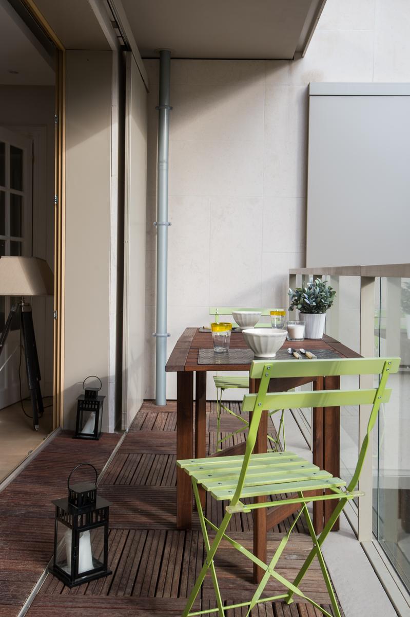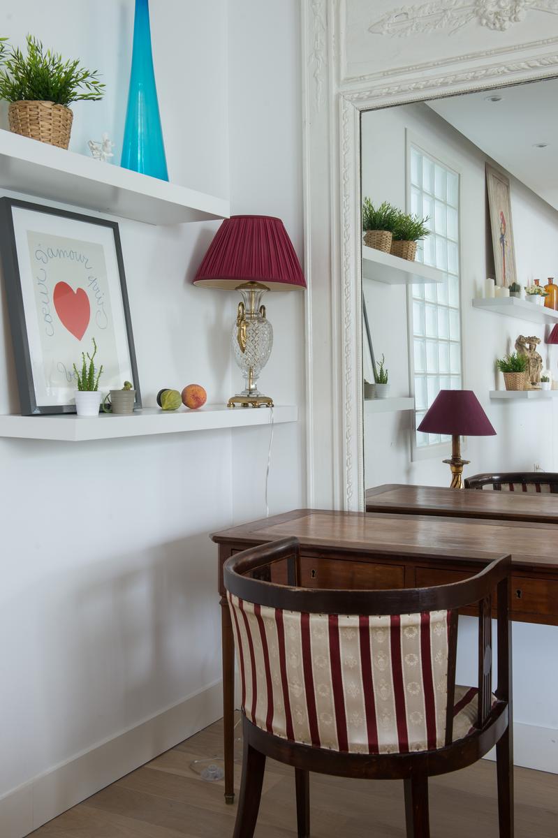A l’image d’Auteuil-Passy, la rue de la Pompe VII se veut détendue. Vous pénétrez directement dans l’espace de vie ouvert, peint en blanc et au sol en bois, égayé par ses nombreuses œuvres d’art, ses plantes en pot et ses accessoires colorés. En plus de deux canapés douillets, chacun recouvert de coussins turquoise, il y a une table à manger et un bureau antique. De larges baies vitrées s’ouvrent sur le charmant balcon de cette maison, où il y a une table pour deux personnes.