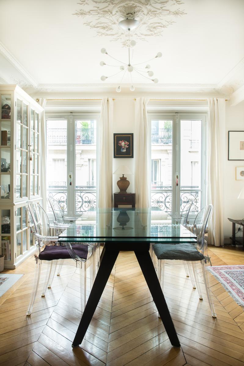 Plus loin sur la gauche se trouve le salon et la salle à manger de cette maison, un espace à plancher de bois peint en blanc avec trois grandes fenêtres. Il y a une salle à manger, sa table en verre flanquée de chaises fantômes, et au-delà, il y a un coin salon, fait de canapés de crème douce et d’étagères remplies de livres.