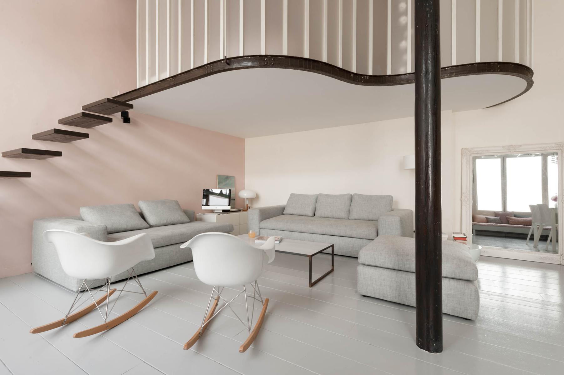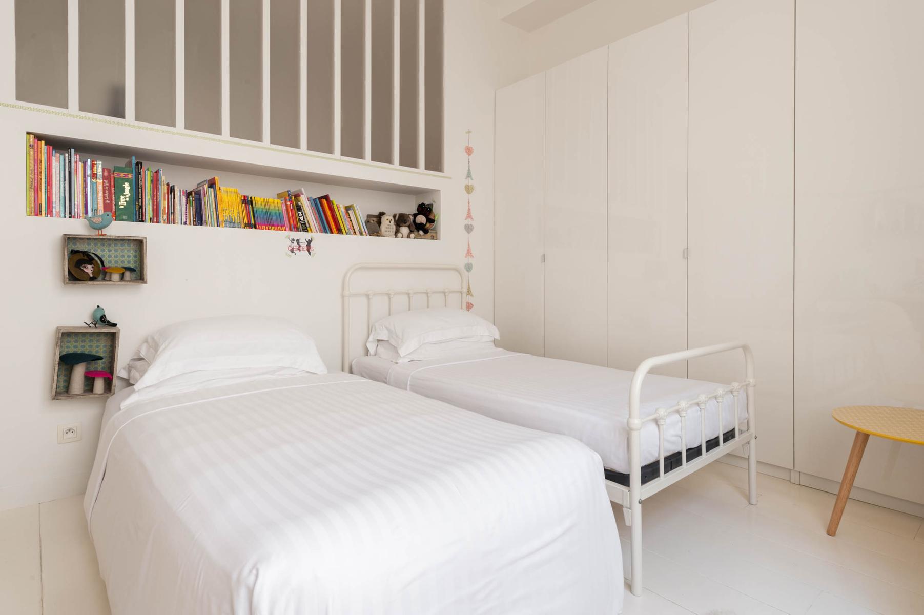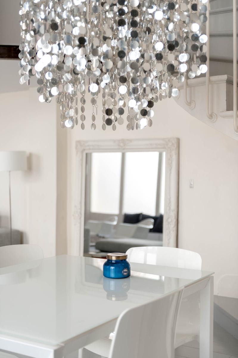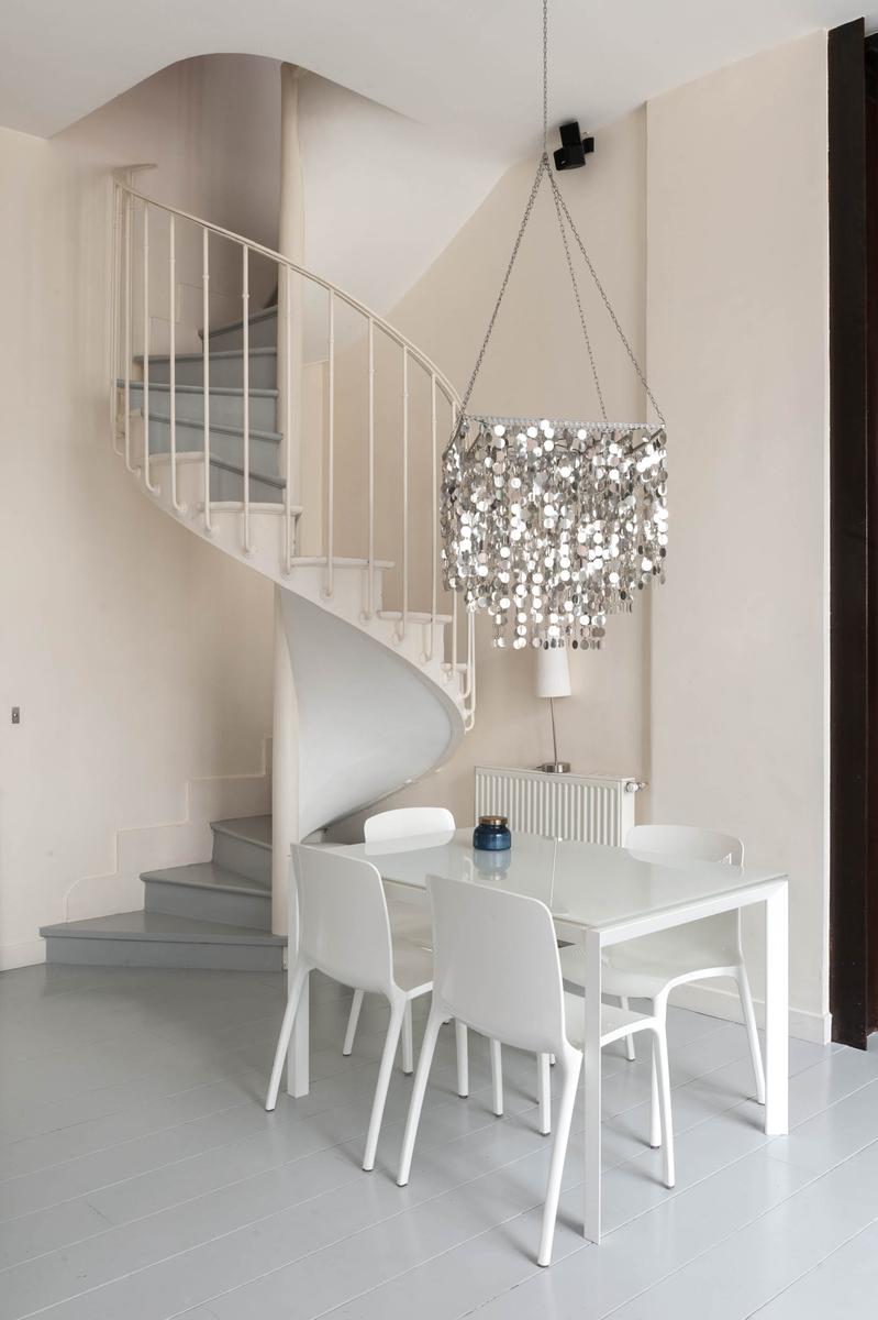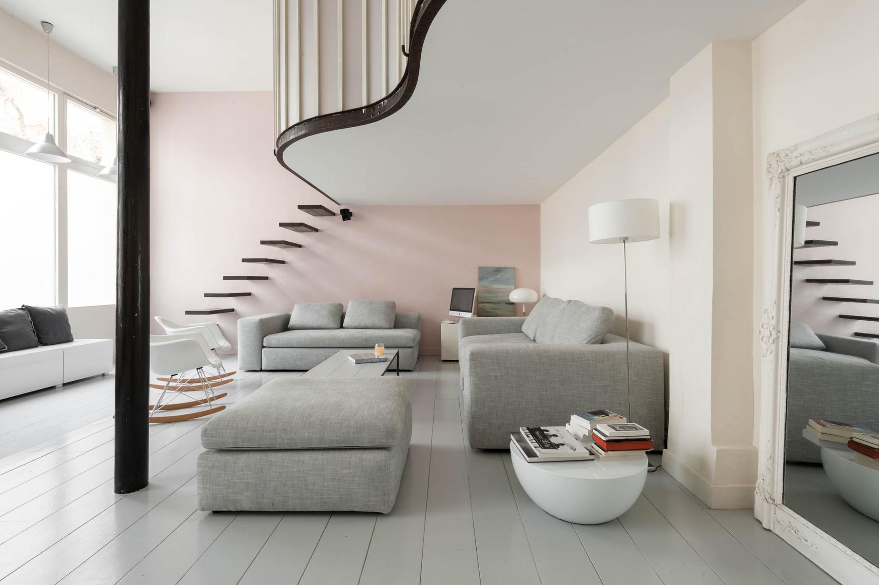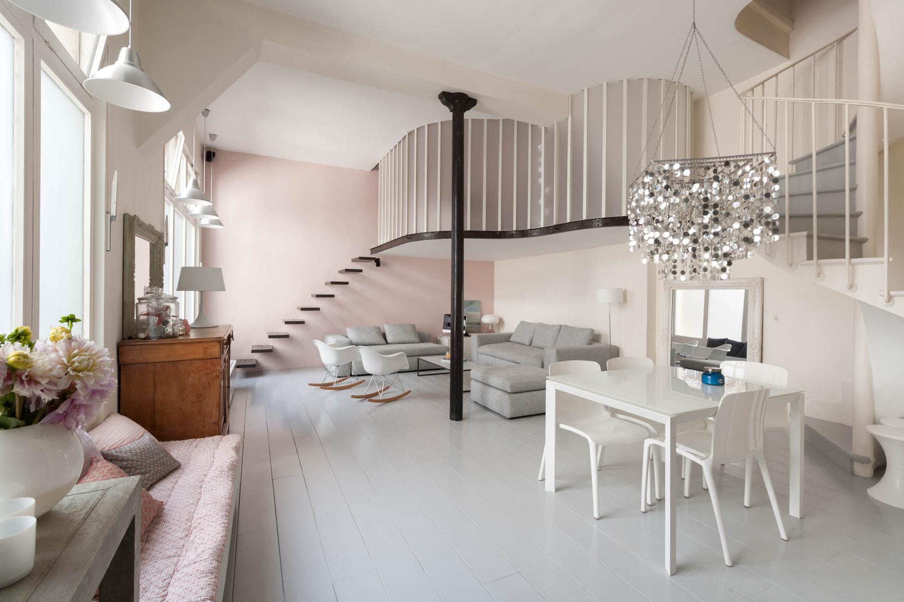 Vous entrez au rez-de-chaussée, à gauche, une cuisine avec un mur vert feuille et un bar en bois pour le petit déjeuner. Plus loin sur la gauche, il y a le salon ouvert, avec une table à manger blanche éclairée par un lustre en argent. Derrière, un escalier en colimaçon mène aux deuxième et troisième chambres (une chambre simple et une chambre superposée, toutes deux décorées dans des tons frais). La salle de bains avec une douche à l’italienne et une baignoire élégante. Après une armoire ancienne surmontée d’un miroir, vous arriverez au coin salon, dont les murs sont d’un rose tendre et les canapés gris pâle.