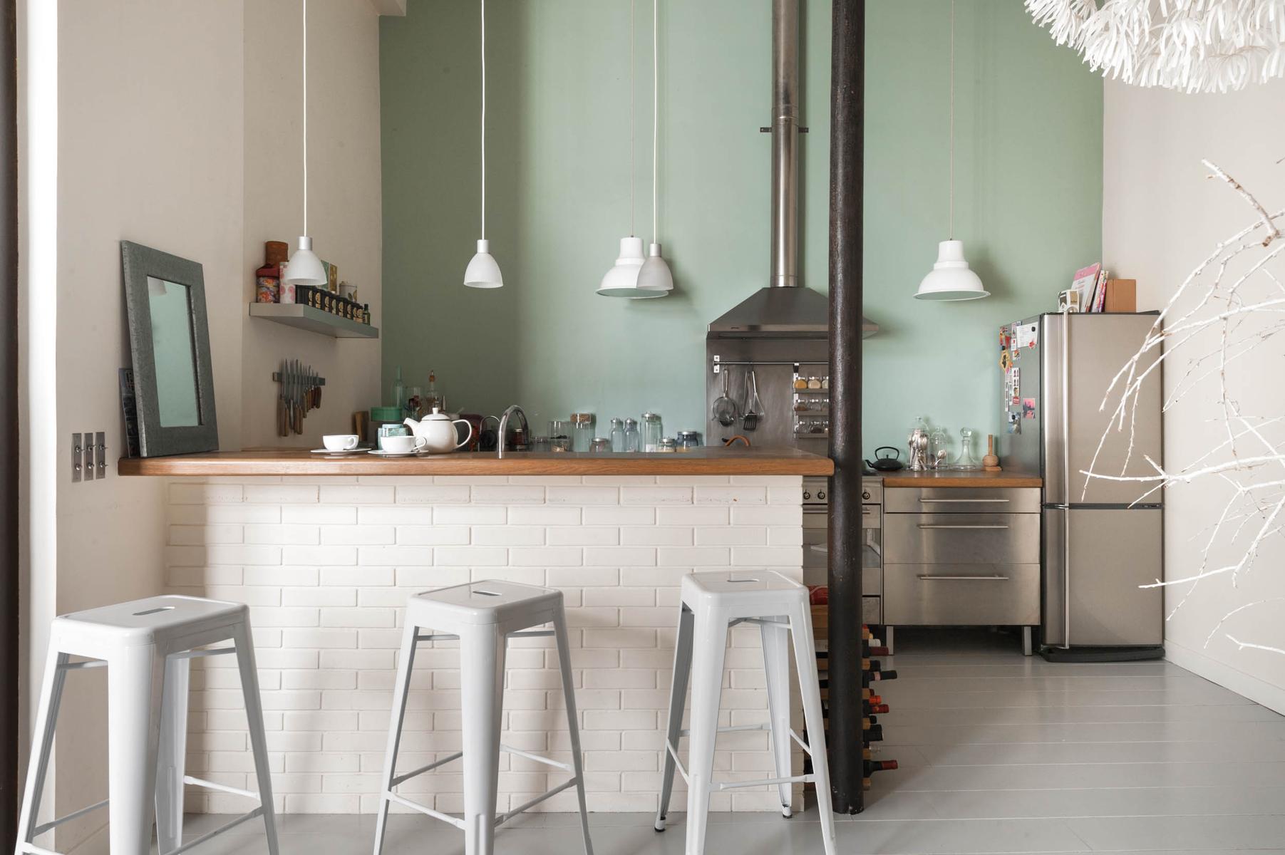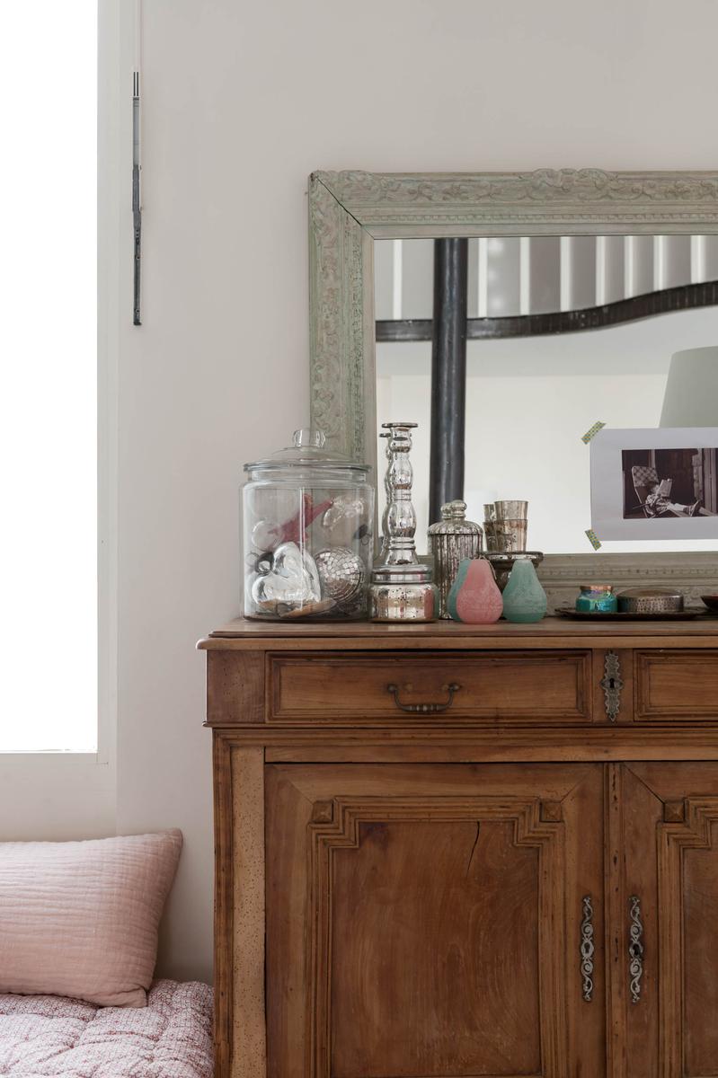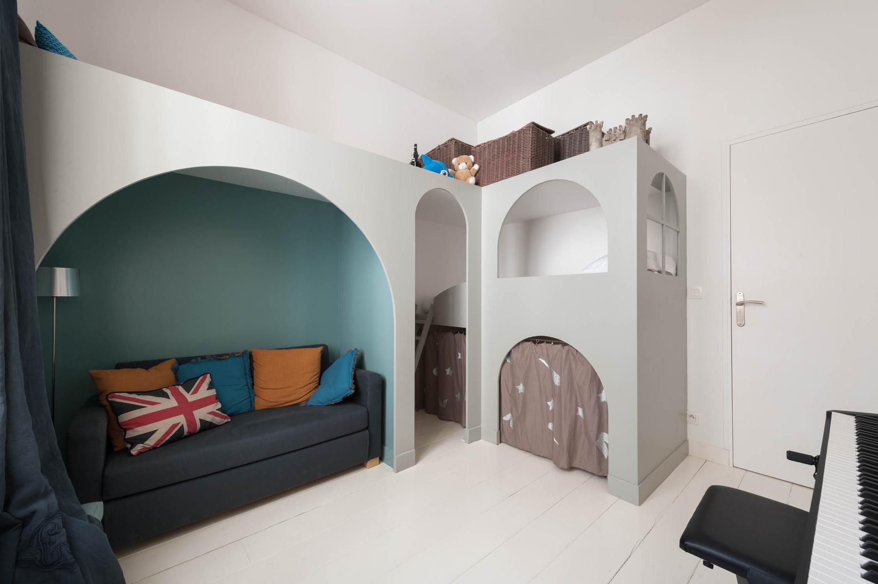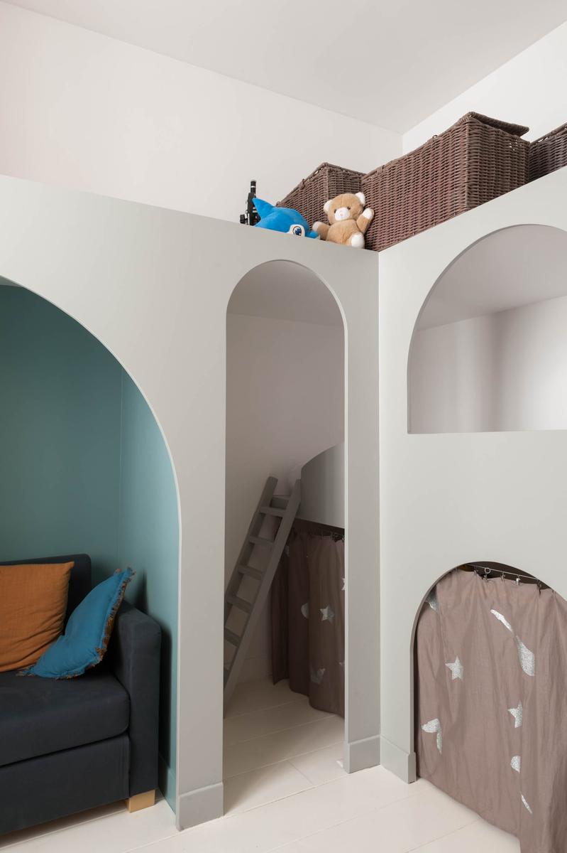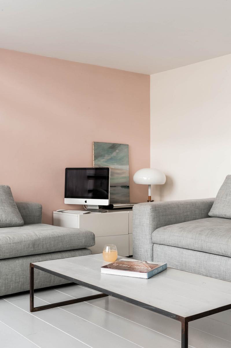 Vous entrez au rez-de-chaussée, à gauche, une cuisine avec un mur vert feuille et un bar en bois pour le petit déjeuner. Plus loin sur la gauche, il y a le salon ouvert, avec une table à manger blanche éclairée par un lustre en argent. Derrière, un escalier en colimaçon mène aux deuxième et troisième chambres (une chambre simple et une chambre superposée, toutes deux décorées dans des tons frais). La salle de bains avec une douche à l’italienne et une baignoire élégante. Après une armoire ancienne surmontée d’un miroir, vous arriverez au coin salon, dont les murs sont d’un rose tendre et les canapés gris pâle.