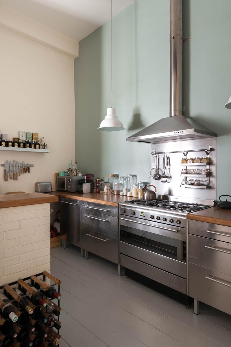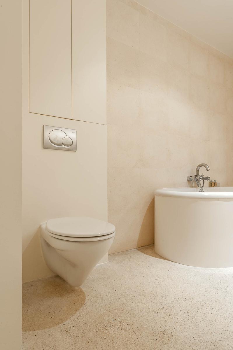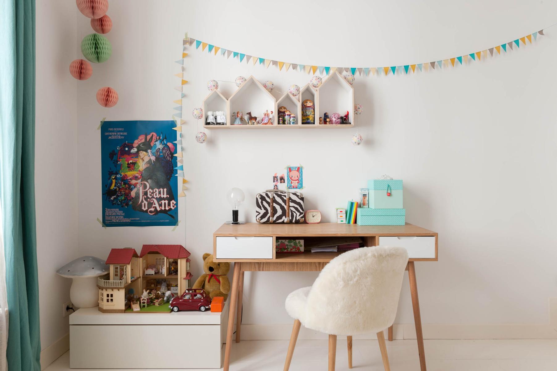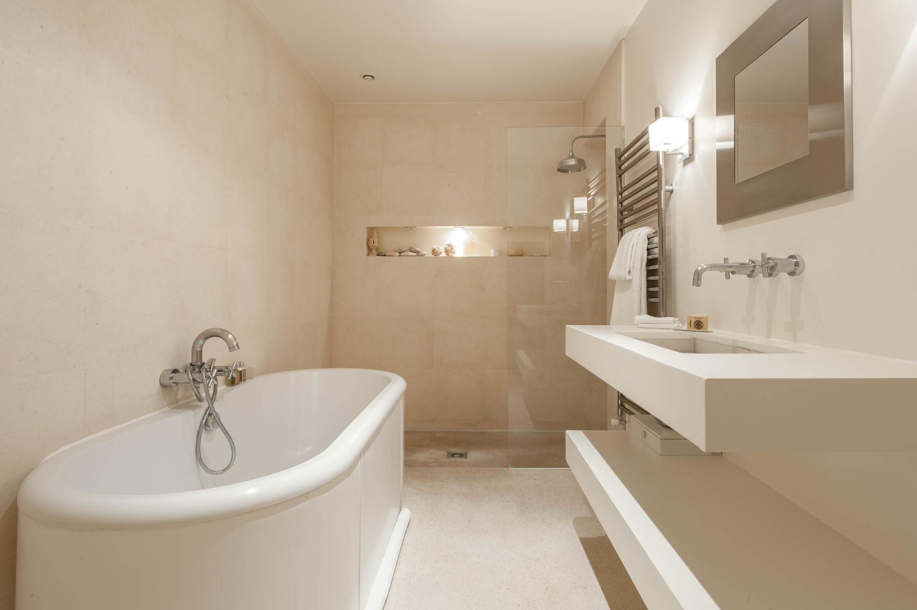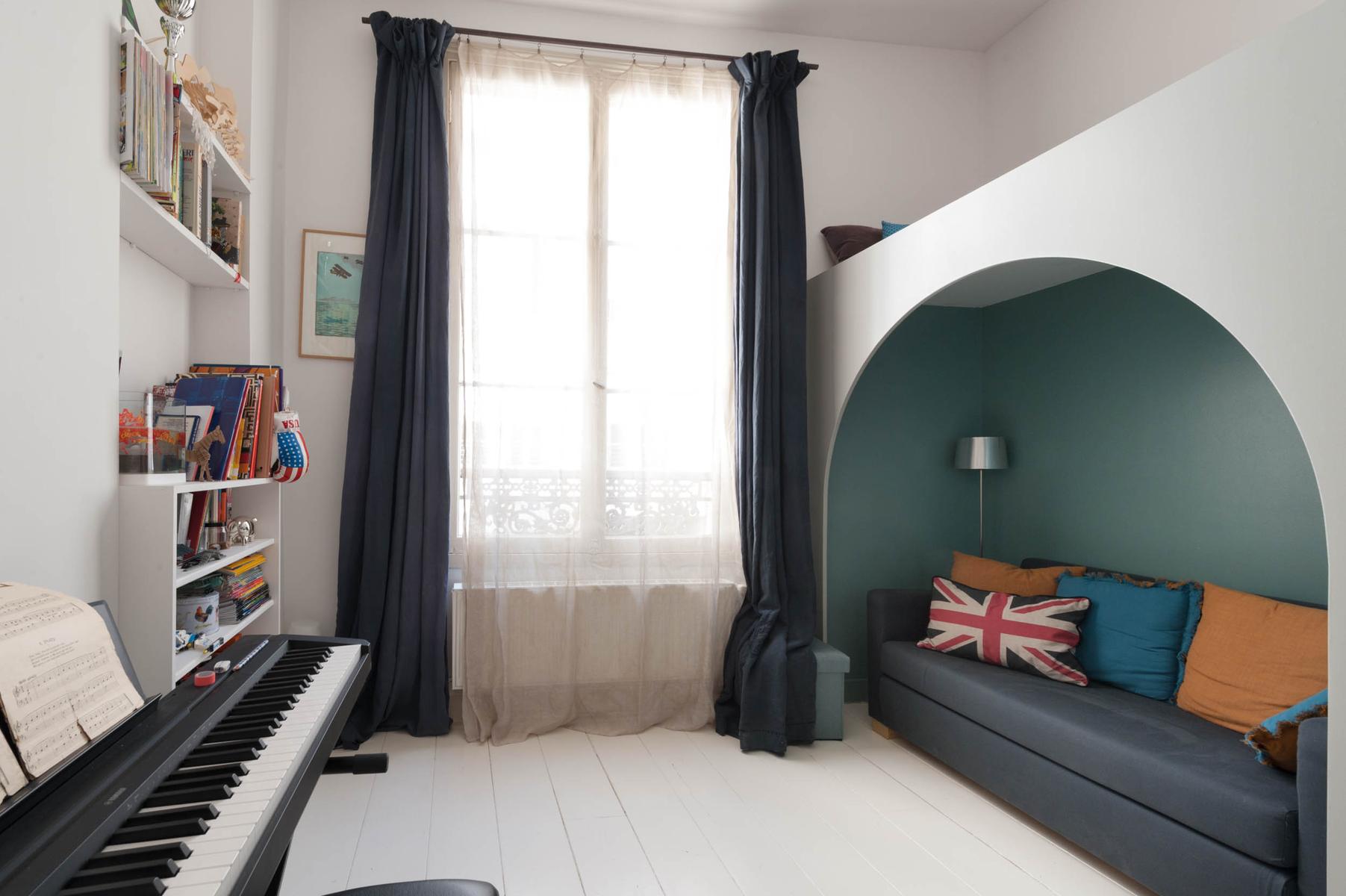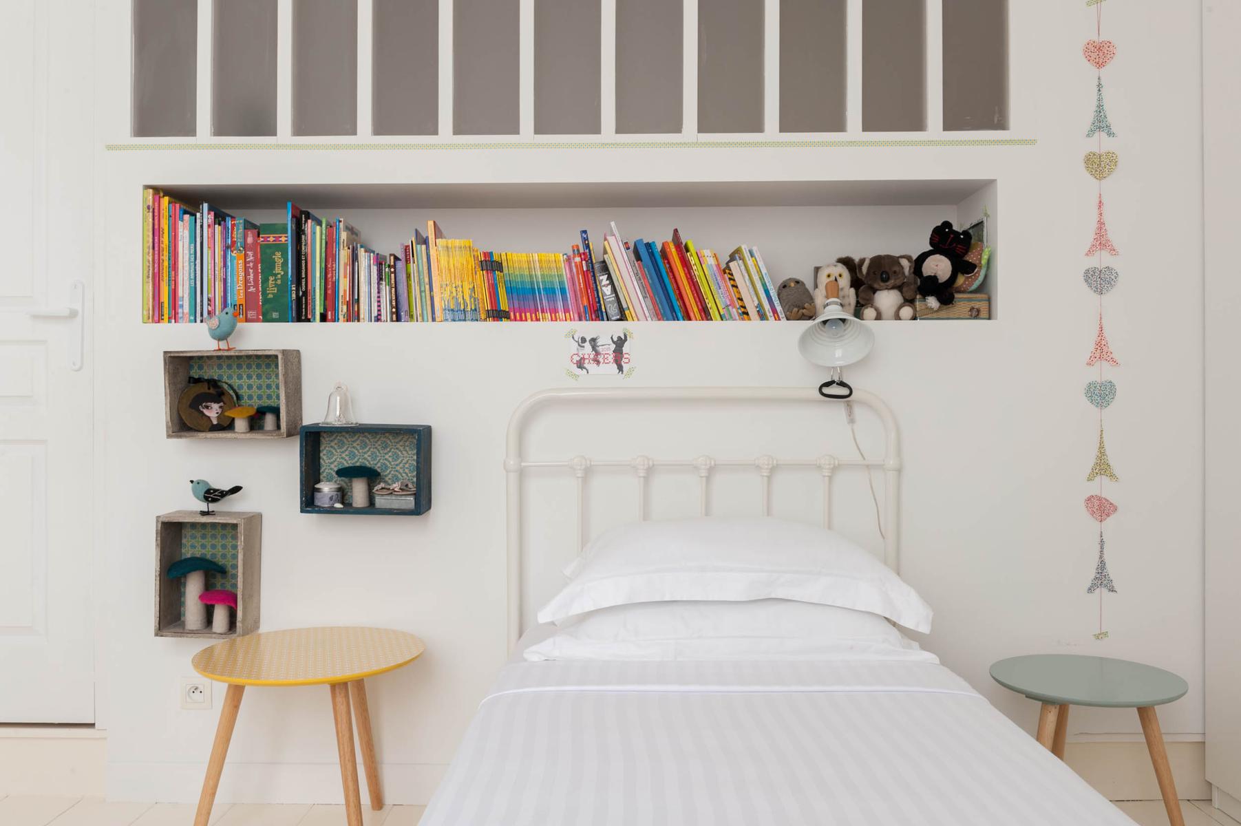 Vous entrez au rez-de-chaussée, à gauche, une cuisine avec un mur vert feuille et un bar en bois pour le petit déjeuner. Plus loin sur la gauche, il y a le salon ouvert, avec une table à manger blanche éclairée par un lustre en argent. Derrière, un escalier en colimaçon mène aux deuxième et troisième chambres (une chambre simple et une chambre superposée, toutes deux décorées dans des tons frais). La salle de bains avec une douche à l’italienne et une baignoire élégante. Après une armoire ancienne surmontée d’un miroir, vous arriverez au coin salon, dont les murs sont d’un rose tendre et les canapés gris pâle.