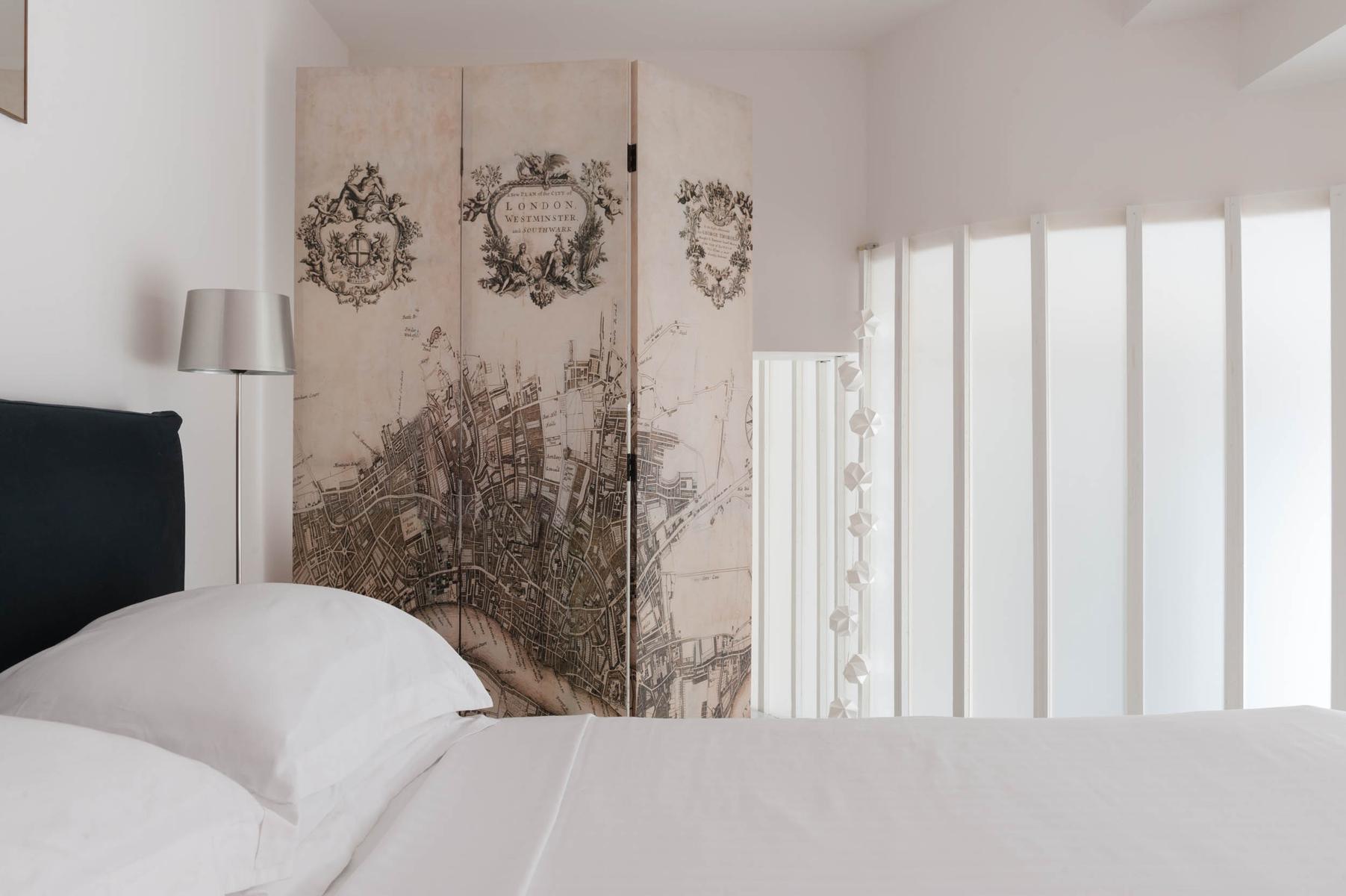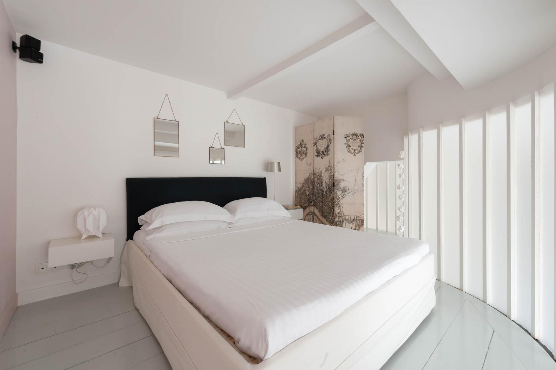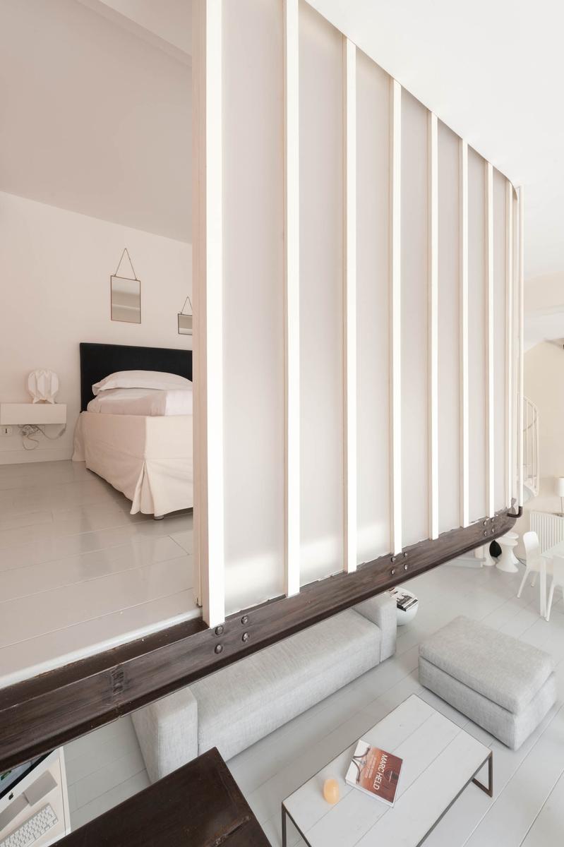 Juste à l’extrémité, il y a un escalier flottant qui mène à la chambre des maîtres de la mezzanine. Conçue par les hôtes, cette chambre a un mur de verre ondulant. Il est entièrement blanc, joliment accessoirisé et a une sensation d’isolement et de paix.