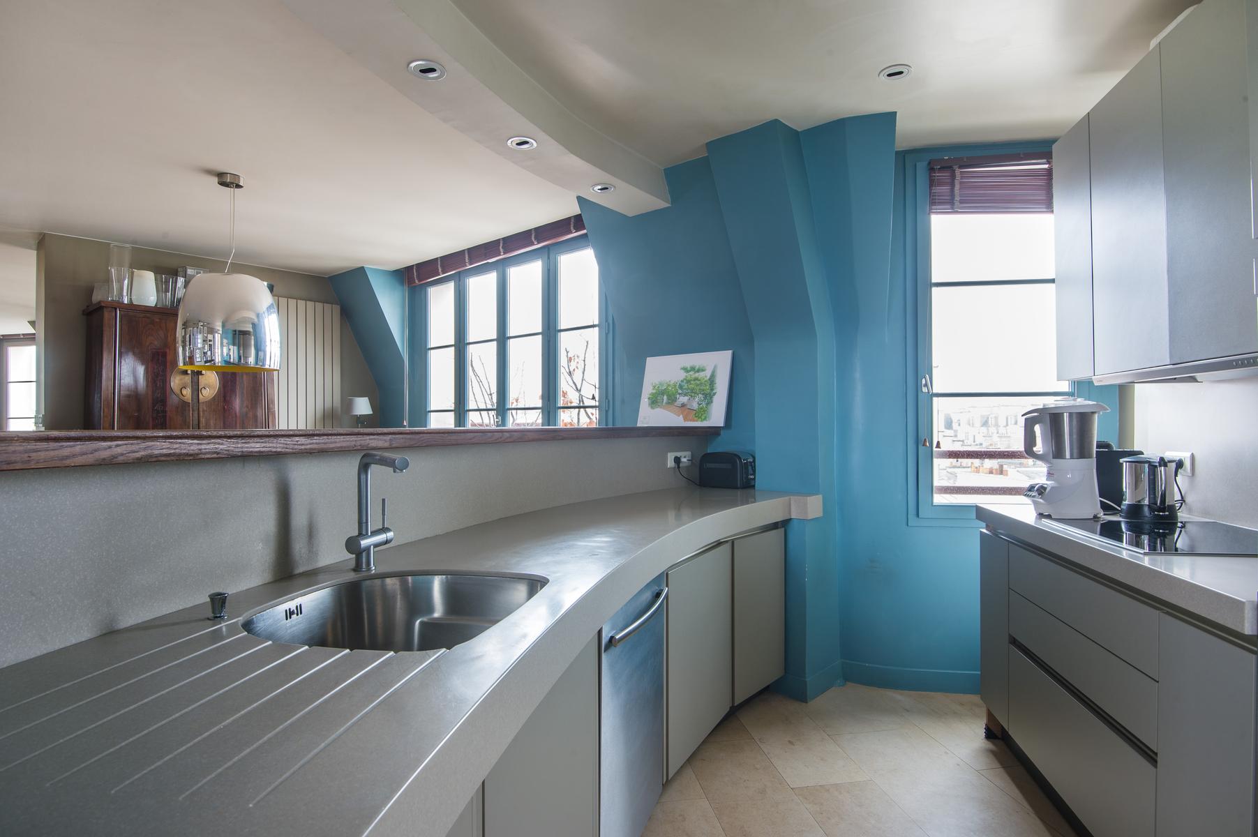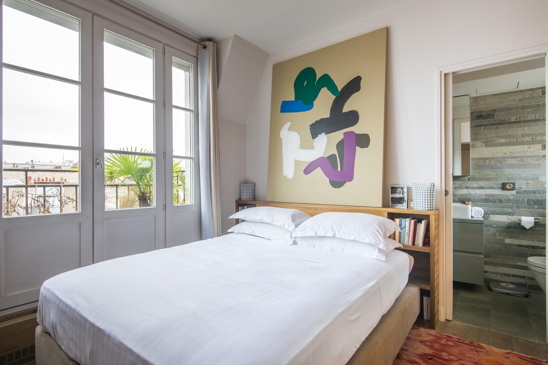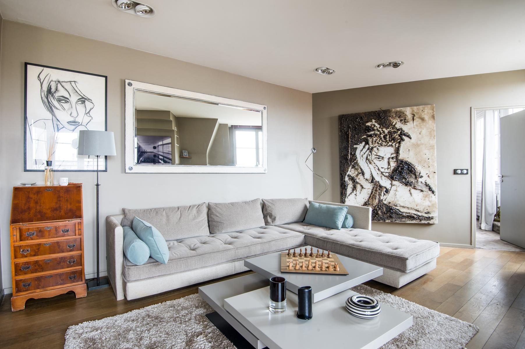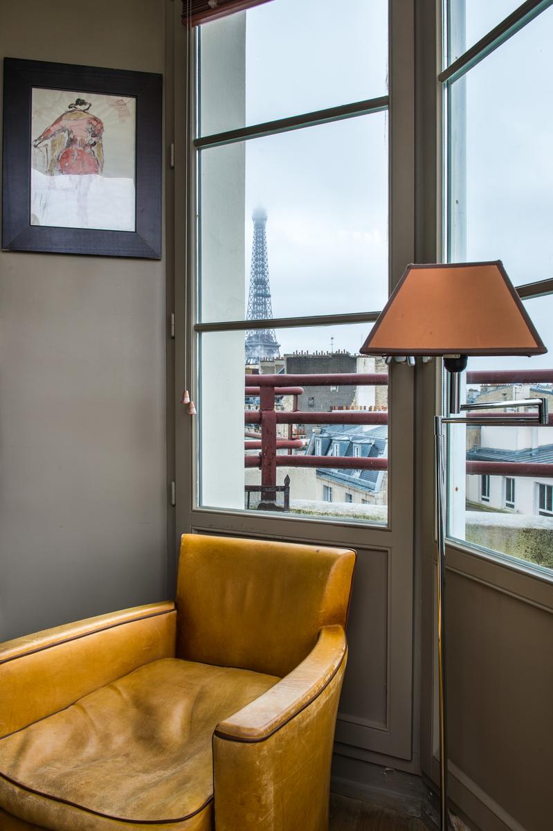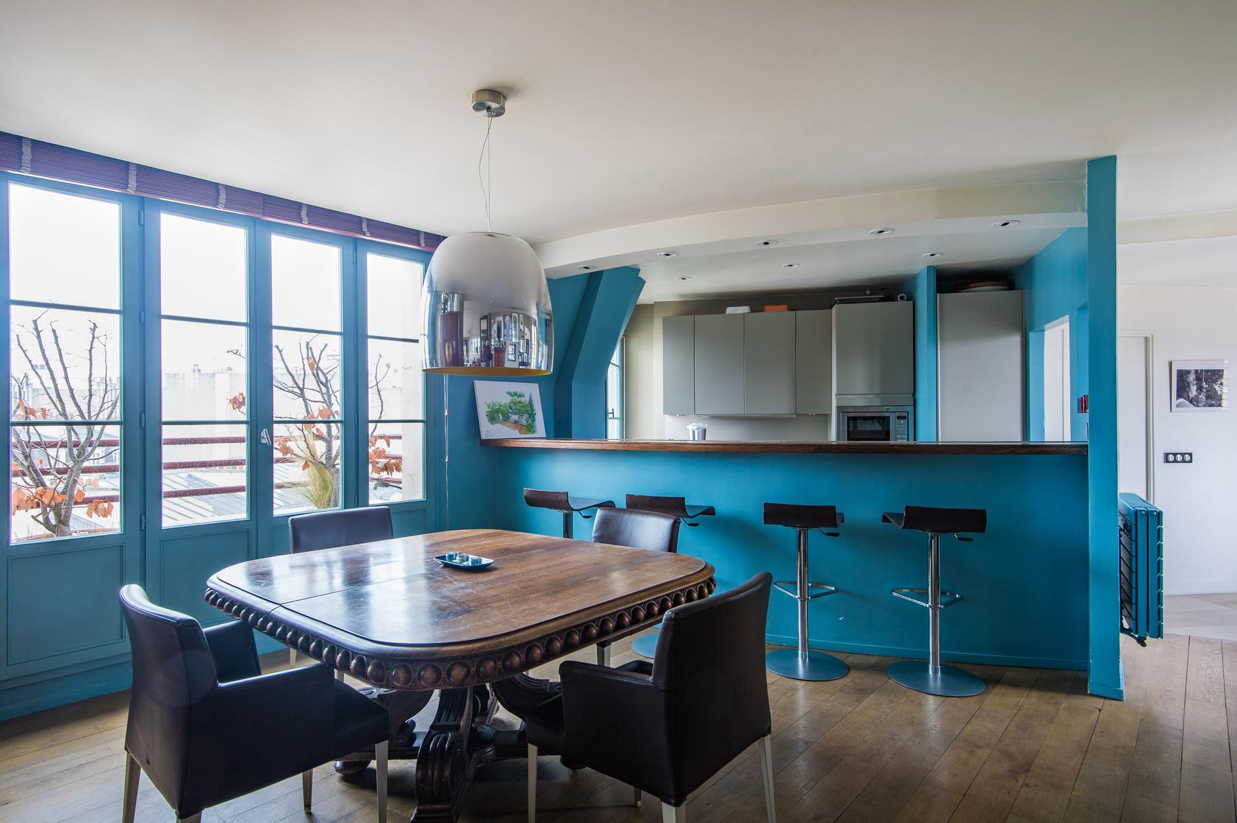 Rue de Passy II is a three bedroom, three bathroom home in Eiffel Tower. From the kitchen’s contemporary turquoise breakfast bar and contrasting antique table, to the sitting room’s collection of cool furniture and yet cooler artworks, this home’s open-plan living area feels very vibrant. The bedrooms are stylish and characterful too, and the little balcony has a close-up view of the Eiffel Tower. The area’s central and very elegant – you’ll find upscale boutiques and restaurants aplenty nearby. The Jardins du Trocadéro and Eiffel Tower are within walking distance, and it’s just a three-minute stroll to Passy metro station.