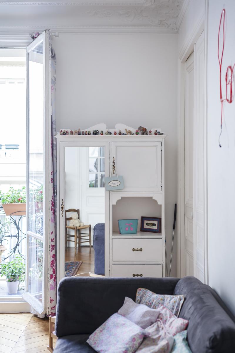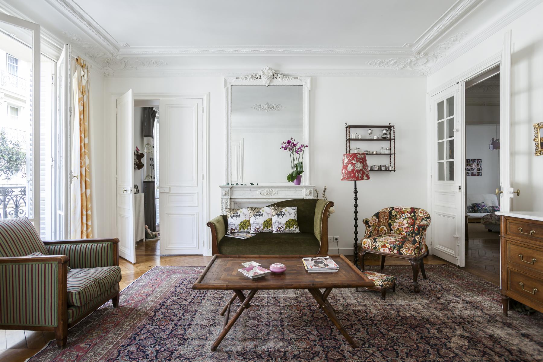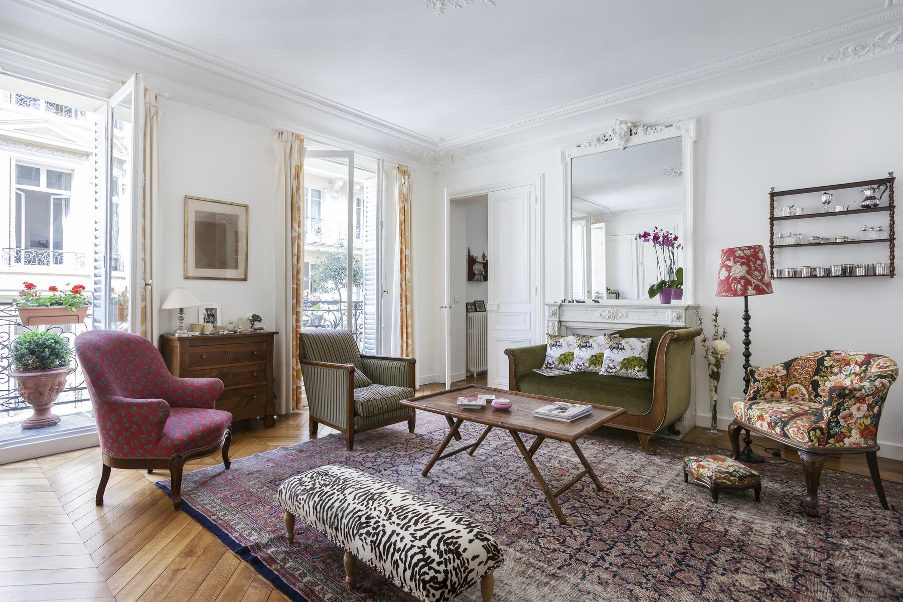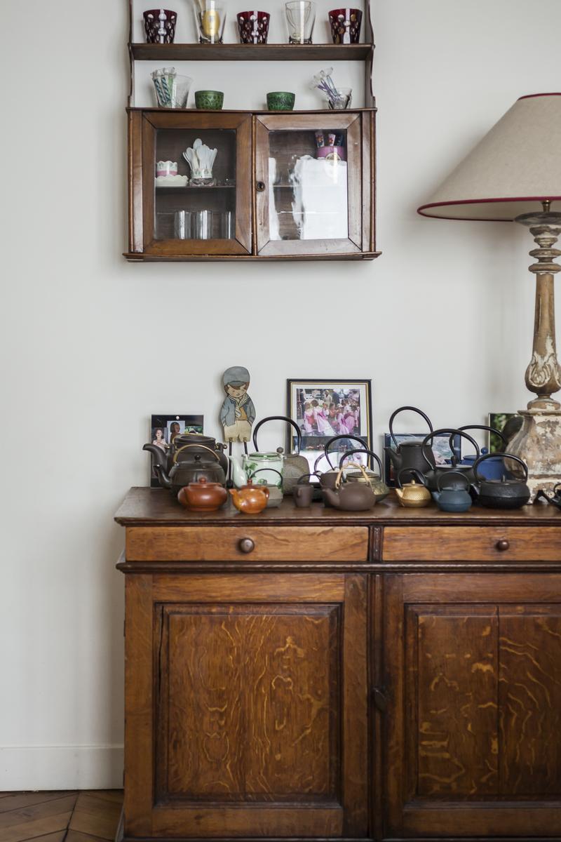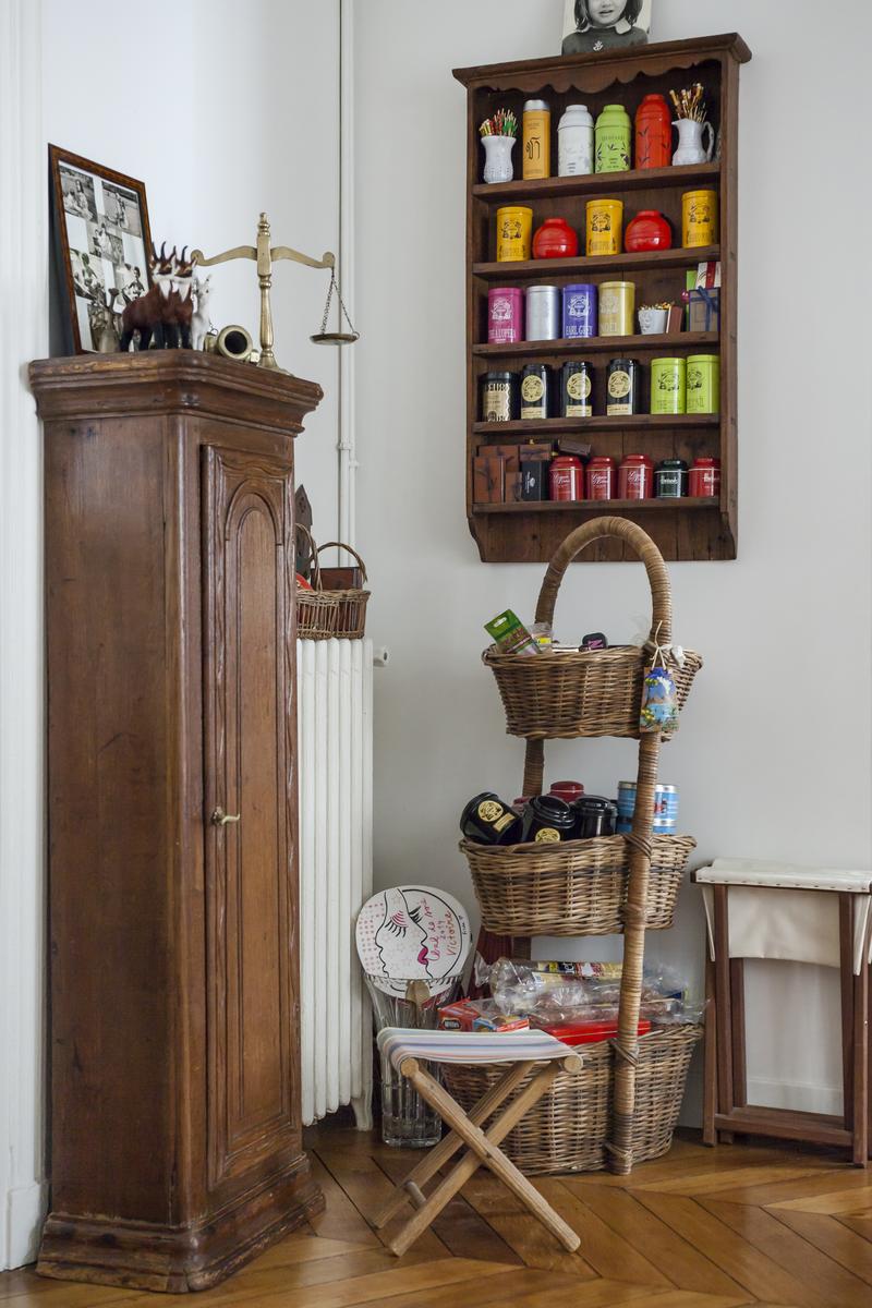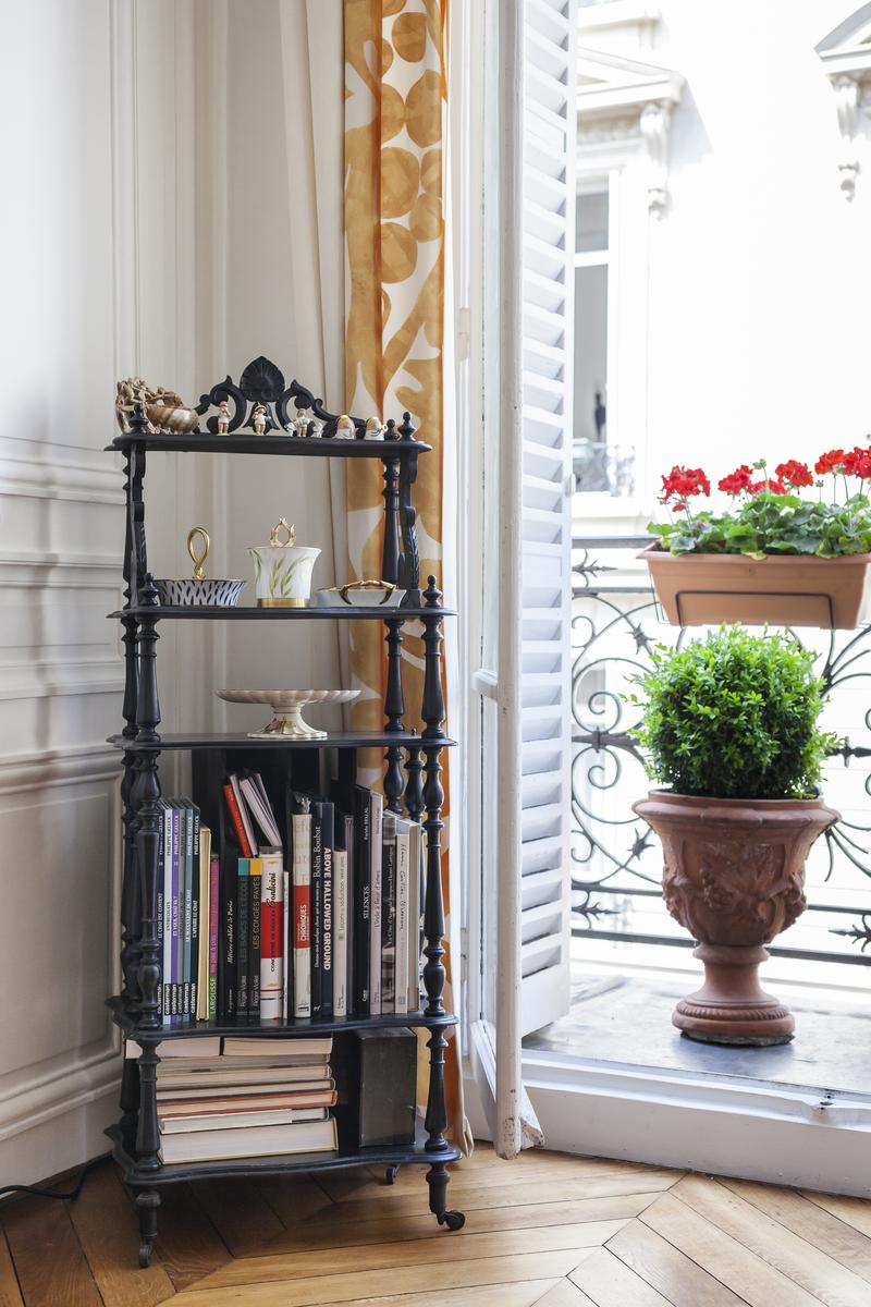 Cette maison du deuxième étage est rafraîchissante, comme une promenade dans le Parc Monceau tout proche. Vous entrez dans un couloir, et la cuisine est la première à droite. Au-delà de ses armoires anciennes (dont l’une abrite une collection de délicates théières) et de la table familiale, une porte à gauche donne accès au salon. Avec de longues fenêtres et un parquet, cet espace est animé par les fauteuils à motifs et la chaise longue en velours vert sur le tapis oriental.