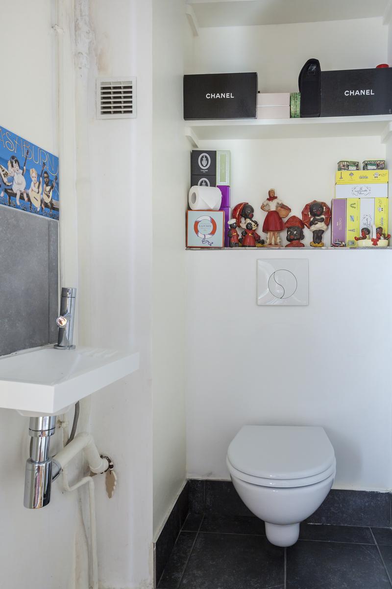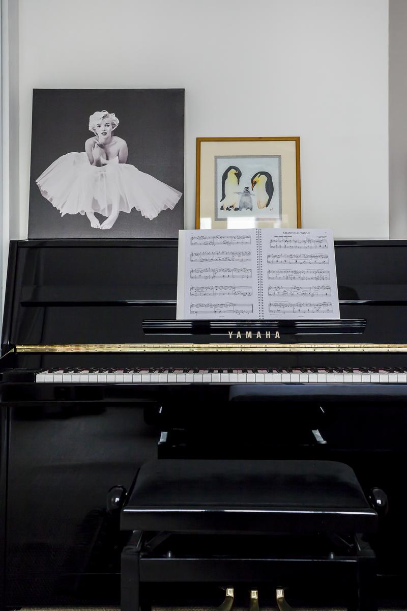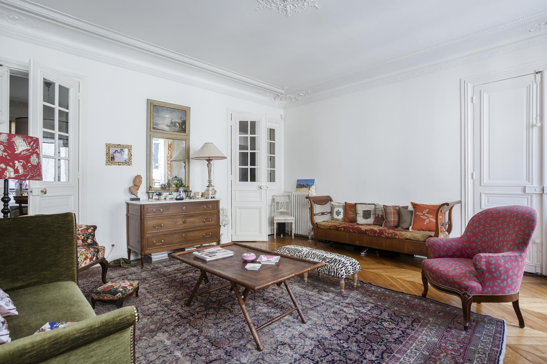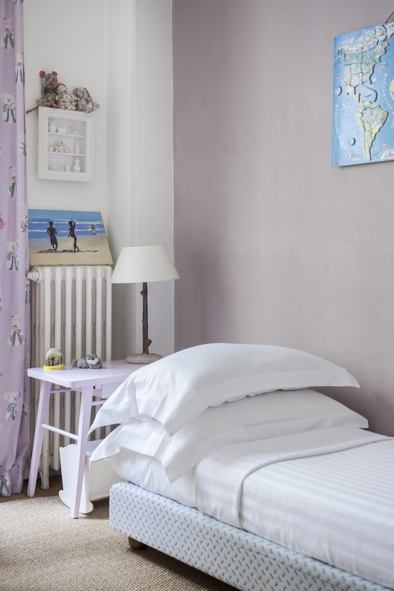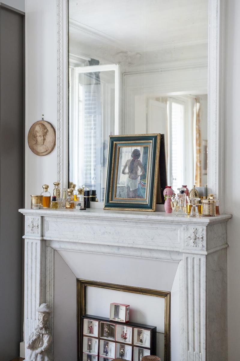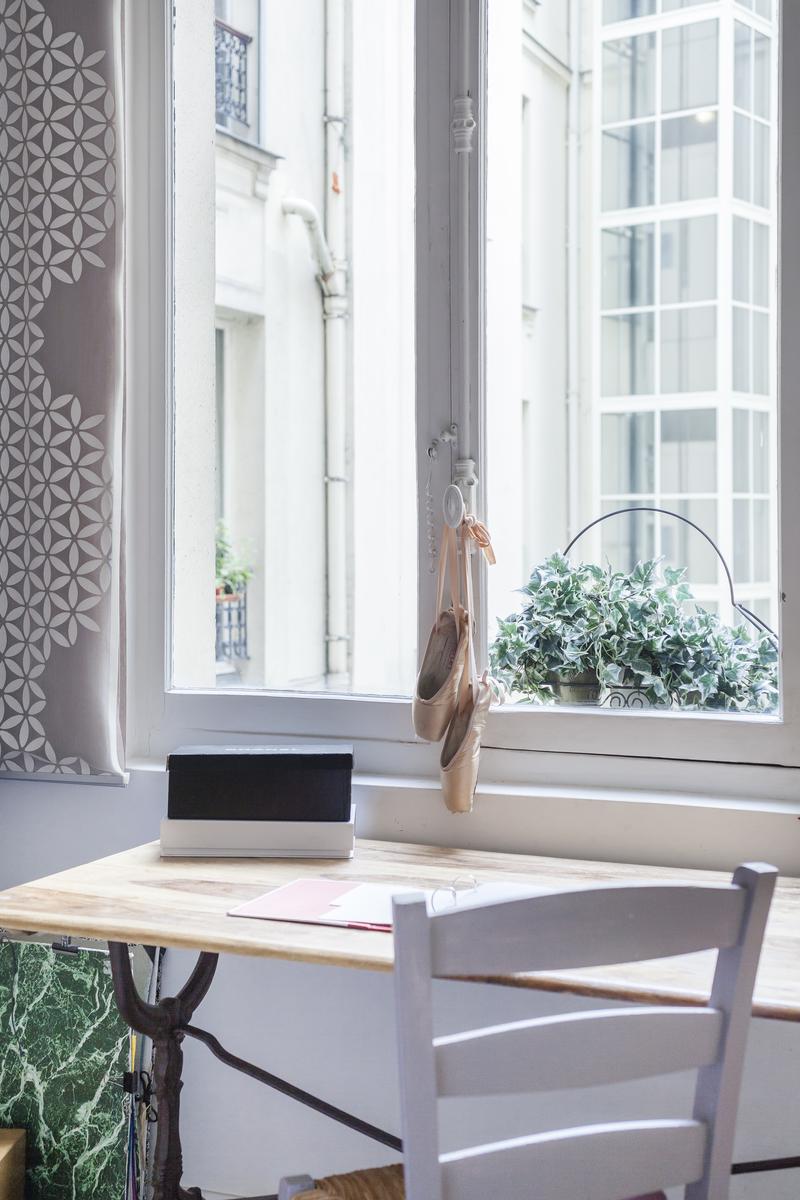 Cette maison du deuxième étage est rafraîchissante, comme une promenade dans le Parc Monceau tout proche. Vous entrez dans un couloir, et la cuisine est la première à droite. Au-delà de ses armoires anciennes (dont l’une abrite une collection de délicates théières) et de la table familiale, une porte à gauche donne accès au salon. Avec de longues fenêtres et un parquet, cet espace est animé par les fauteuils à motifs et la chaise longue en velours vert sur le tapis oriental.