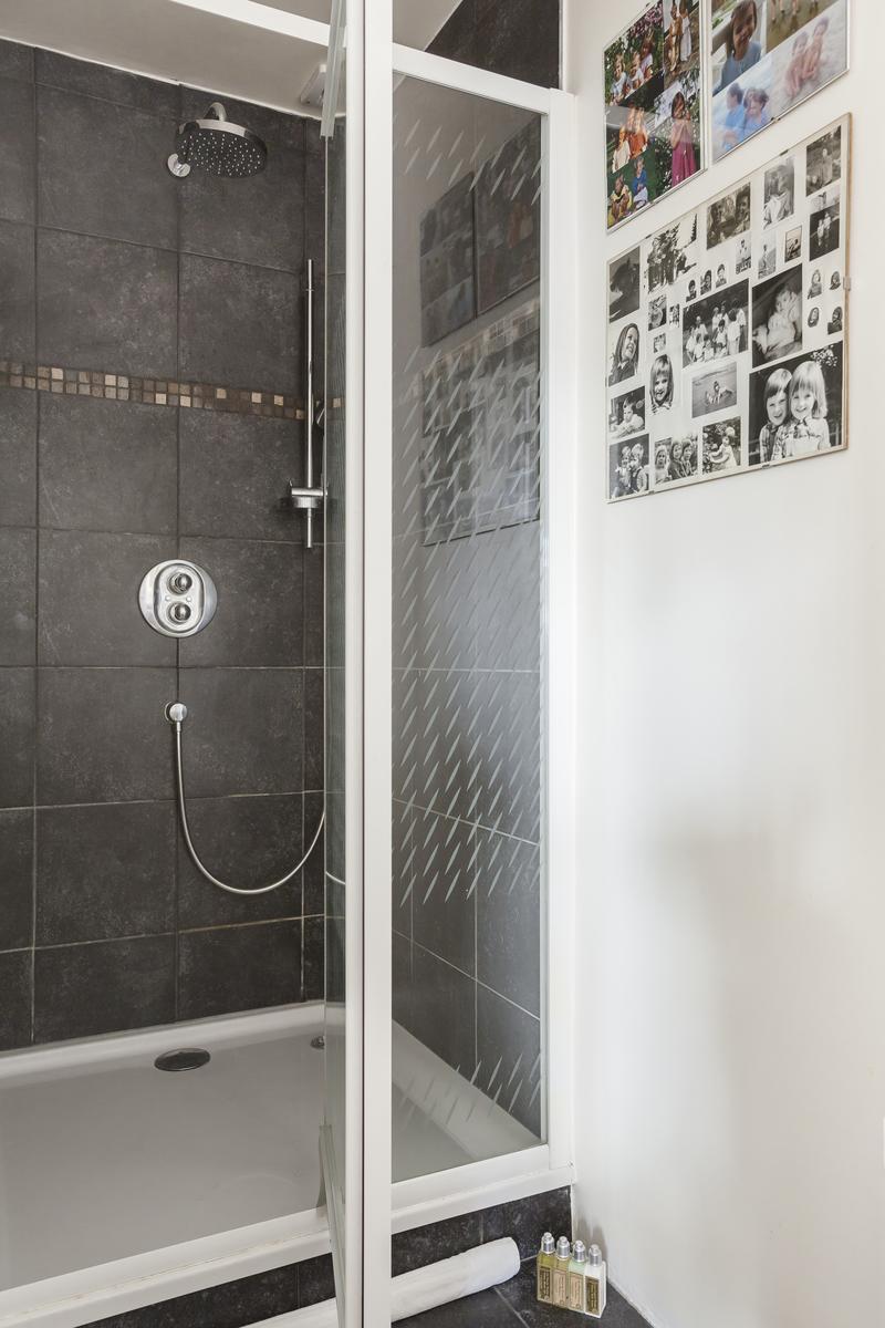 Vous trouverez deux chambres (l’une avec un lit superposé, l’autre avec un lit d’enfant) à gauche du hall d’entrée, plus la salle de bain principale gris caillou et une salle de toilette. Une troisième – avec des rideaux roses et un autre lit d’enfant – est à l’extérieur de la cuisine, tandis que la chambre des maîtres se trouve dans la porte à droite du salon. Vous y trouverez des murs moulurés peints à la peinture pâle et une cheminée ornementale surmontée d’intrigants bibelots.