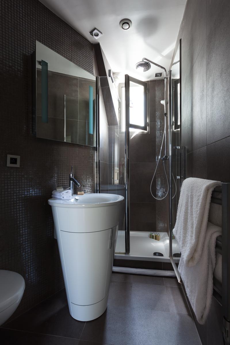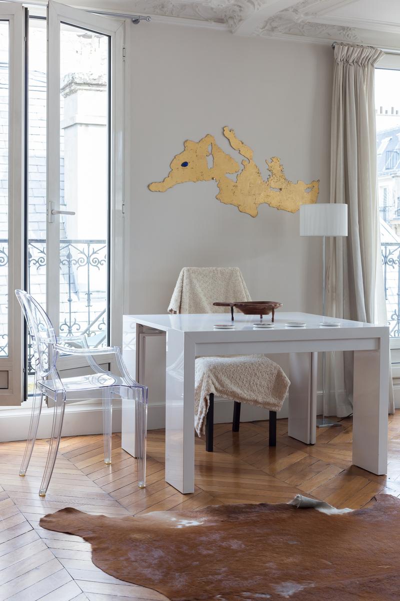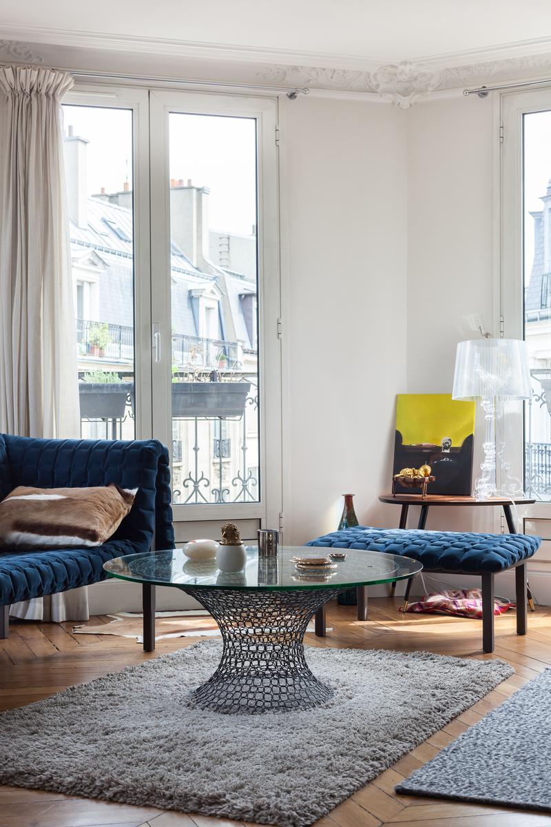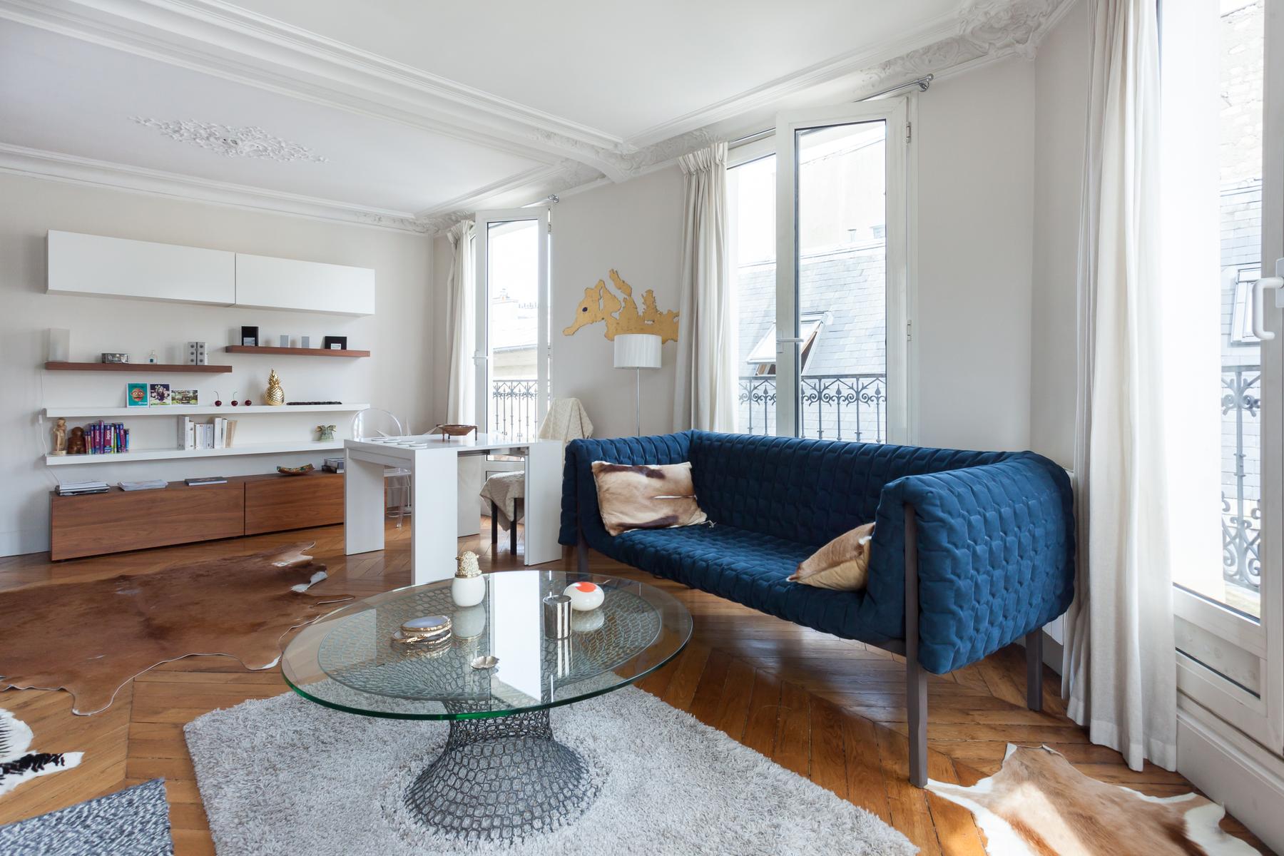 Cinq étages au-dessus des rues de South Pigalle – un quartier connu pour ses bars et restaurants à la mode – la rue de Turin est tout à fait branchée. À l’intérieur, vous arriverez d’abord au salon, qui se trouve de l’autre côté du couloir. Une table à manger contemporaine est adjacente à un canapé en velours bleu, et des tapis assortis recouvrent les parquets d’origine. A droite se trouve le deuxième salon, plus confortable que le premier, avec des étagères pleines et un canapé-lit à coussin fuchsia. La première à gauche est la salle de bain gris ardoise et, au-delà, la cuisine compacte.