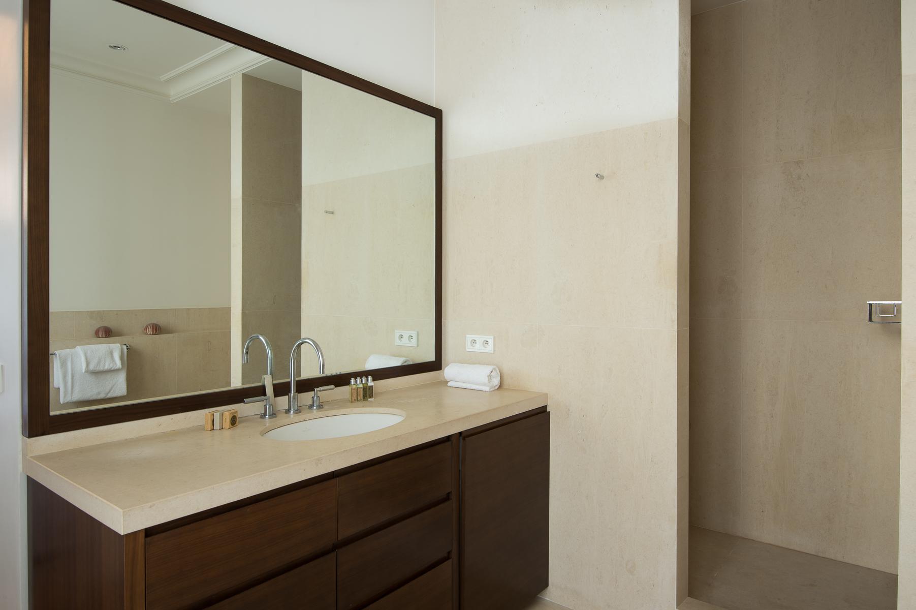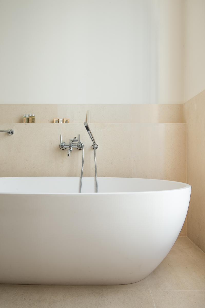 Enfin, il y a la chambre principale au bout du couloir à gauche de l’entrée. La palette de couleurs grises et les silhouettes nettes de cette chambre en font un endroit tentant pour se retirer, d’autant plus qu’il y a un bain à roulettes dans l’élégante salle de bain.