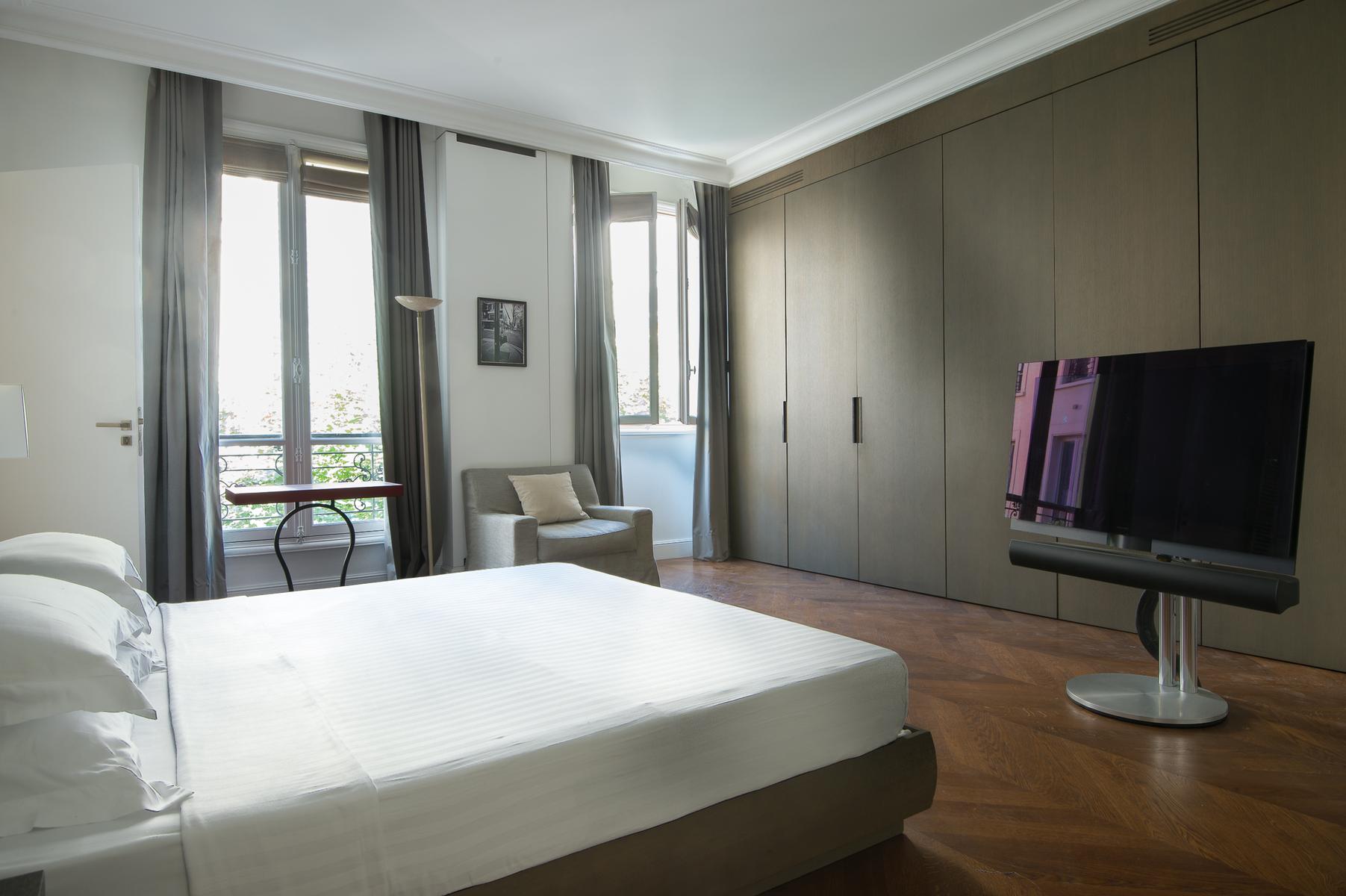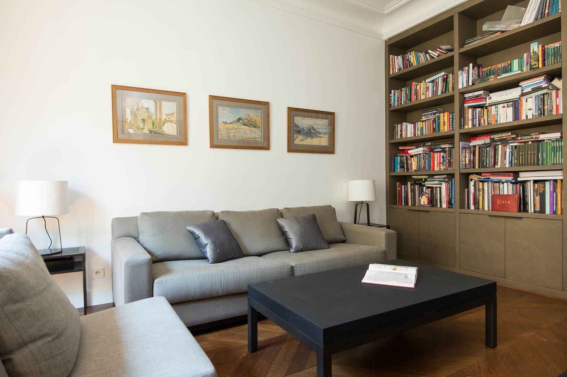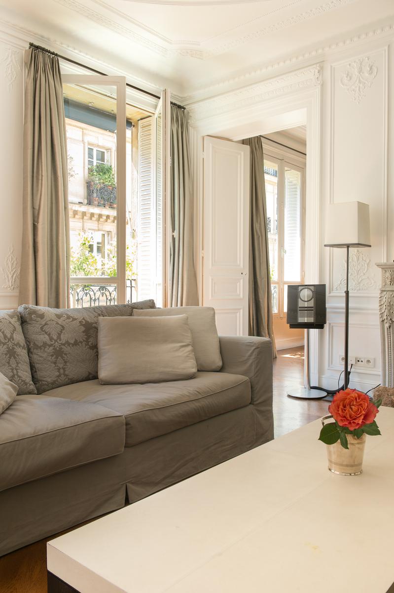 La rue de Villersexel est un appartement bien aménagé sur l’un des nombreux boulevards élégants de Saint-Germain-des-Prés. La porte d’entrée est au troisième étage et s’ouvre sur un large couloir. Le salon est droit devant, un espace en équilibre avec des murs moulurés ornementalement, des canapés classiques de couleur sable et une cheminée ornementale frappante. Par la porte de droite se trouve un deuxième salon, animé par des étagères débordantes. L’autre porte vous mène à la salle à manger, sa table contemporaine distinctive entourée d’œuvres d’art, certaines par les artistes russes préférés de vos hôtes. A droite, vous trouverez les armoires taupe de la cuisine, puis une salle de bain.