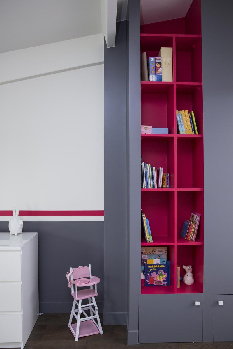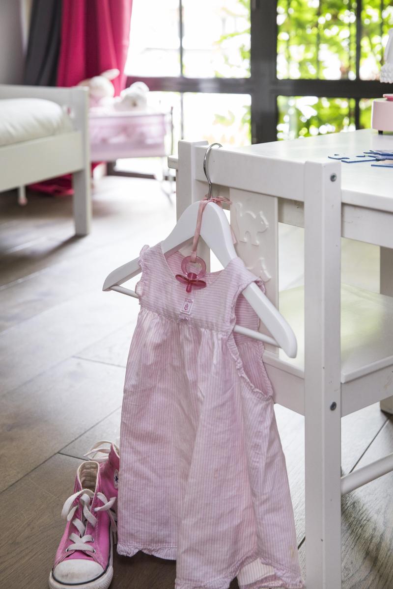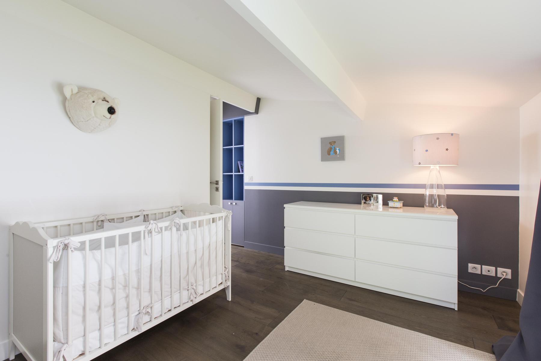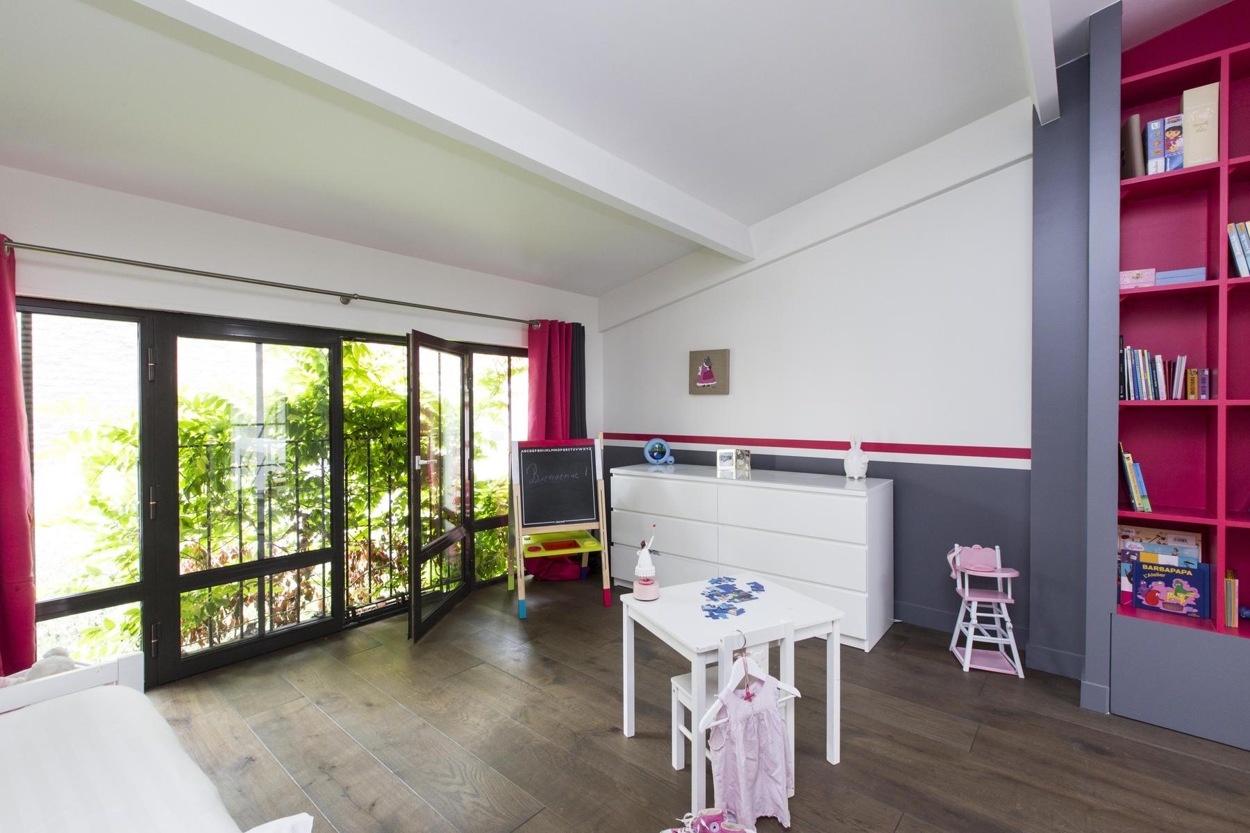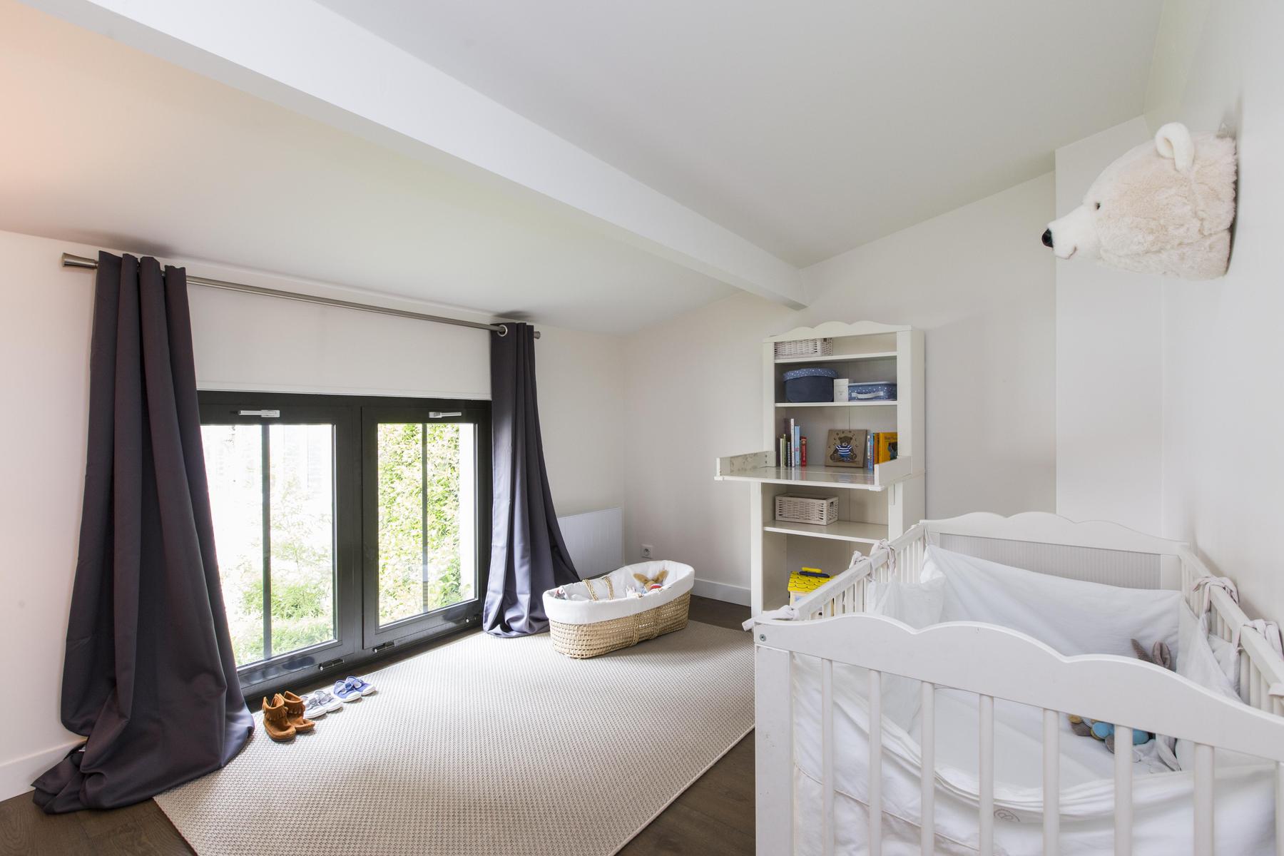 You’ll marvel at the angular stairs, and won’t stop until you’ve looked long and appreciatively at the vinyl-lined shelves upstairs. The master is an uncluttered canvas of calm, and there’s an avant-garde quality to the grey and cerise of the child bedroom. You’ve also the sweetest baby’s room, a delightfully designer bathroom and a shower room that’s sparklingly up-to-the-minute.