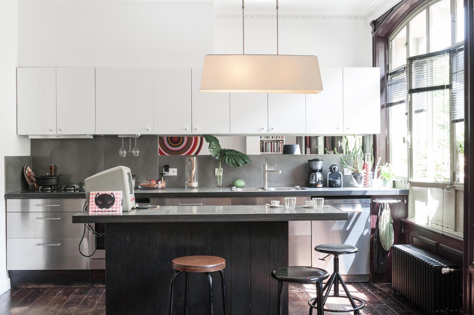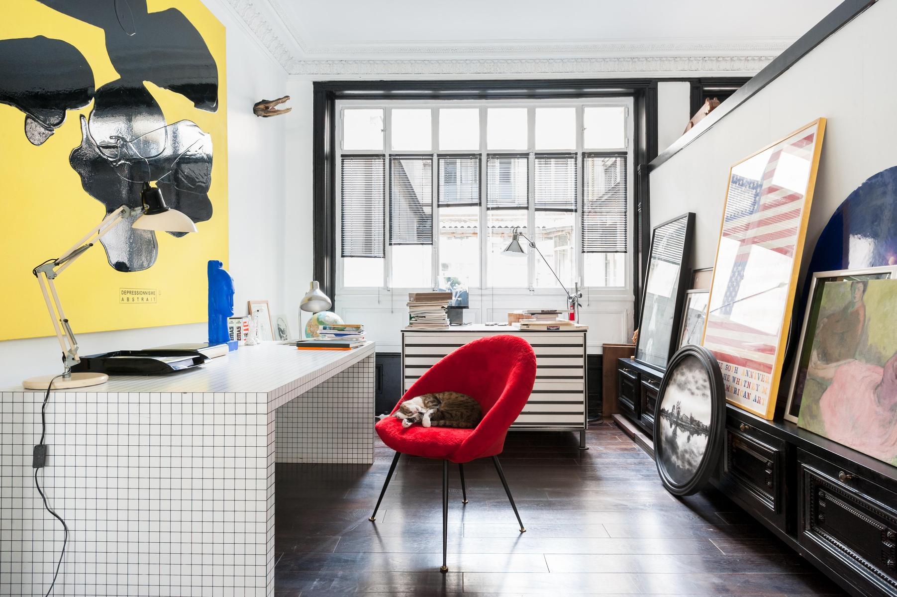 Couleurs vives, texte en gras, graphisme vibrant – Rue des Filles du Calvaire donne un coup de poing visuel audacieux. D’immenses fenêtres signalent les origines de l’espace en tant que moulin à eau, mais dans sa dernière incarnation, c’est à la fois une maison et une installation artistique : des toiles audacieuses aux couleurs sûres propulsent la propriété vers l’avenir. Des étagères anciennes pleines de livres et de journaux dans un coin salon confortable et un espace d’étude. Et dans le coin de la pièce ouverte, des verres à vin comme des ampoules éclairent la cuisine chromée.