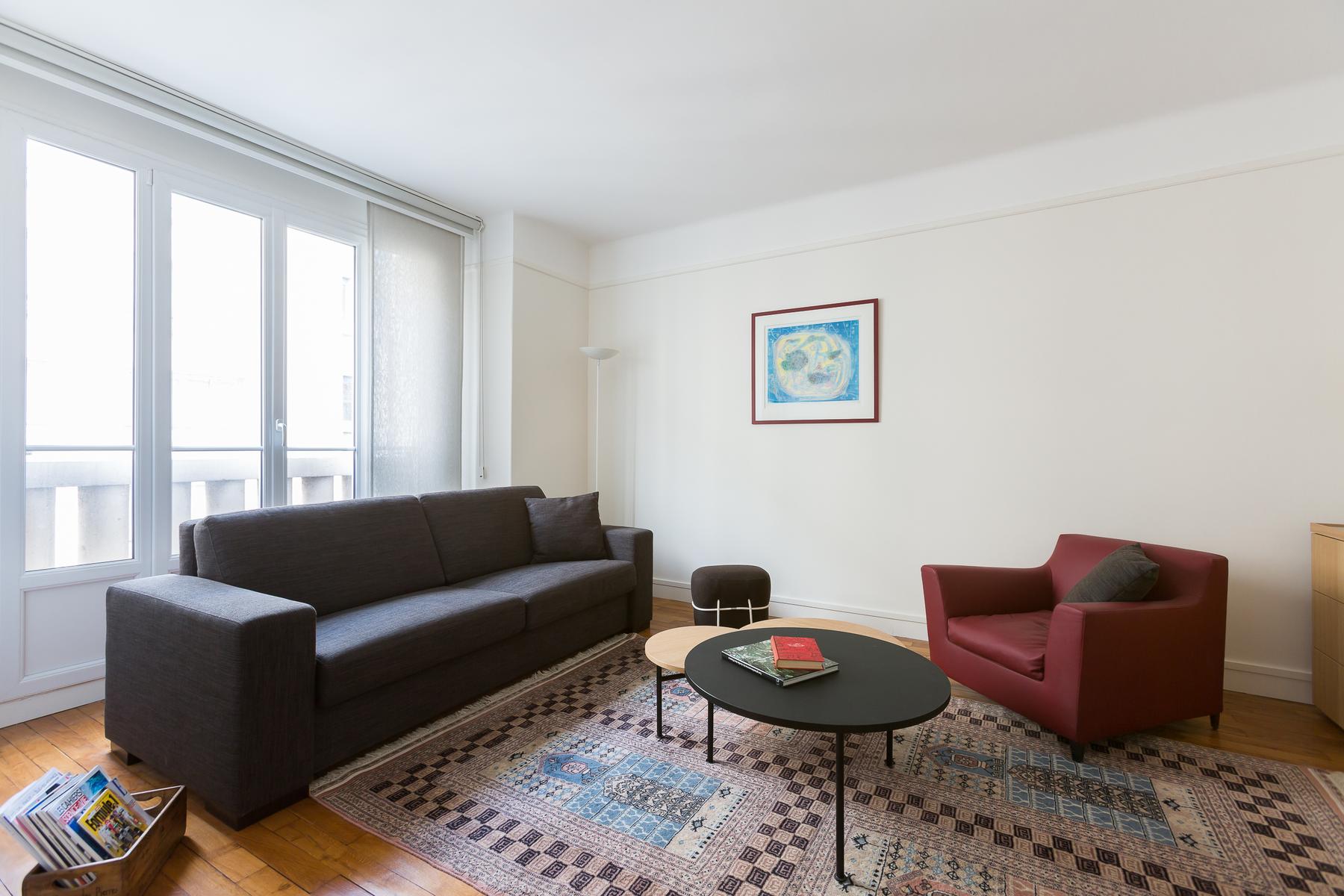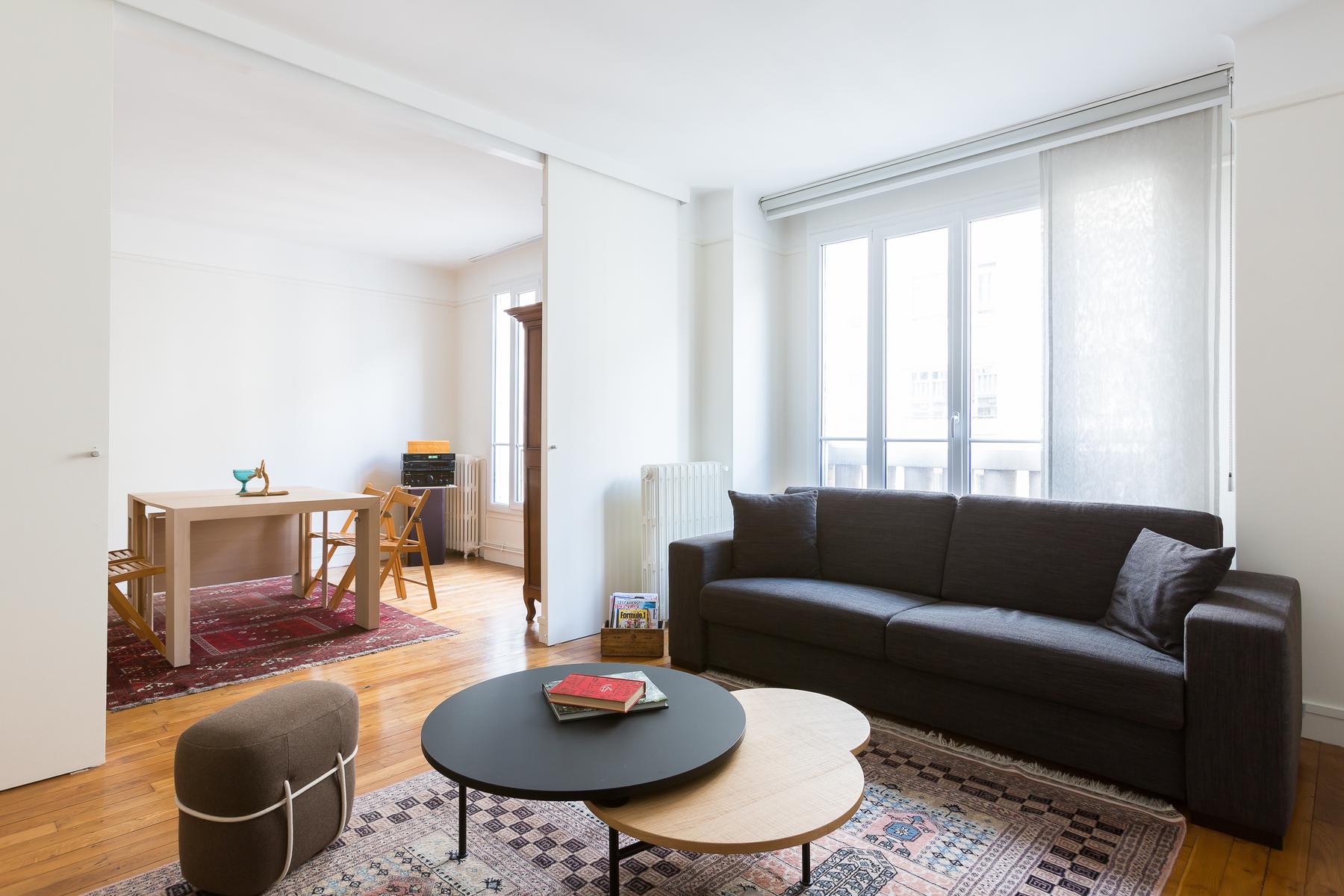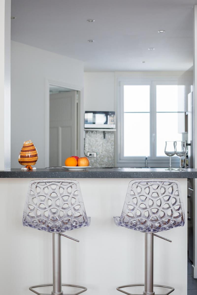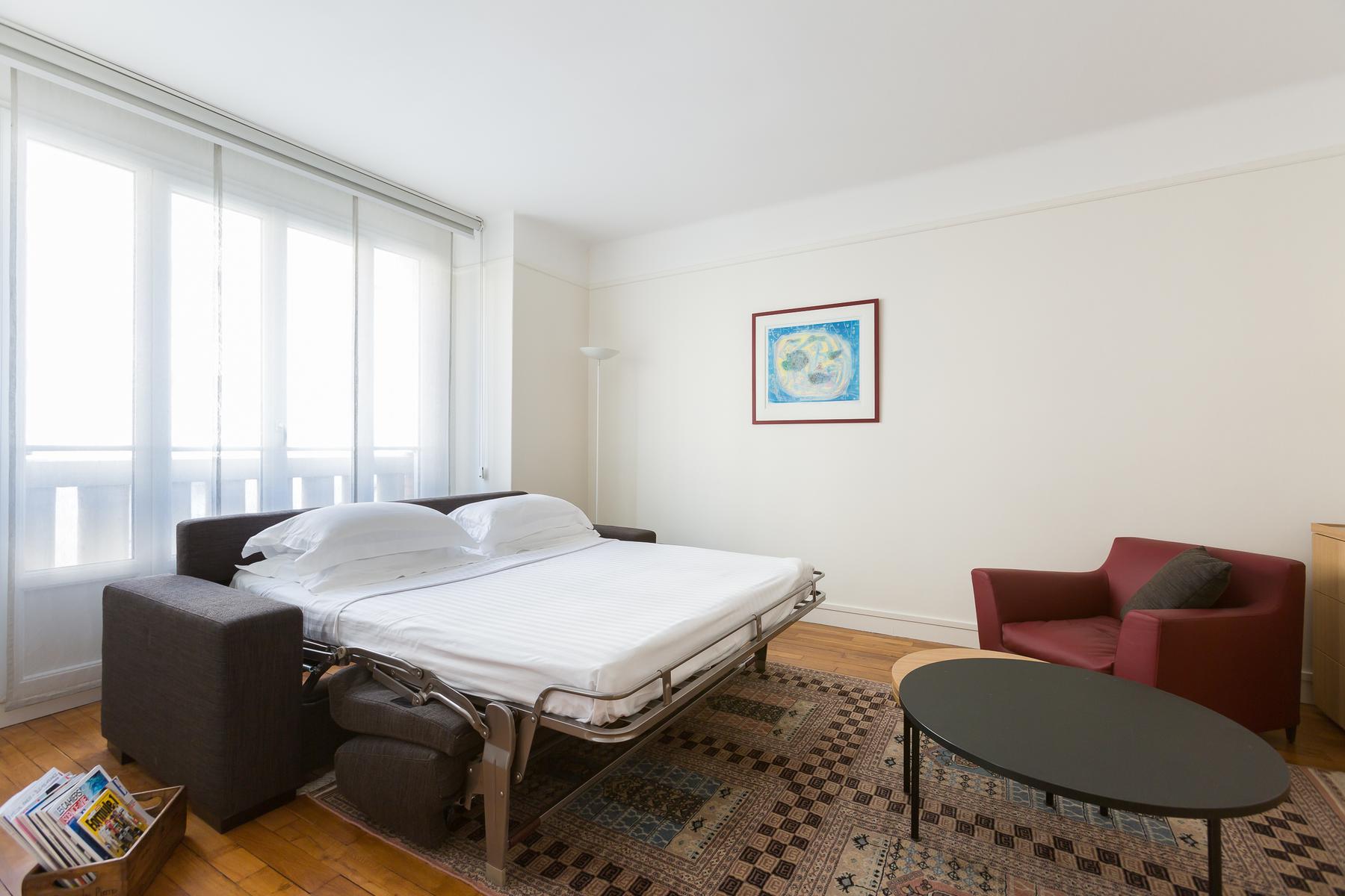 La rue des Fossés Saint-Marcel a tout le style décontracté du Quartier Latin. Vous entrez dans un couloir qui mène à la salle de bains et à la cuisine (décorée dans des couleurs subtiles, avec un bar à petit-déjeuner coiffé de granit). Cette pièce jouxte la salle à manger, où se trouve une table contemporaine aux lignes épurées, composée de quatre chaises. De là, une autre porte ouverte mène au salon de cette maison. Cette chambre est tranquille, son sol en bois est recouvert d’un tapis à motifs. Il dispose d’un canapé-lit, d’un fauteuil bordeaux et, en face d’eux, d’un téléviseur à écran plat.
