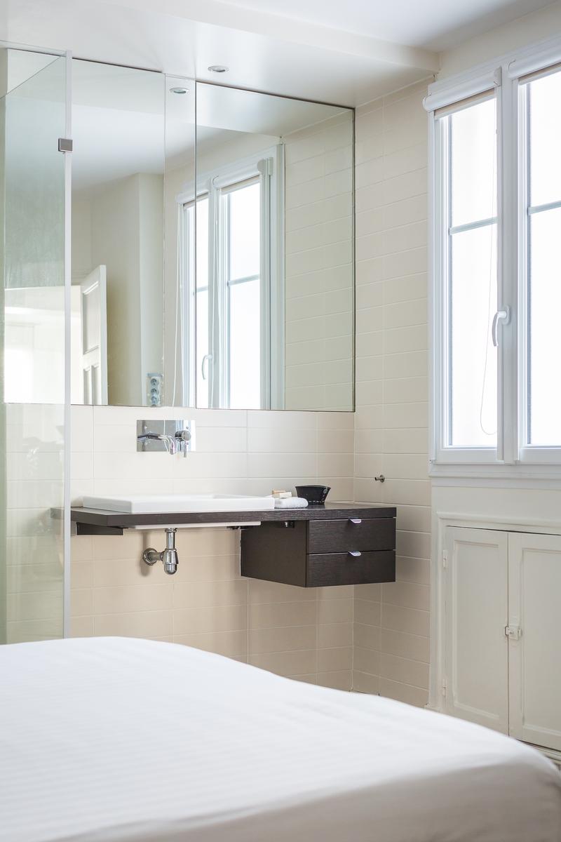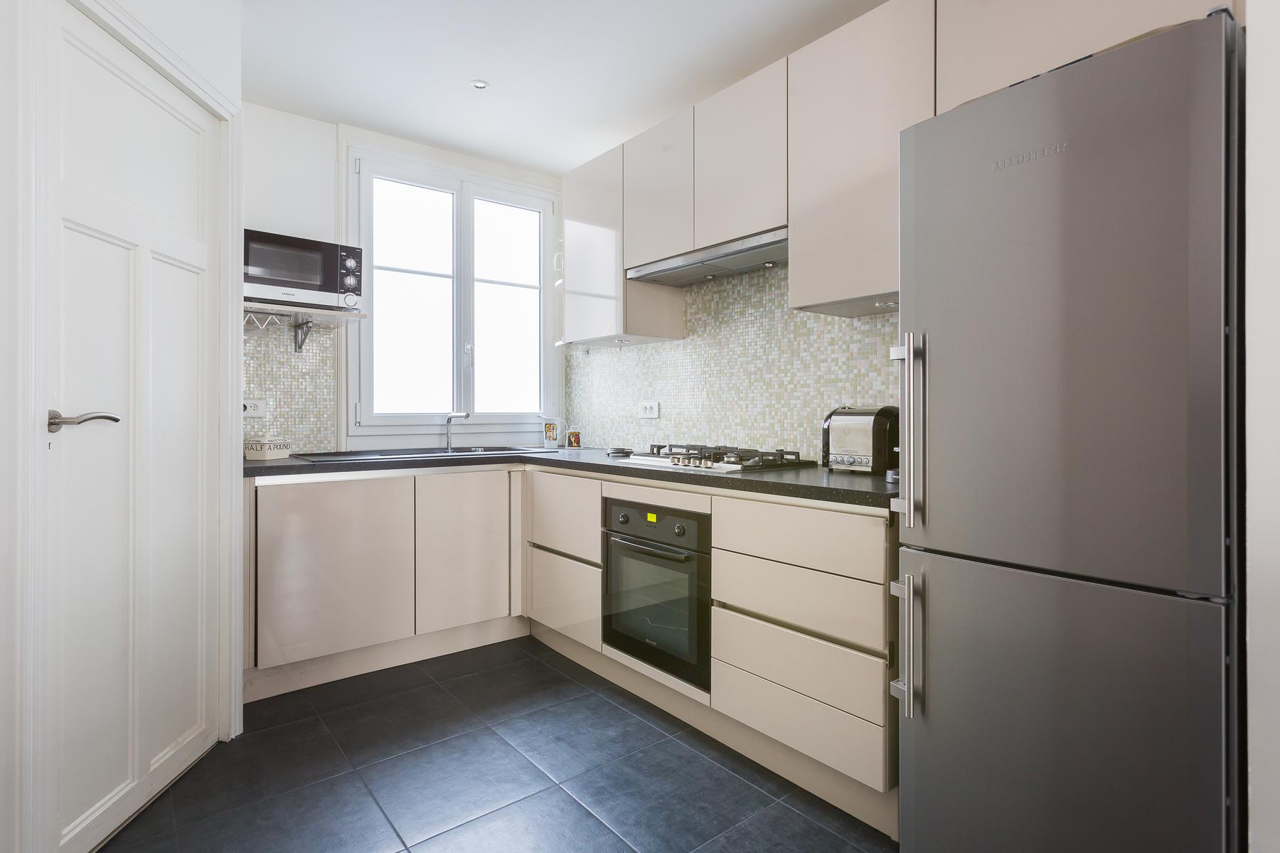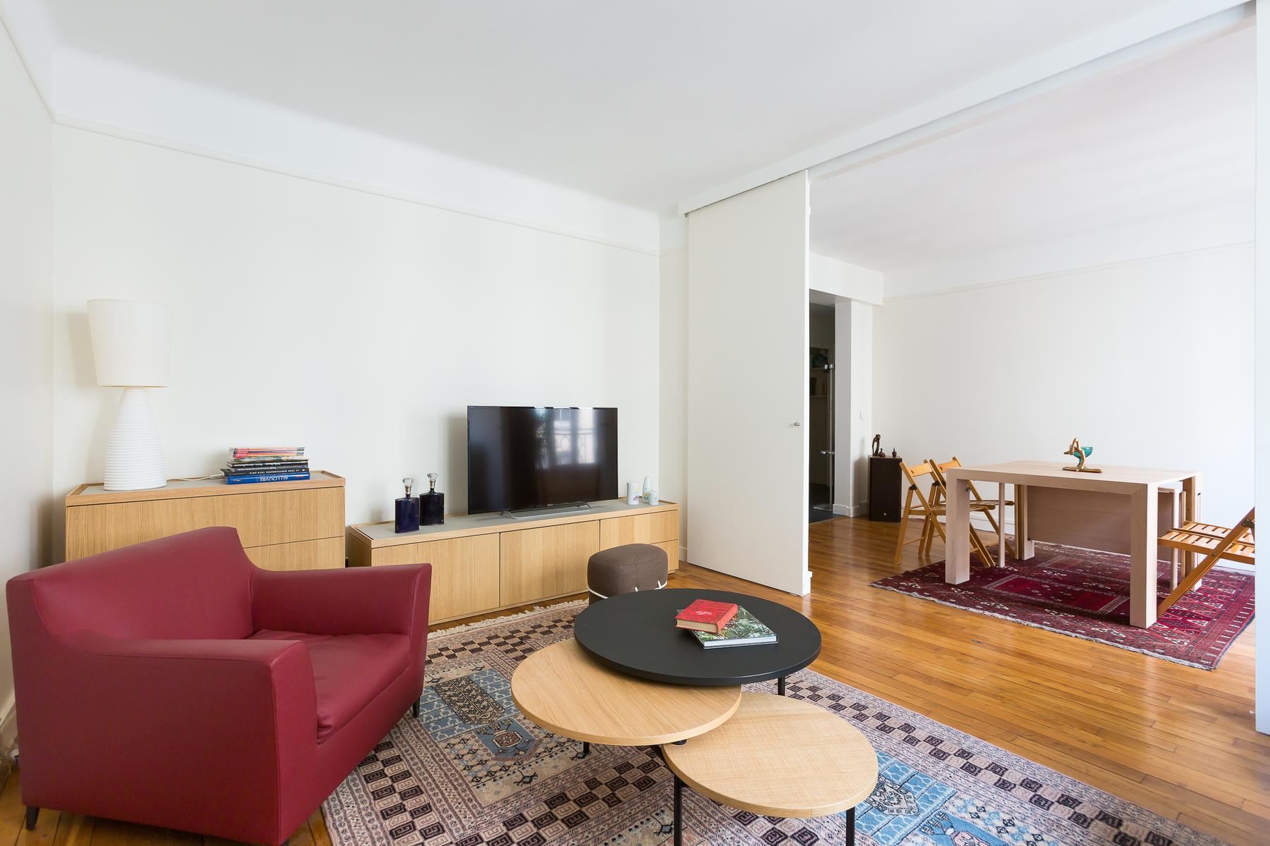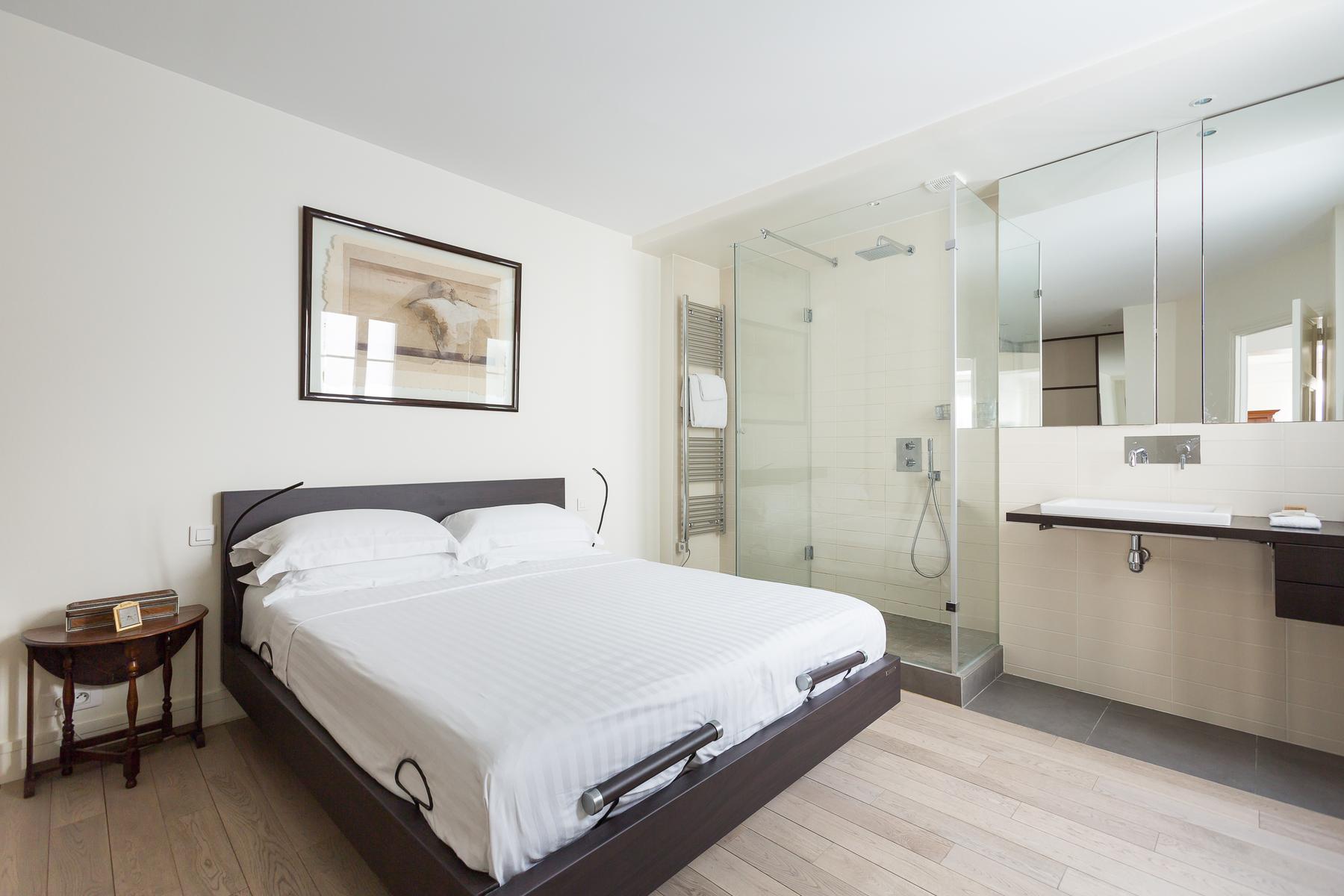 La rue des Fossés Saint-Marcel a tout le style décontracté du Quartier Latin. Vous entrez dans un couloir qui mène à la salle de bains et à la cuisine (décorée dans des couleurs subtiles, avec un bar à petit-déjeuner coiffé de granit). Cette pièce jouxte la salle à manger, où se trouve une table contemporaine aux lignes épurées, composée de quatre chaises. De là, une autre porte ouverte mène au salon de cette maison. Cette chambre est tranquille, son sol en bois est recouvert d’un tapis à motifs. Il dispose d’un canapé-lit, d’un fauteuil bordeaux et, en face d’eux, d’un téléviseur à écran plat.