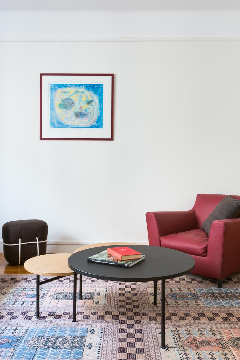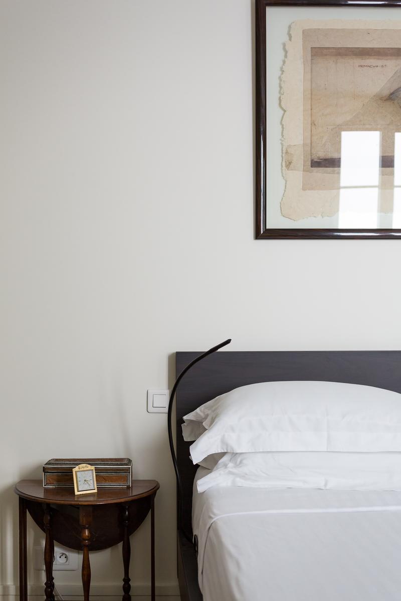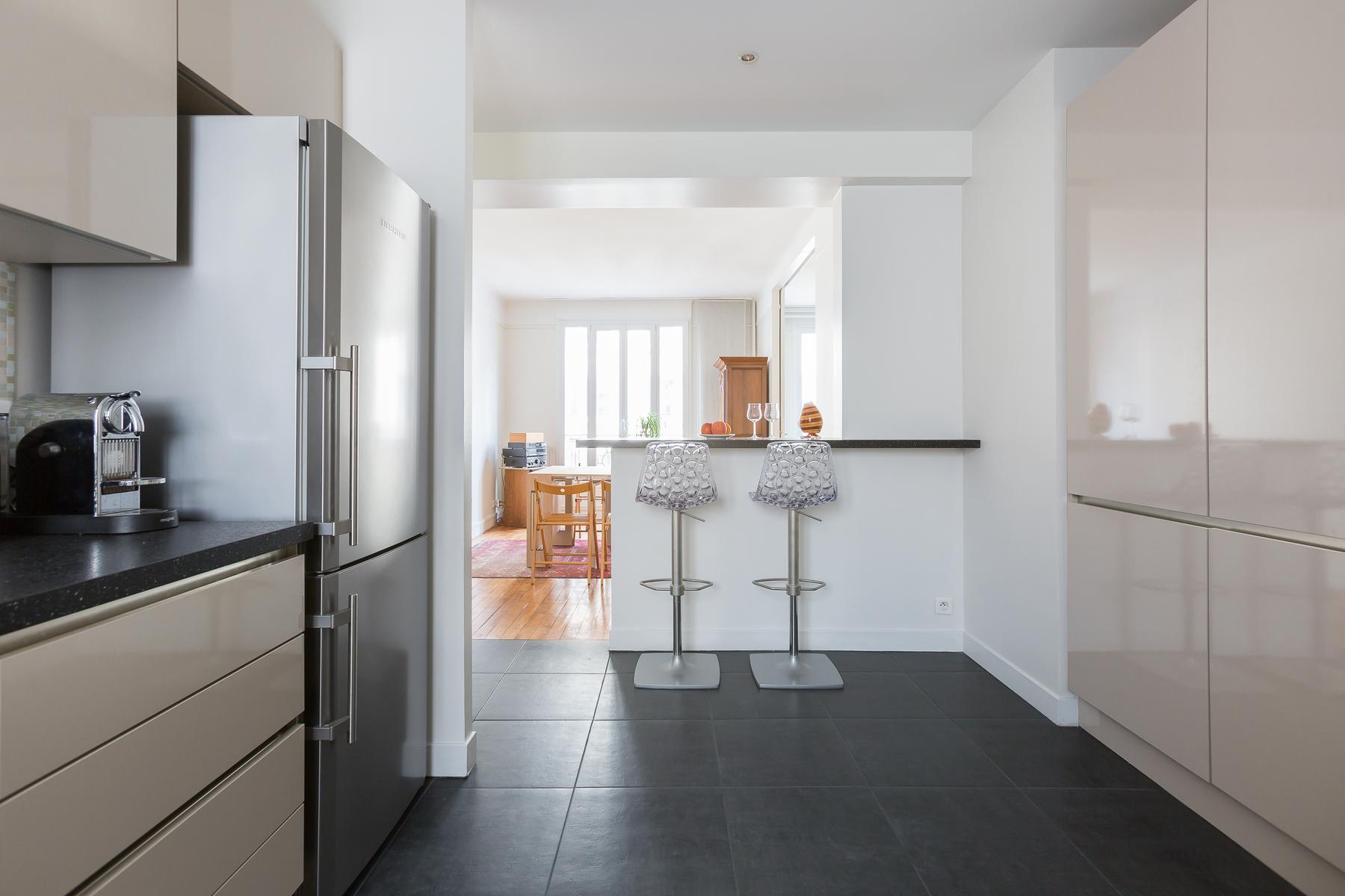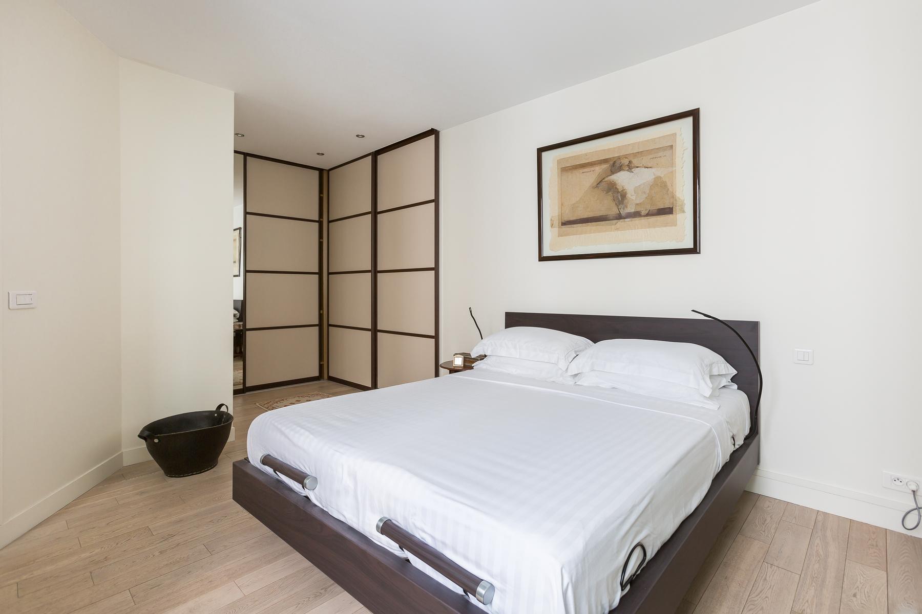 La rue des Fossés Saint-Marcel a tout le style décontracté du Quartier Latin. Vous entrez dans un couloir qui mène à la salle de bains et à la cuisine (décorée dans des couleurs subtiles, avec un bar à petit-déjeuner coiffé de granit). Cette pièce jouxte la salle à manger, où se trouve une table contemporaine aux lignes épurées, composée de quatre chaises. De là, une autre porte ouverte mène au salon de cette maison. Cette chambre est tranquille, son sol en bois est recouvert d’un tapis à motifs. Il dispose d’un canapé-lit, d’un fauteuil bordeaux et, en face d’eux, d’un téléviseur à écran plat.
