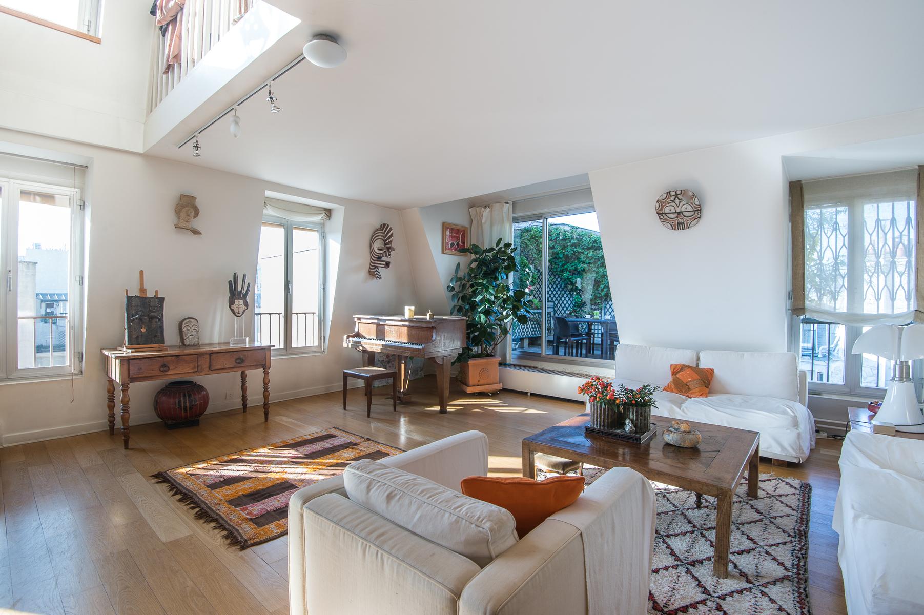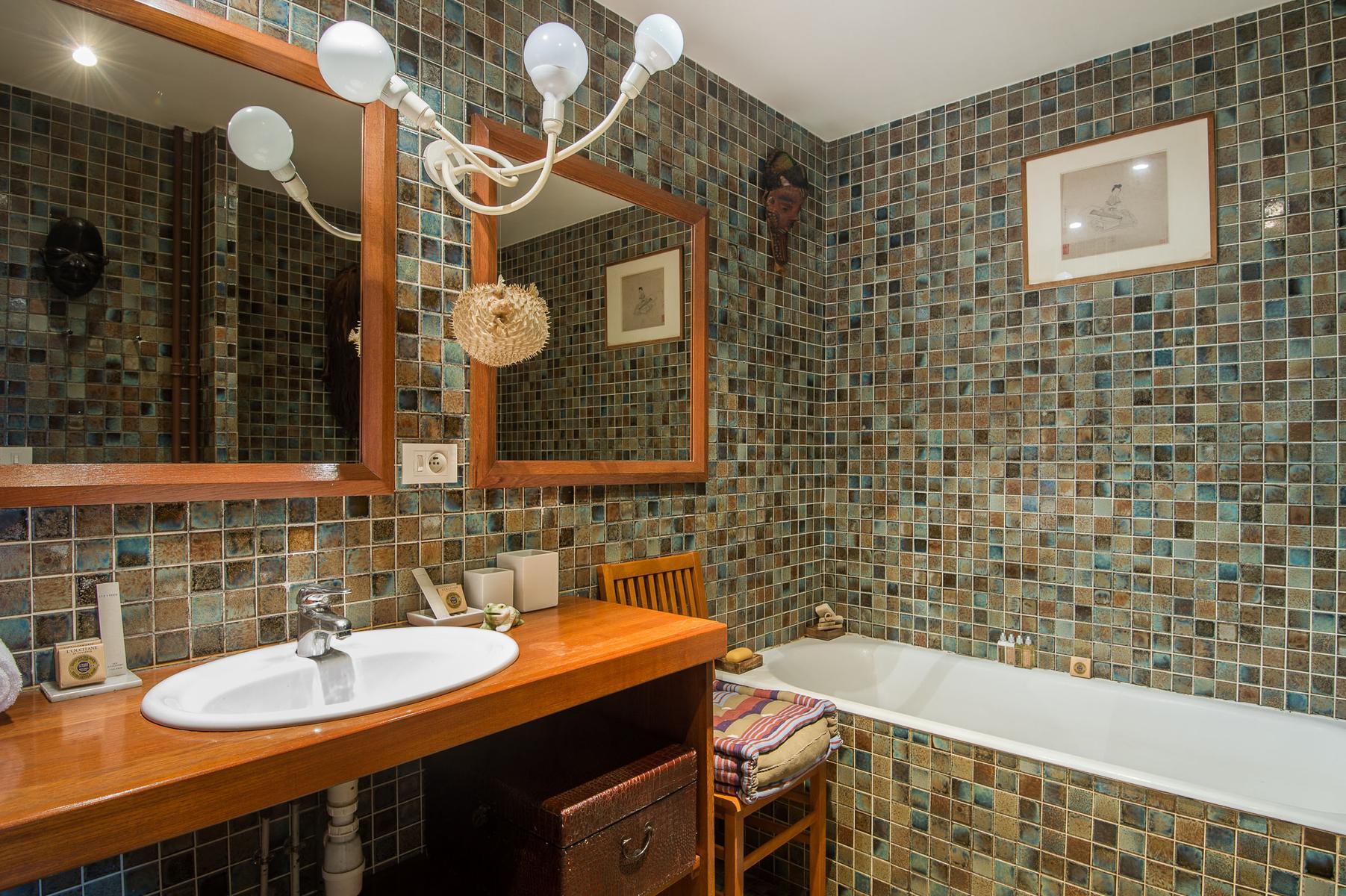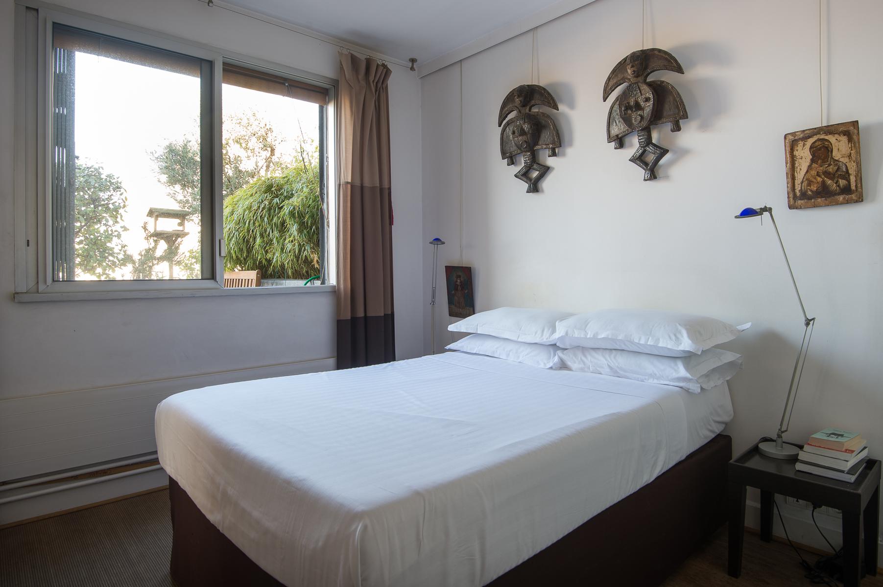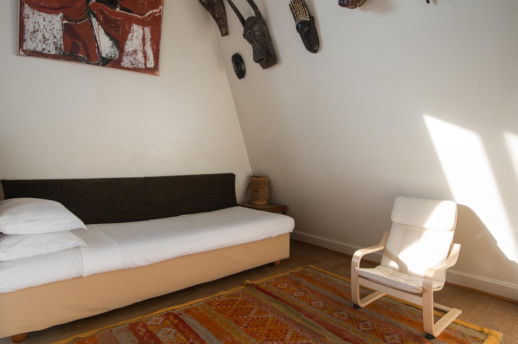 La rue des Haudriettes est un appartement de deux chambres, deux salles de bains au Marais. Les pièces peintes en blanc de cette maison sont meublées avec des pièces discrètes, mais avec des accessoires et des œuvres d’art exotiques – les figures sculptées de la chambre à coucher principale sont particulièrement frappantes. De plus, il y a une terrasse (avec vue sur le toit) à chaque étage. Les nombreux commerces, cafés et bars du Marais sont tous à proximité, et vous êtes également à proximité de la plus ancienne place de la ville, la place des Vosges. Le Centre Pompidou et le Musée Picasso sont également à quelques minutes à pied, et la station de métro Rambuteau n’est qu’à six minutes de marche.