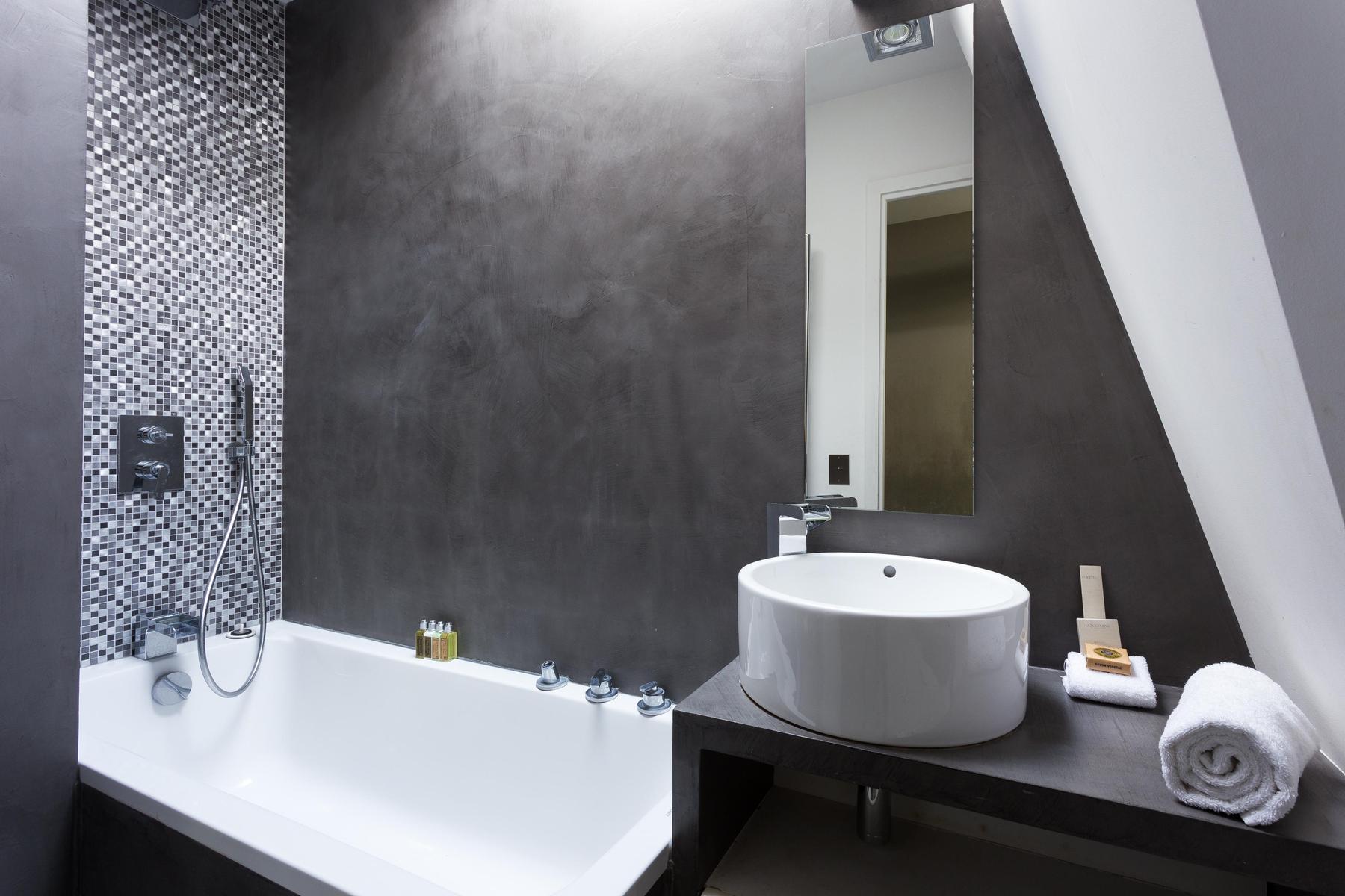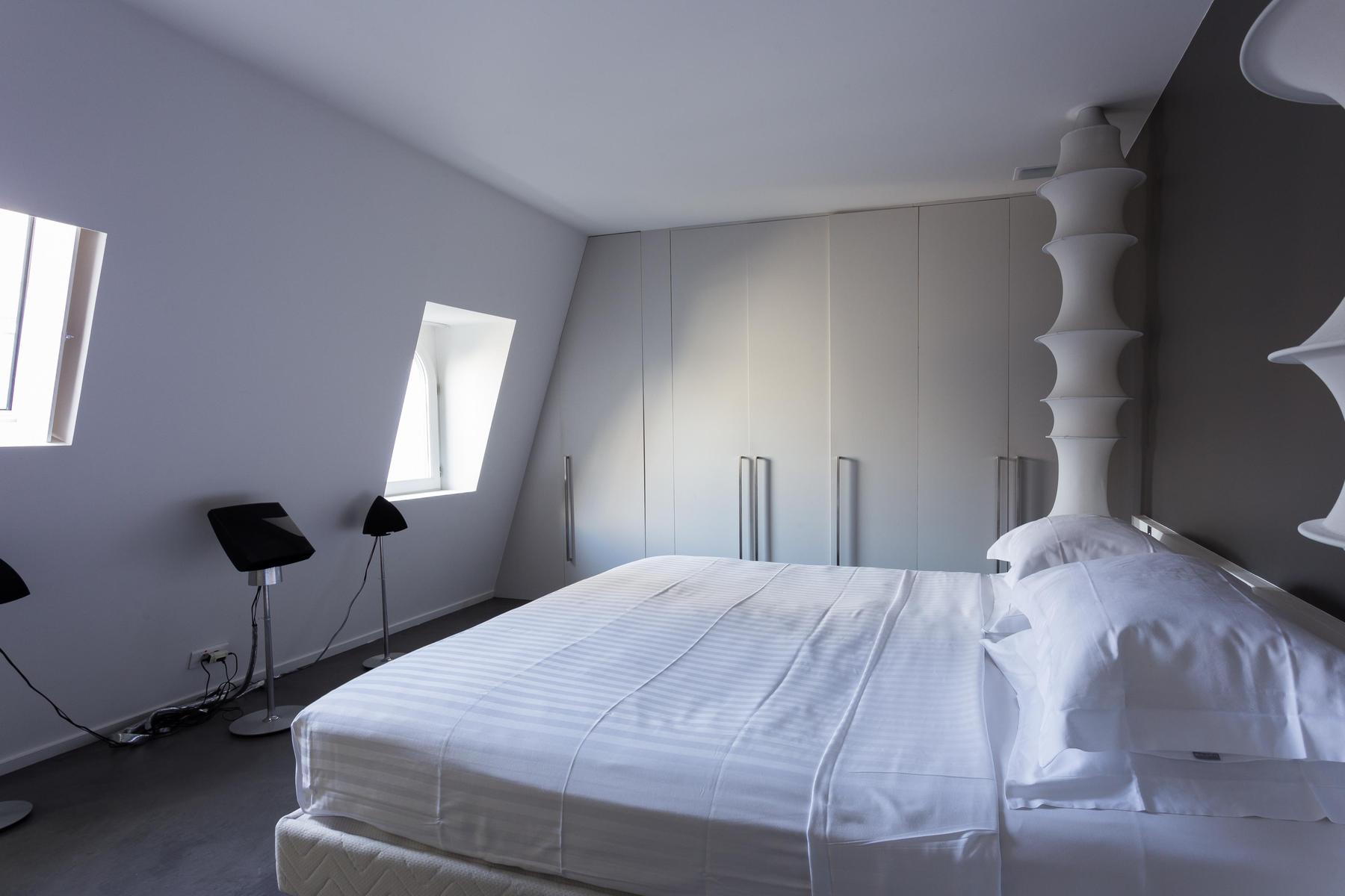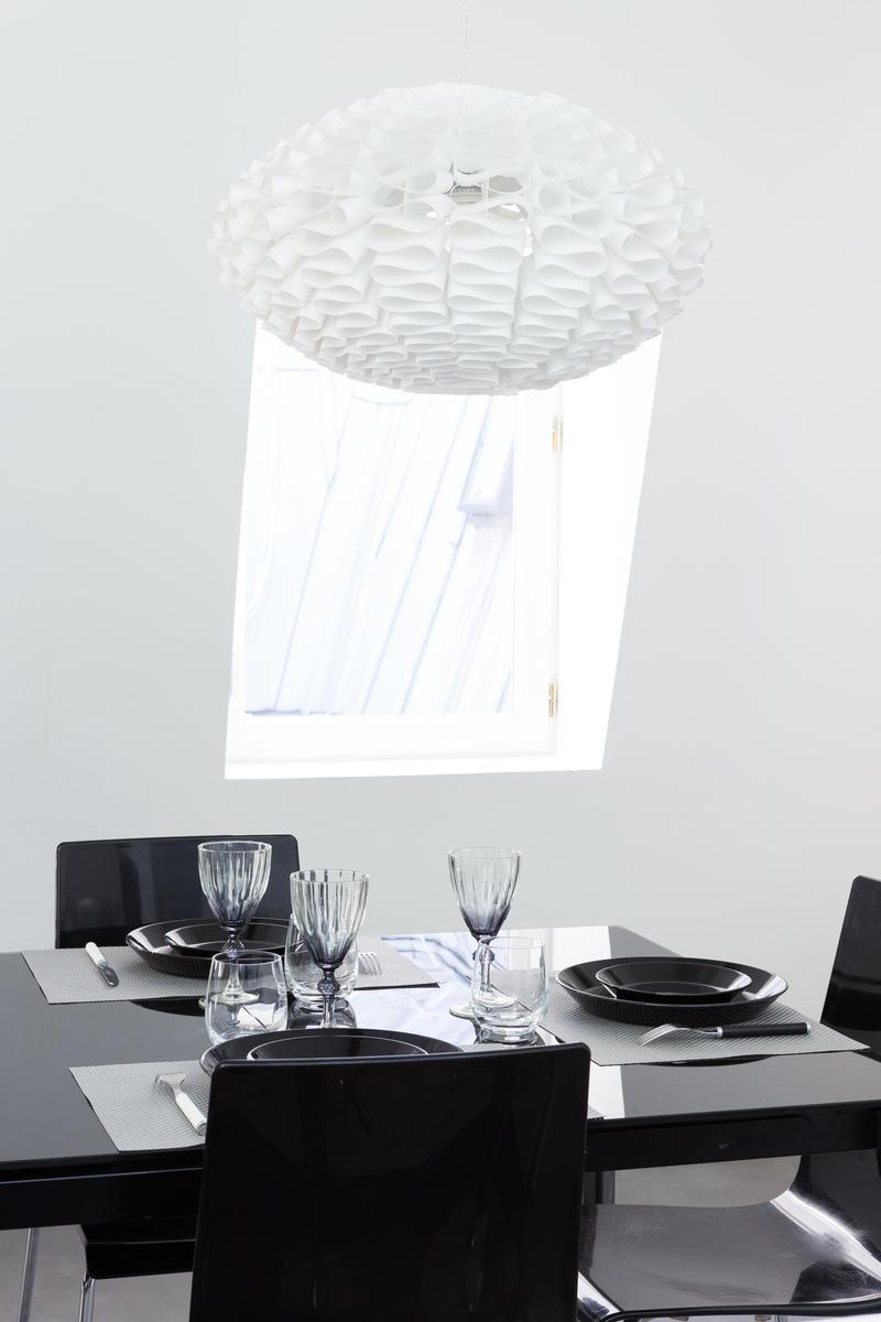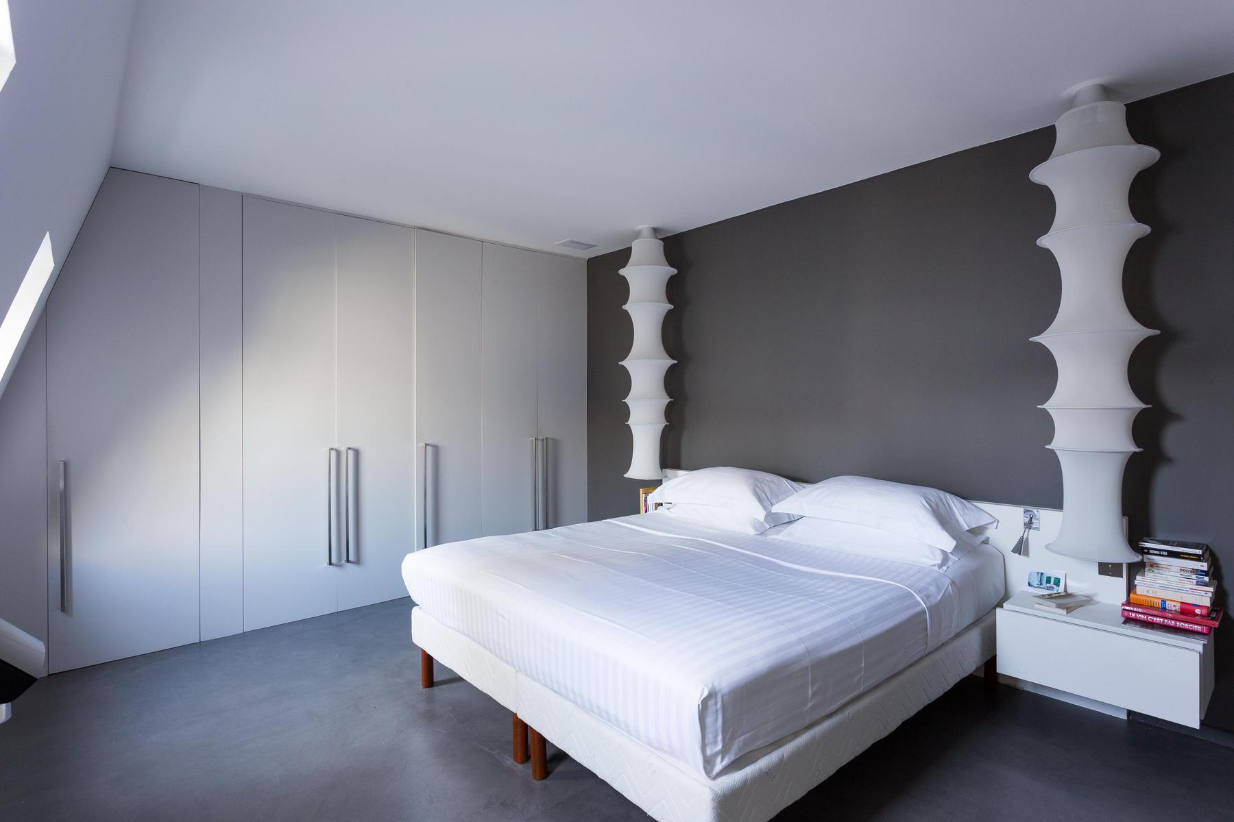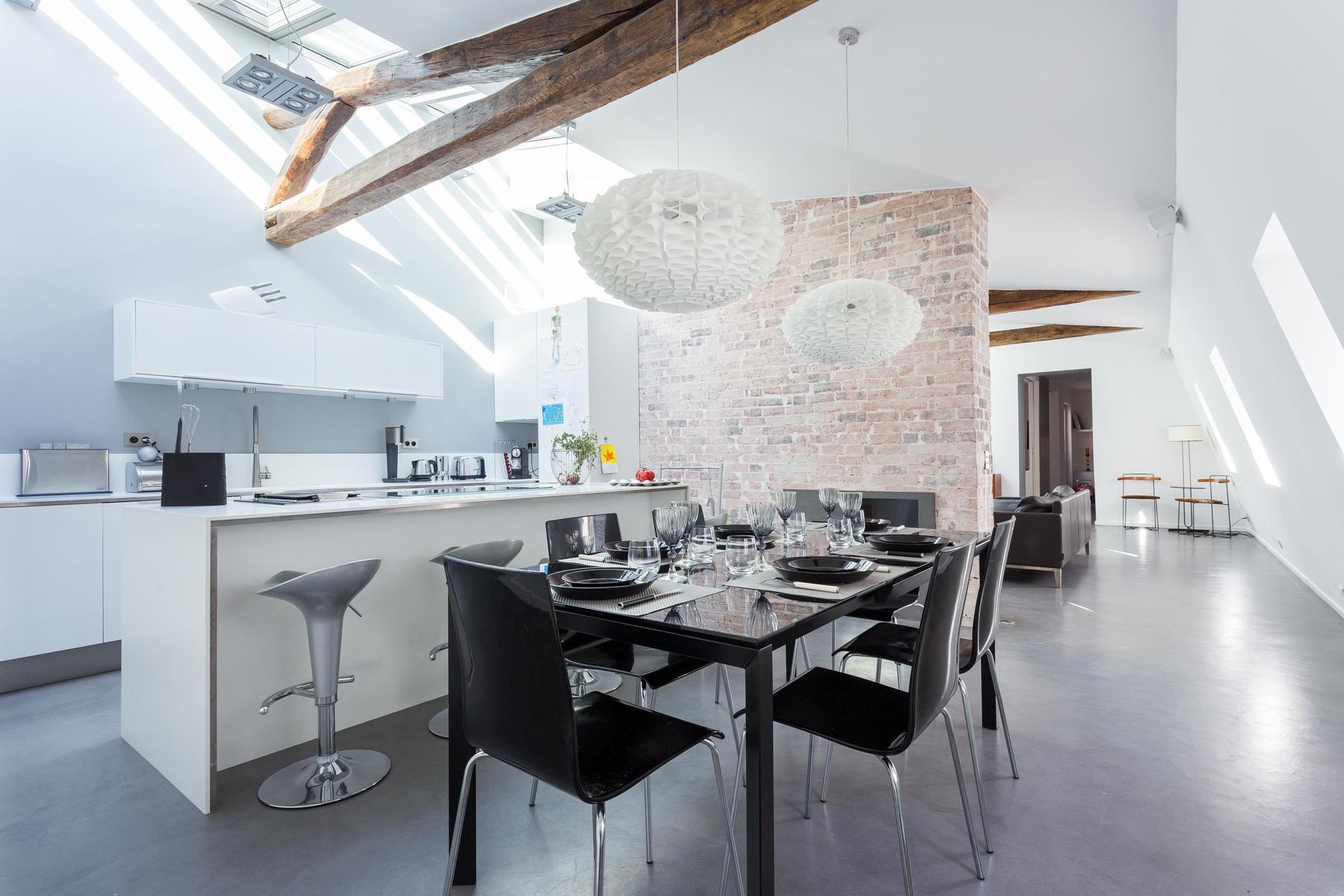 Dans cette maison audacieuse, les anciens chevrons soutiennent des puits de lumière en acier et la brique apparente se mêle aux murs blancs et aux armoires tranchantes. Des angles intéressants et une technologie de pointe composent la forme audacieuse de la rue des Jeûneurs, tandis que des lampes en forme et des œuvres d’art réfléchies ajoutent du caractère. Les pièces aérées peuvent sembler tranquilles, mais vous êtes étonnamment bien placé pour les endroits les plus animés de Paris. Le Louvre est à distance de marche, et le Jardin du Palais Royal et les Folies Bergères sont encore plus proches.