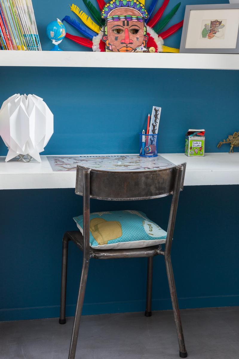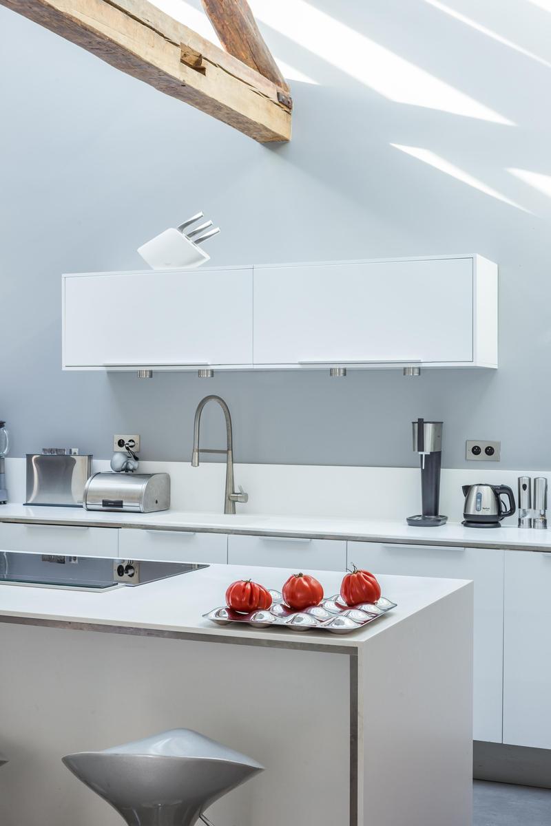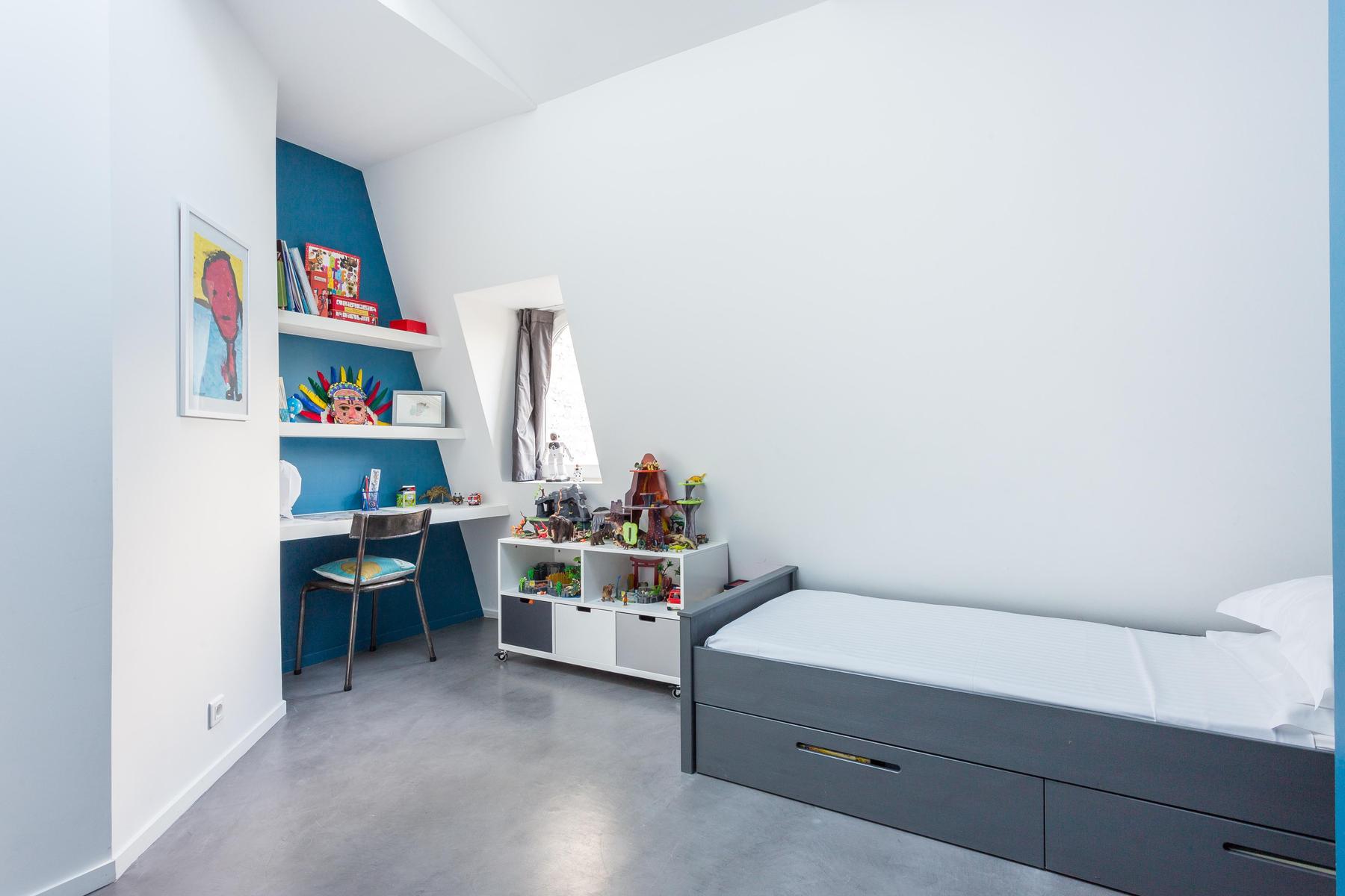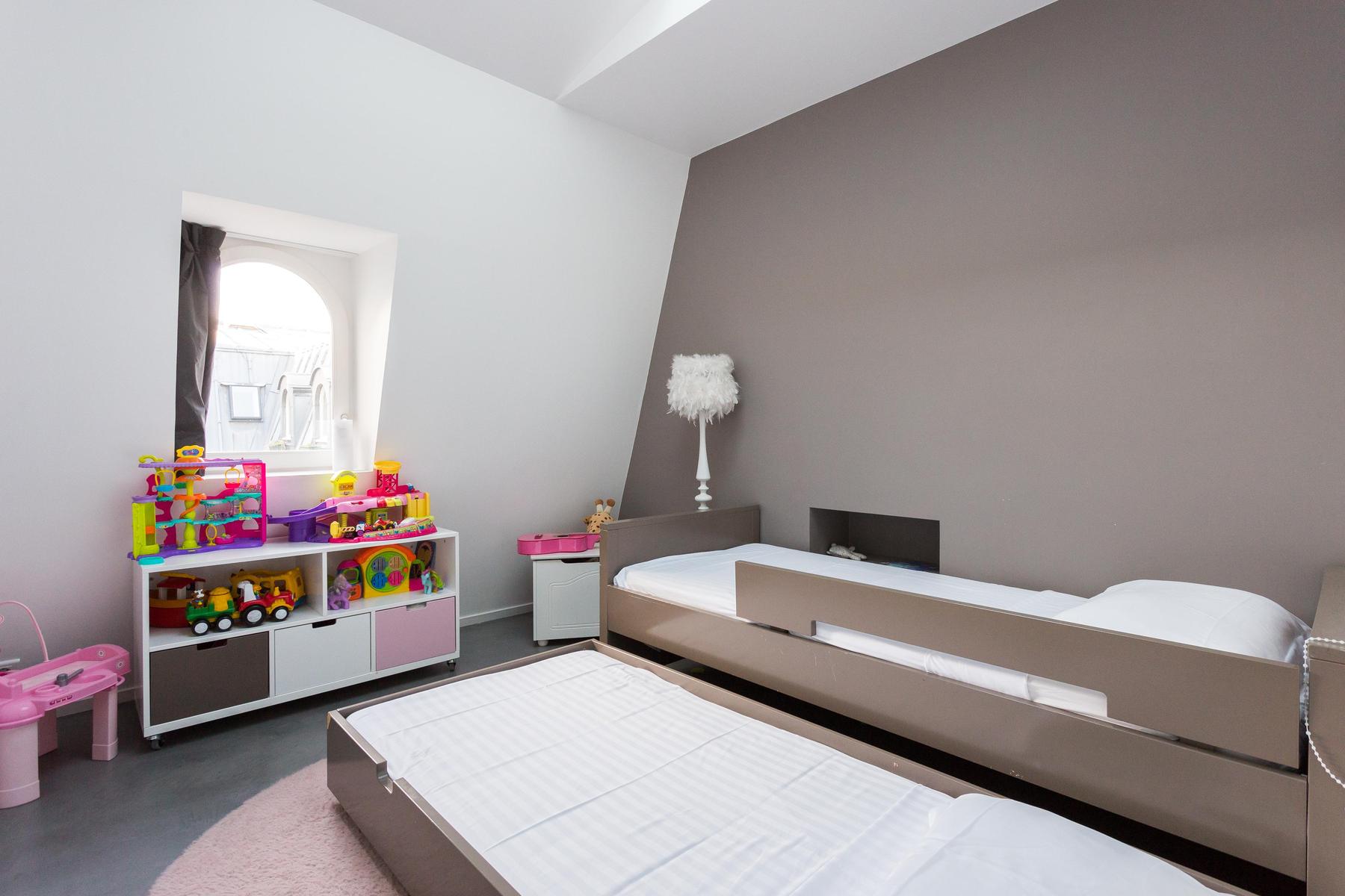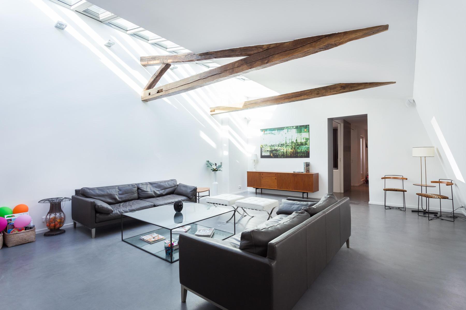 Un mélange harmonieux d’ancien et de neuf, cette maison remplit tout le cinquième étage et surplombe une cour tranquille. Chaque pièce est reliée au système de sonorisation à la fine pointe de la technologie – de la chambre des maîtres à la salle de bain atmosphérique. L’éclairage est également innovant. Vous trouverez des lustres contemporains suspendus au-dessus de la table à manger et un éclairage de style industriel au milieu des poutres en bois de la cuisine. Une cheminée originale se trouve entre ici et le salon, où le mobilier est épuré et propre. Mais les chambres des enfants sont plus colorées que cool et sont remplies de jouets et de livres.